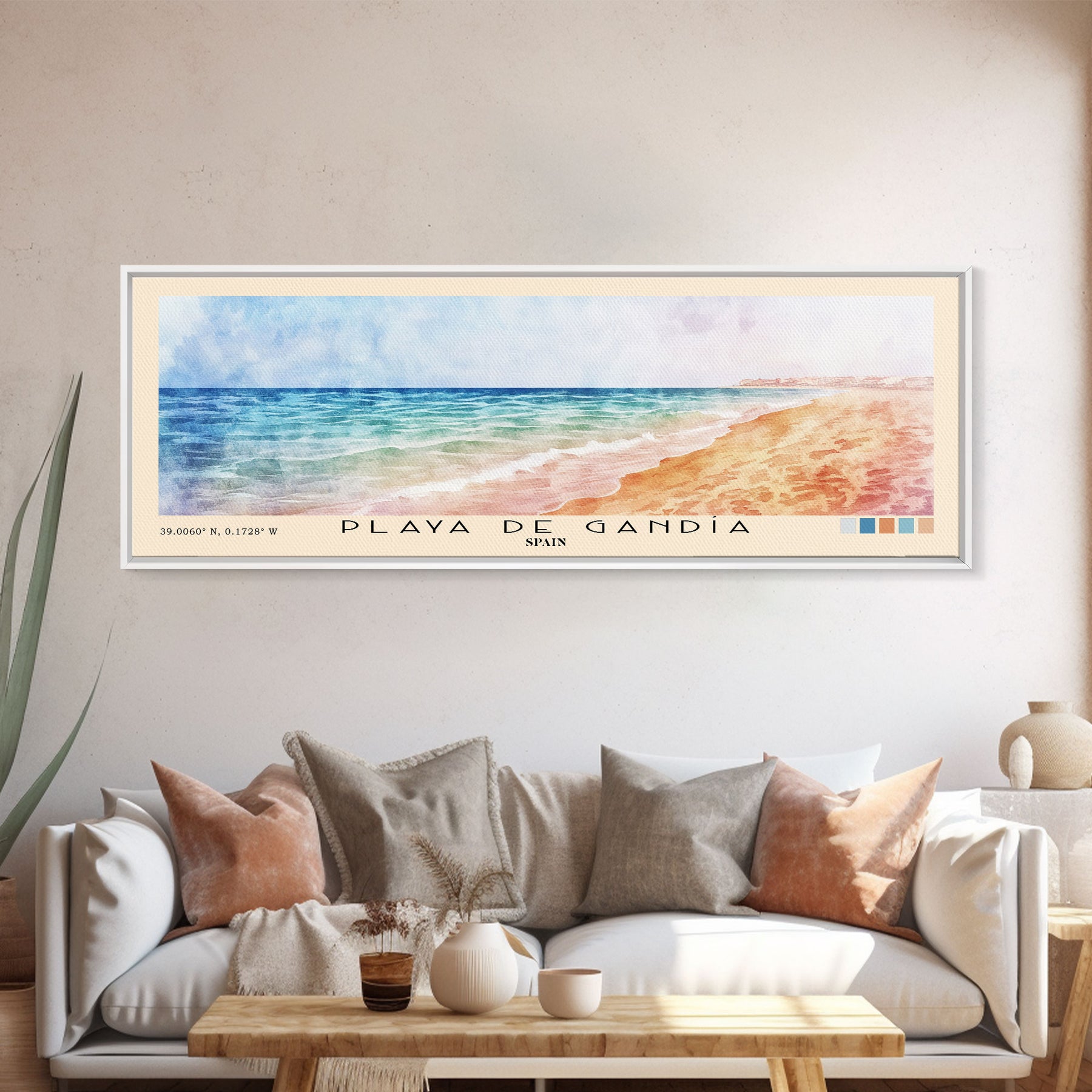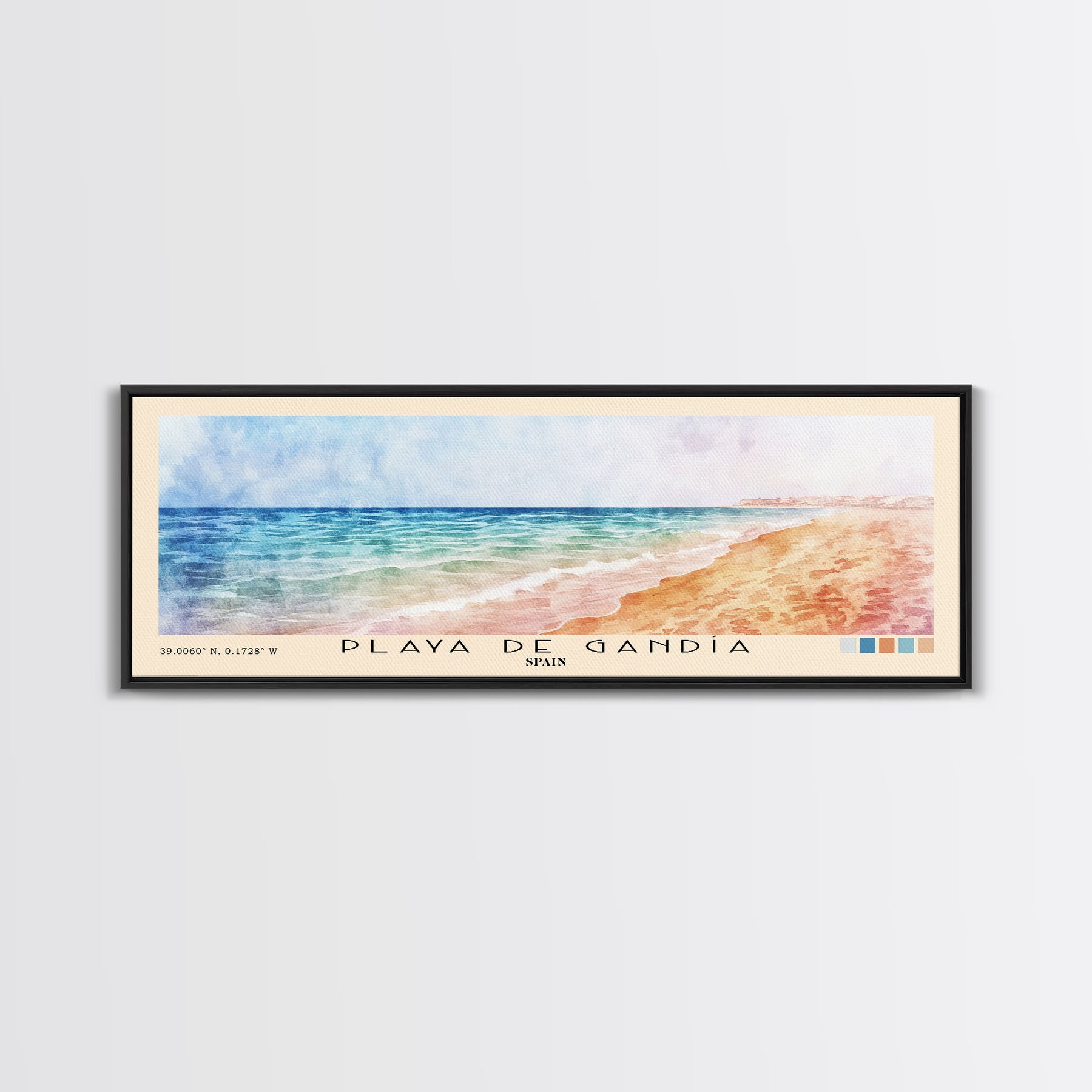 Playa de Gandía, Spain Watercolor Beach Print, Vacation Gift, Spain Wall Art, Framed Canvas Print, Framed Beach Painting