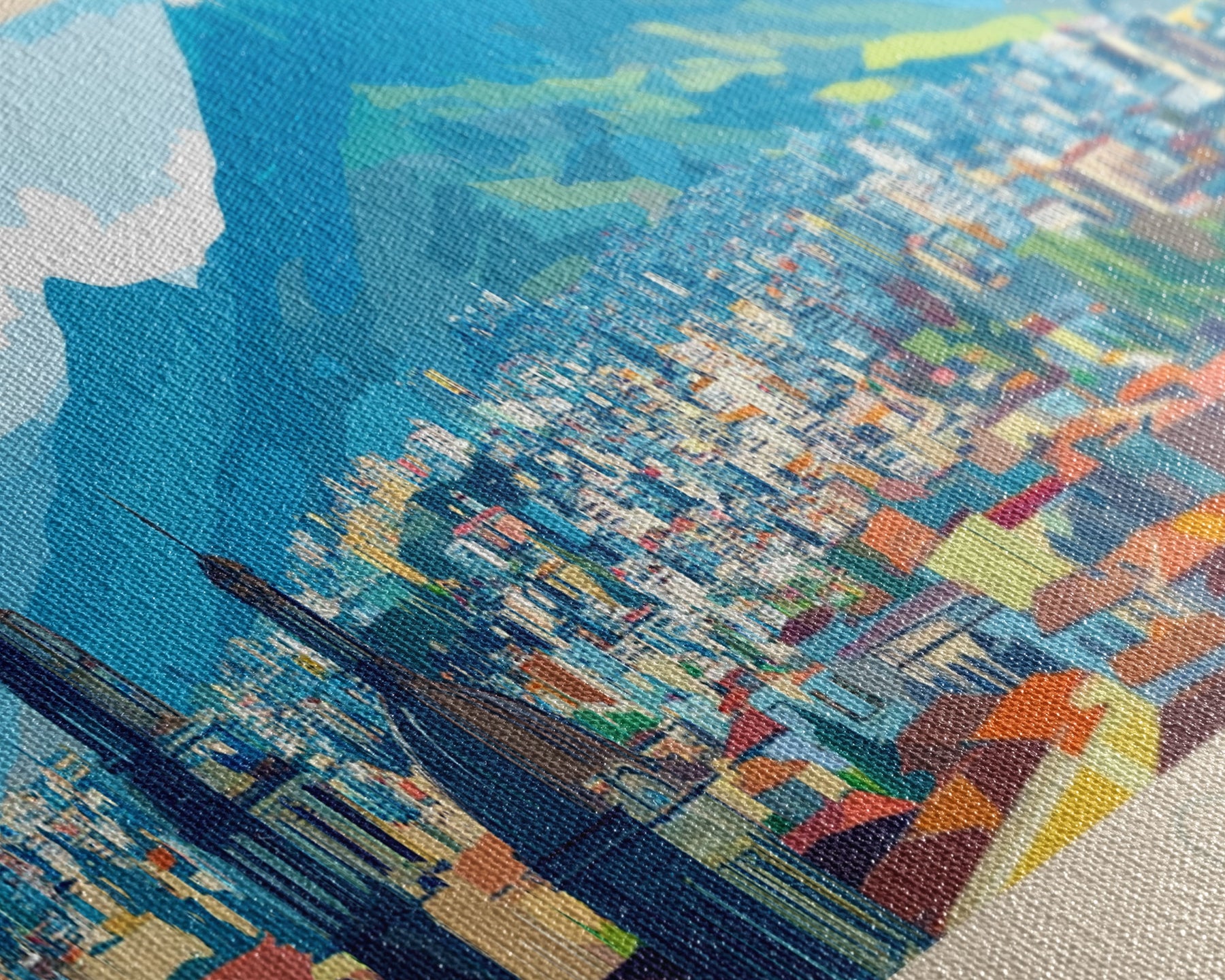 Most of our canvases are made in the USA, with the exception of canvases ordered with the light oak unstained frames, and any large canvases (24x48, 30x60, 16x48 and 20x60) ordered WITH a frame. These are temporarily made in and shipped from Europe, while we try to find a more consistent supplier in the USA.
