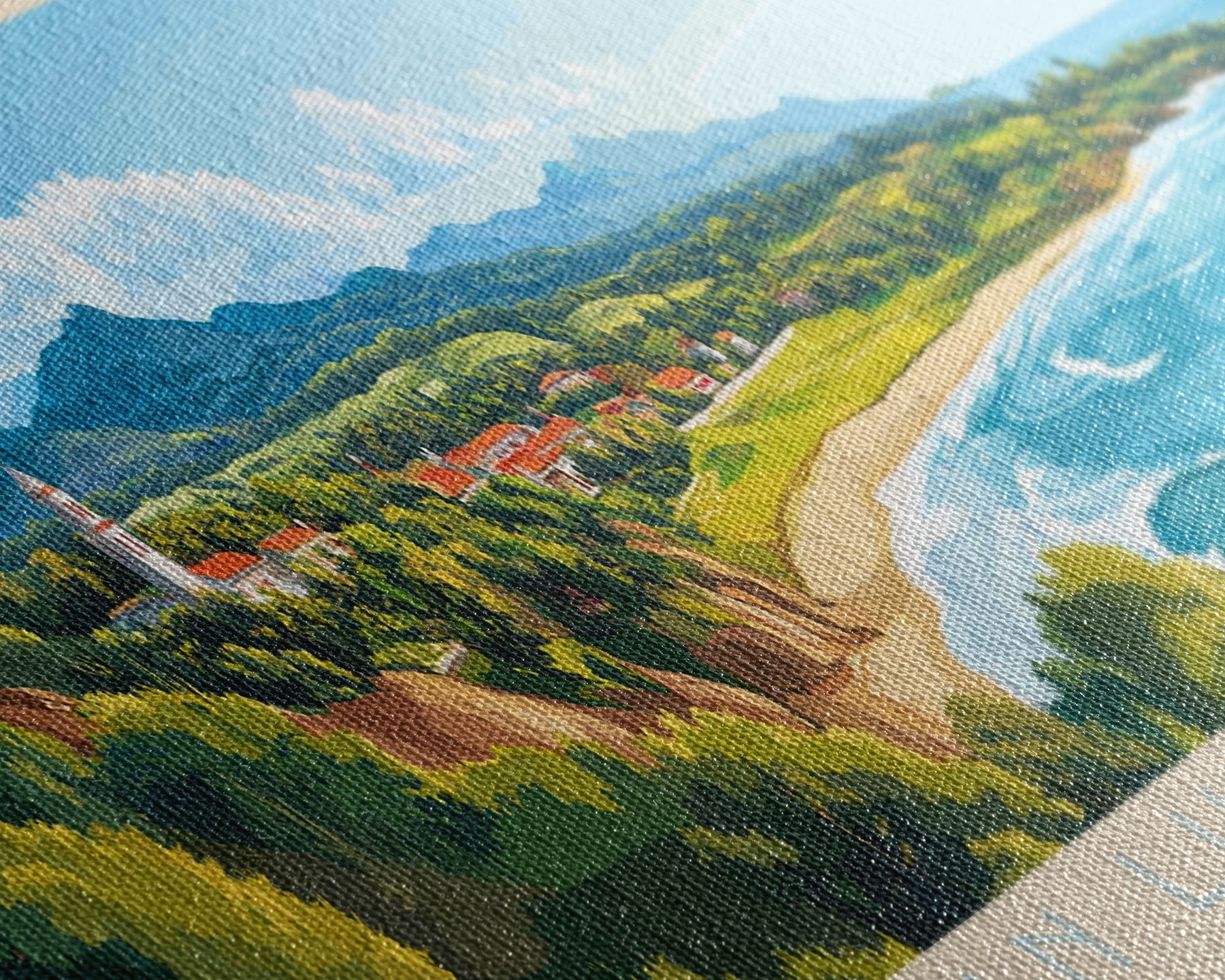 Most of our canvases are made in the USA, with the exception of canvases ordered with the light oak unstained frames, and any large canvases (24x48, 30x60, 16x48 and 20x60) ordered WITH a frame. These are temporarily made in and shipped from Europe, while we try to find a more consistent supplier in the USA.