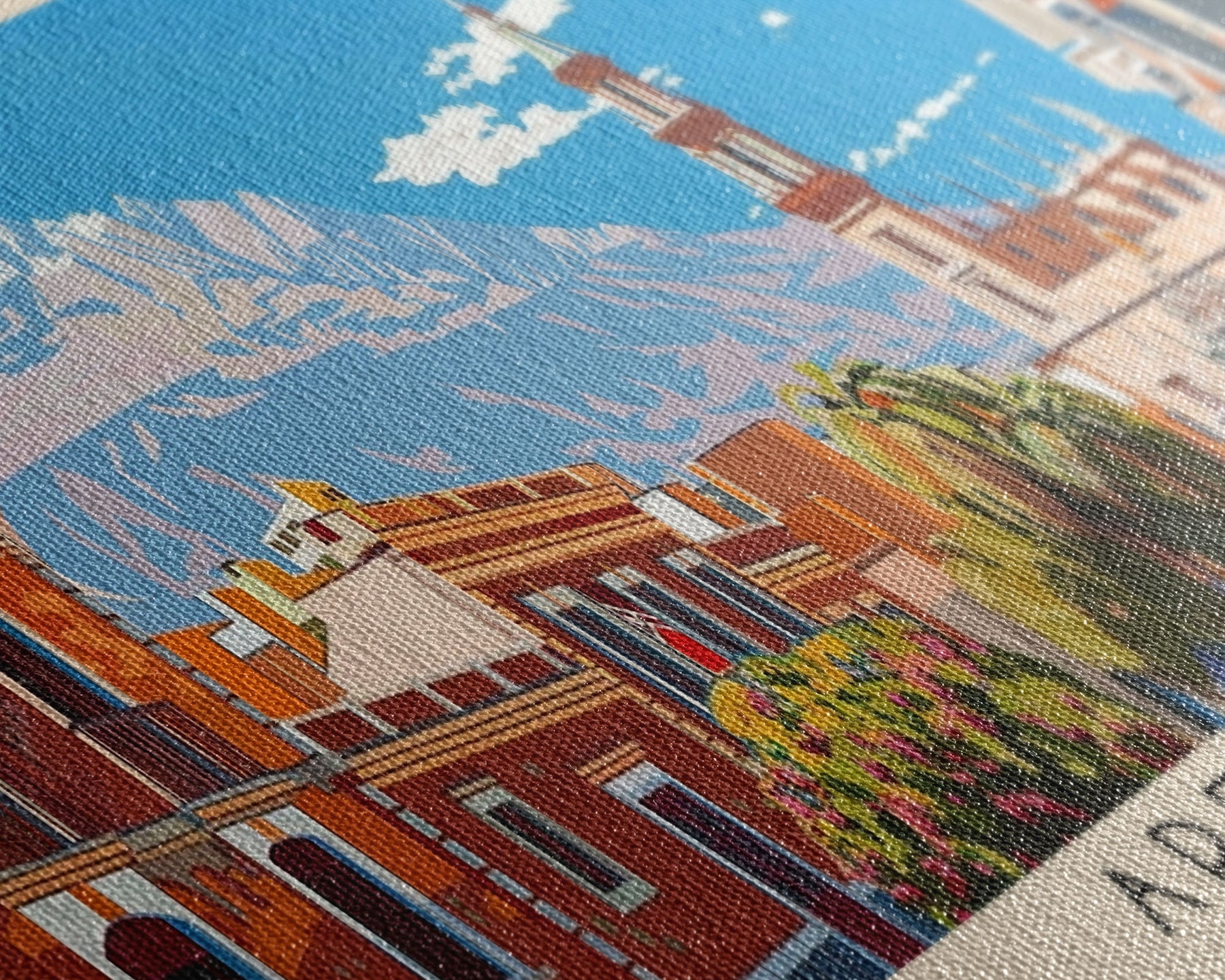 Most of our canvases are made in the USA, with the exception of canvases ordered with the light oak unstained frames, and any large canvases (24x48, 30x60, 16x48 and 20x60) ordered WITH a frame. These are temporarily made in and shipped from Europe, while we try to find a more consistent supplier in the USA.