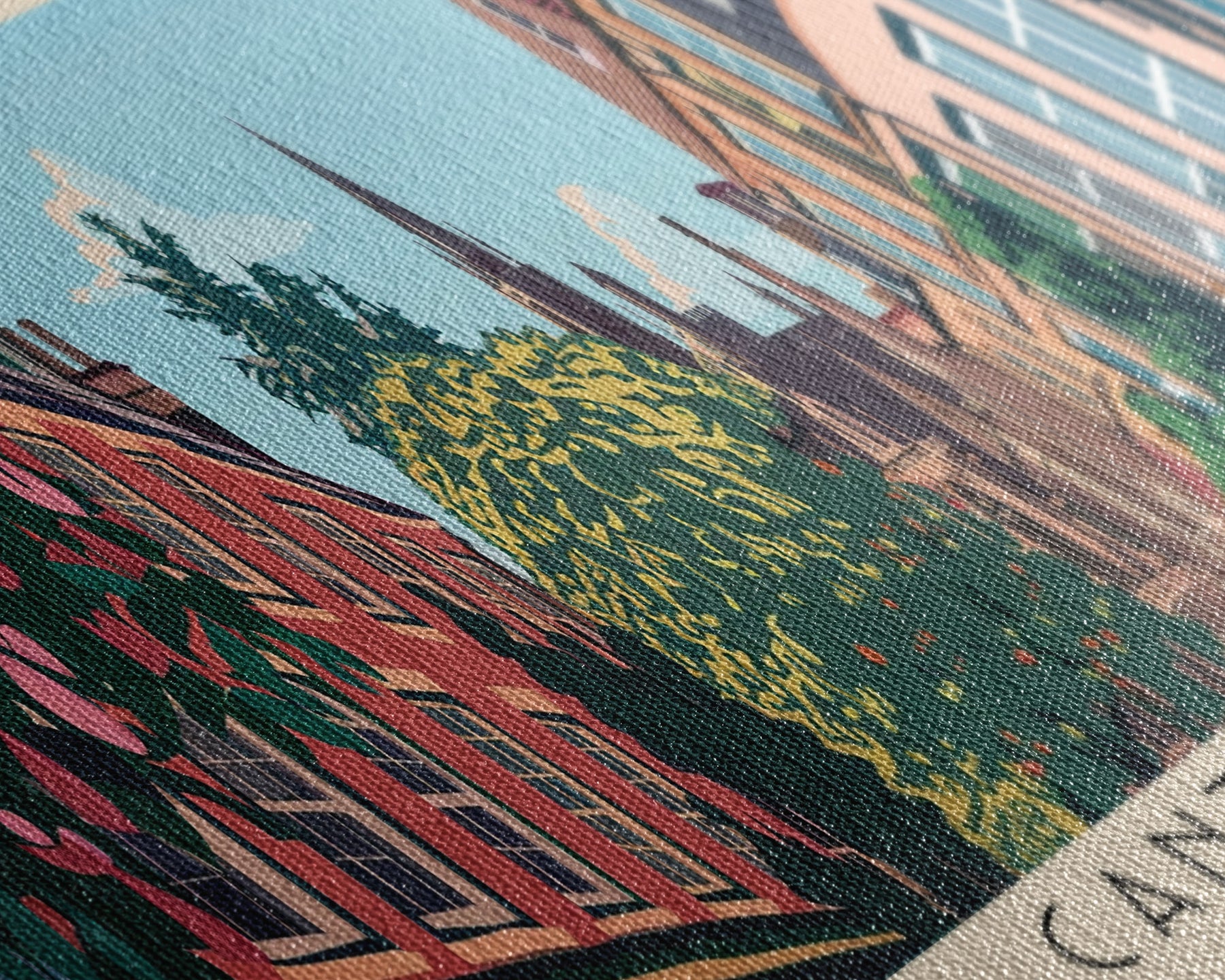 Most of our canvases are made in the USA, with the exception of canvases ordered with the light oak unstained frames, and any large canvases (24x48, 30x60, 16x48 and 20x60) ordered WITH a frame. These are temporarily made in and shipped from Europe, while we try to find a more consistent supplier in the USA.