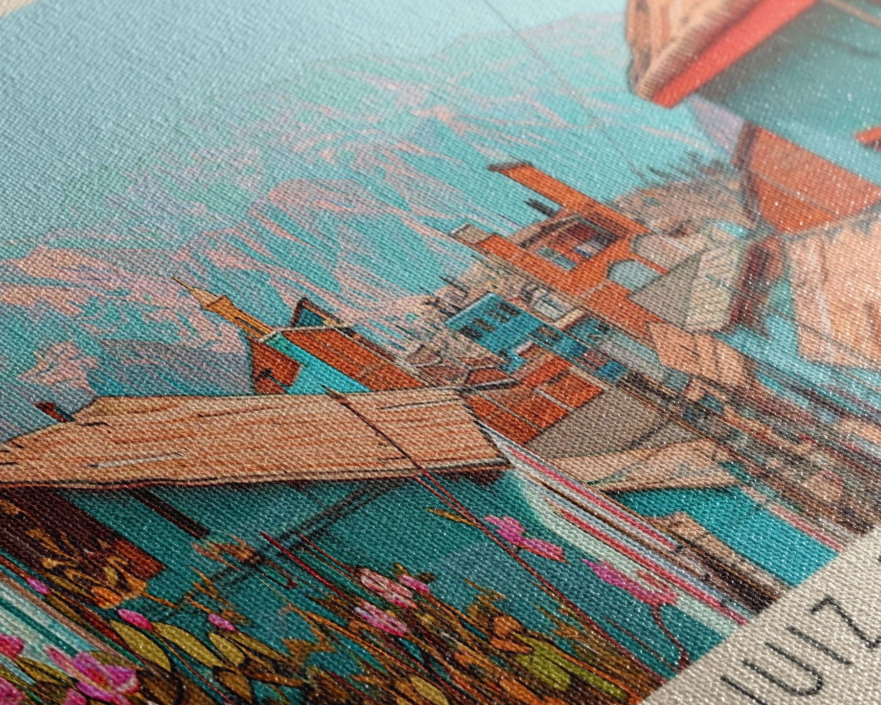 Most of our canvases are made in the USA, with the exception of canvases ordered with the light oak unstained frames, and any large canvases (24x48, 30x60, 16x48 and 20x60) ordered WITH a frame. These are temporarily made in and shipped from Europe, while we try to find a more consistent supplier in the USA.