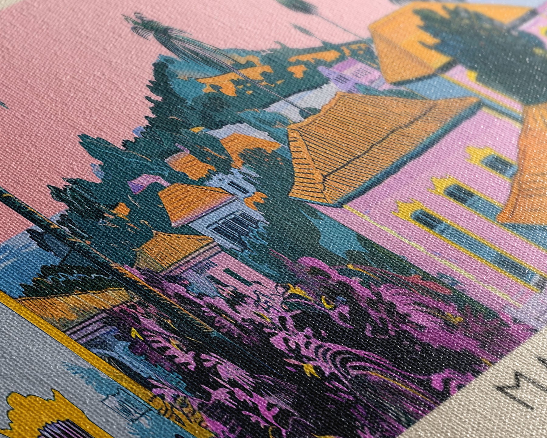 Most of our canvases are made in the USA, with the exception of canvases ordered with the light oak unstained frames, and any large canvases (24x48, 30x60, 16x48 and 20x60) ordered WITH a frame. These are temporarily made in and shipped from Europe, while we try to find a more consistent supplier in the USA.