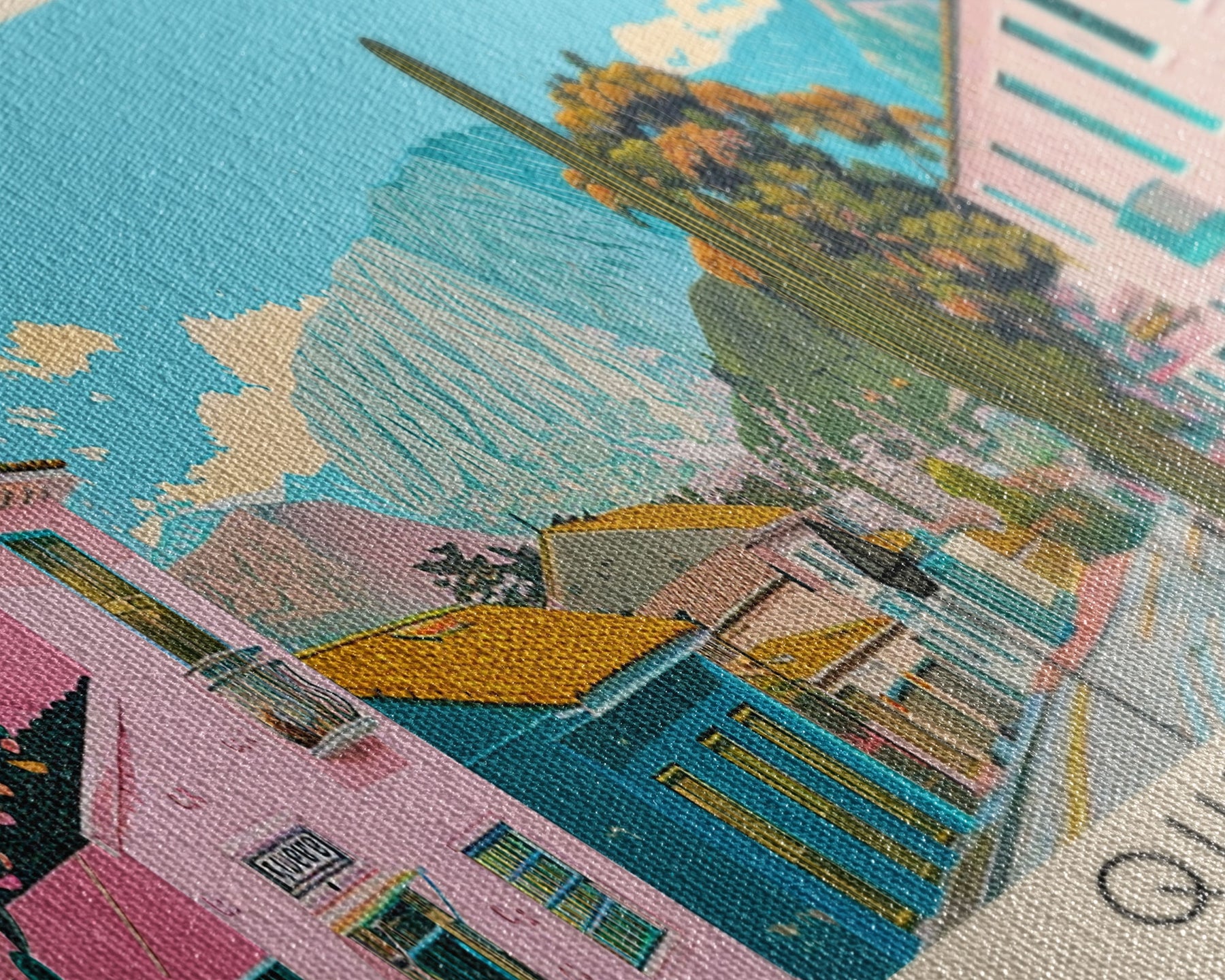 Most of our canvases are made in the USA, with the exception of canvases ordered with the light oak unstained frames, and any large canvases (24x48, 30x60, 16x48 and 20x60) ordered WITH a frame. These are temporarily made in and shipped from Europe, while we try to find a more consistent supplier in the USA.