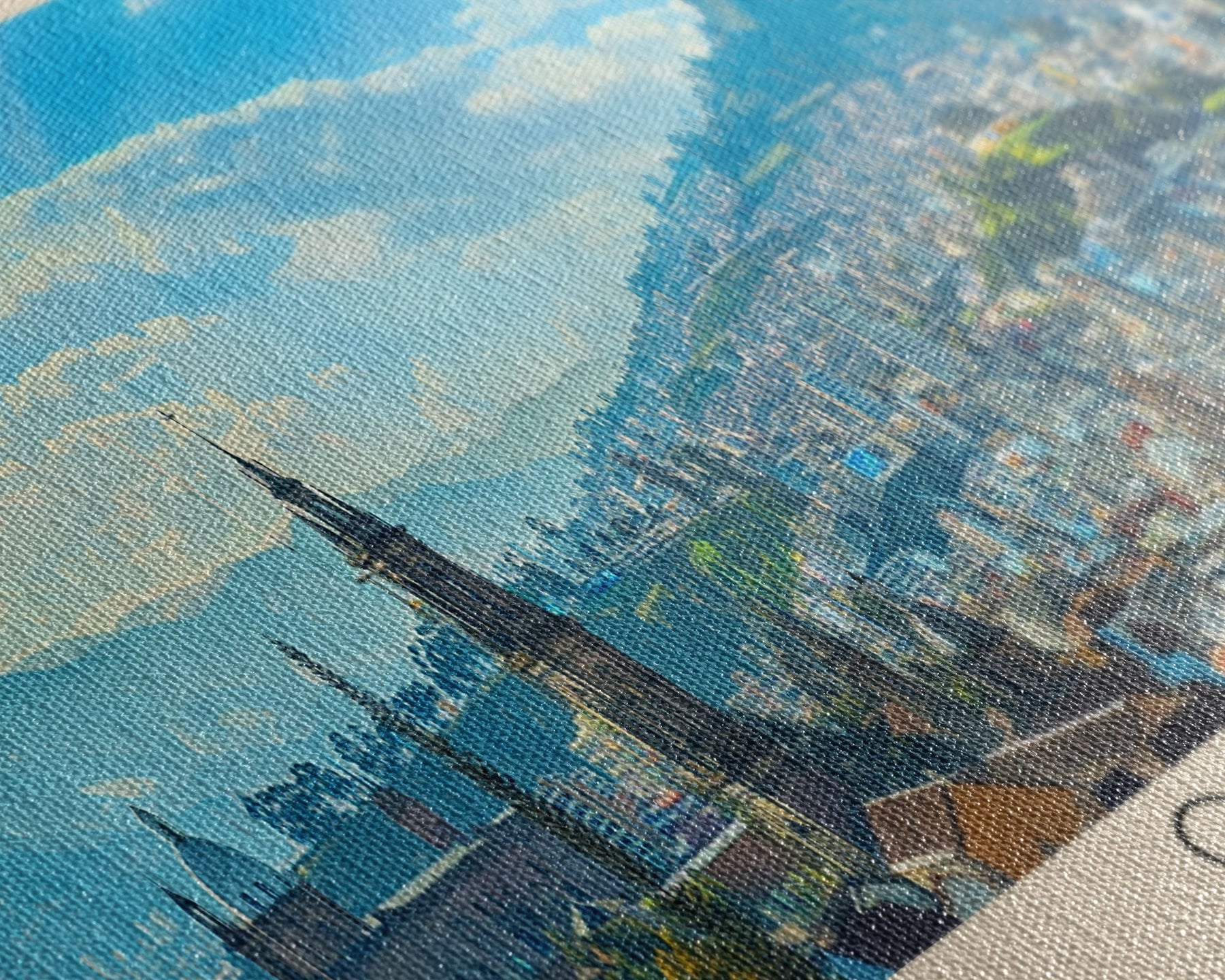 Most of our canvases are made in the USA, with the exception of canvases ordered with the light oak unstained frames, and any large canvases (24x48, 30x60, 16x48 and 20x60) ordered WITH a frame. These are temporarily made in and shipped from Europe, while we try to find a more consistent supplier in the USA.