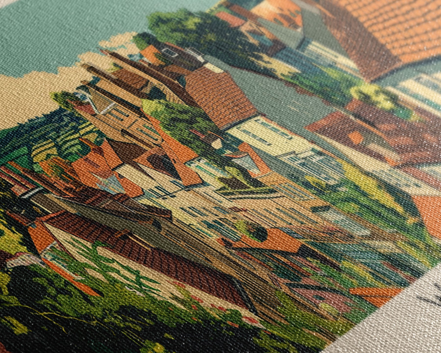 Most of our canvases are made in the USA, with the exception of canvases ordered with the light oak unstained frames, and any large canvases (24x48, 30x60, 16x48 and 20x60) ordered WITH a frame. These are temporarily made in and shipped from Europe, while we try to find a more consistent supplier in the USA.