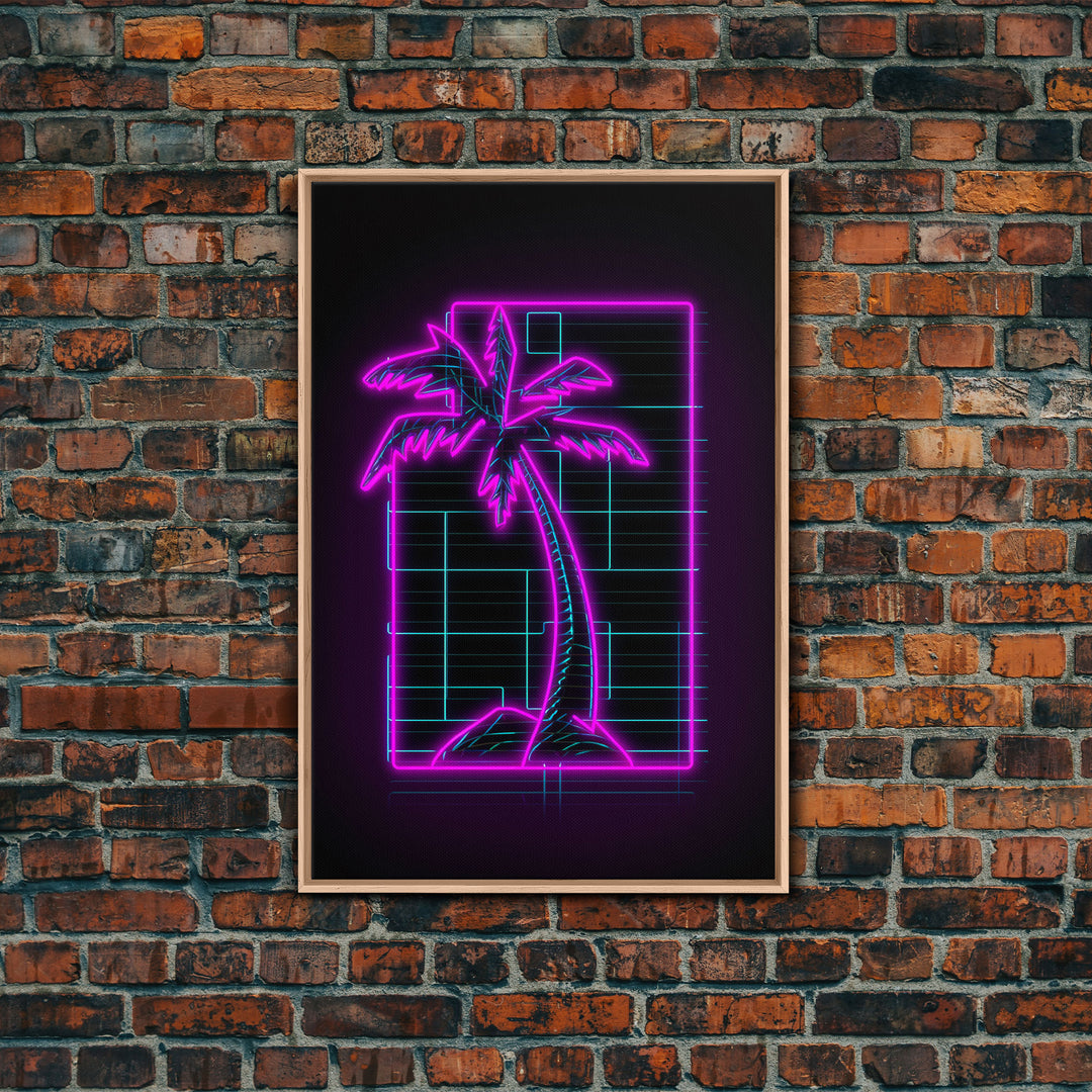 Retro Beach Vibes, Palm Trees at Sunset, Retrowave Landscape Art, Framed Canvas Print, Florida Art, California Art, Game Room Decor