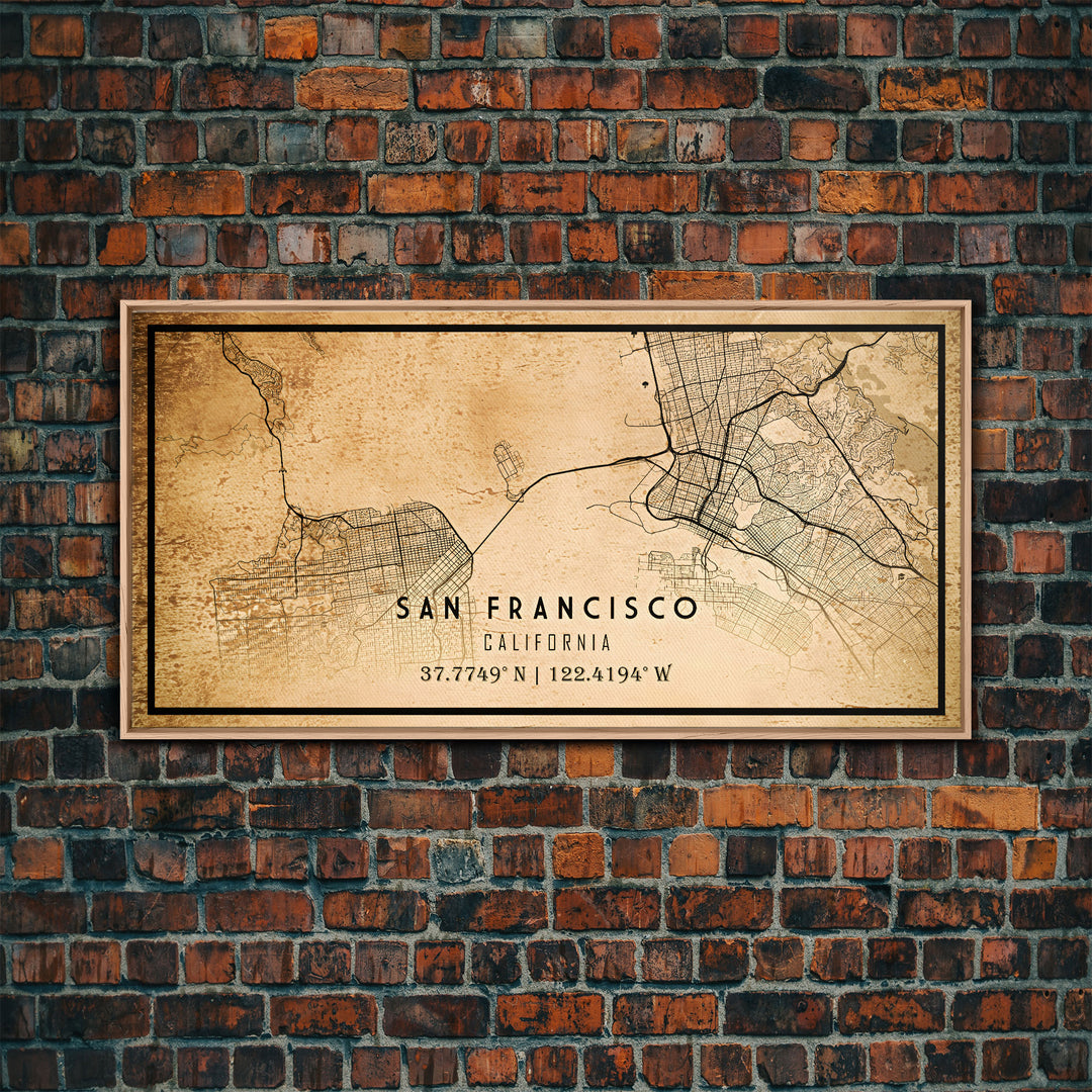 Old San Francisco City Map Wall Art Canvas Print, Vintage Style San Francisco Map, Framed Wall Art, Cool California Wall Art, Office Decor
