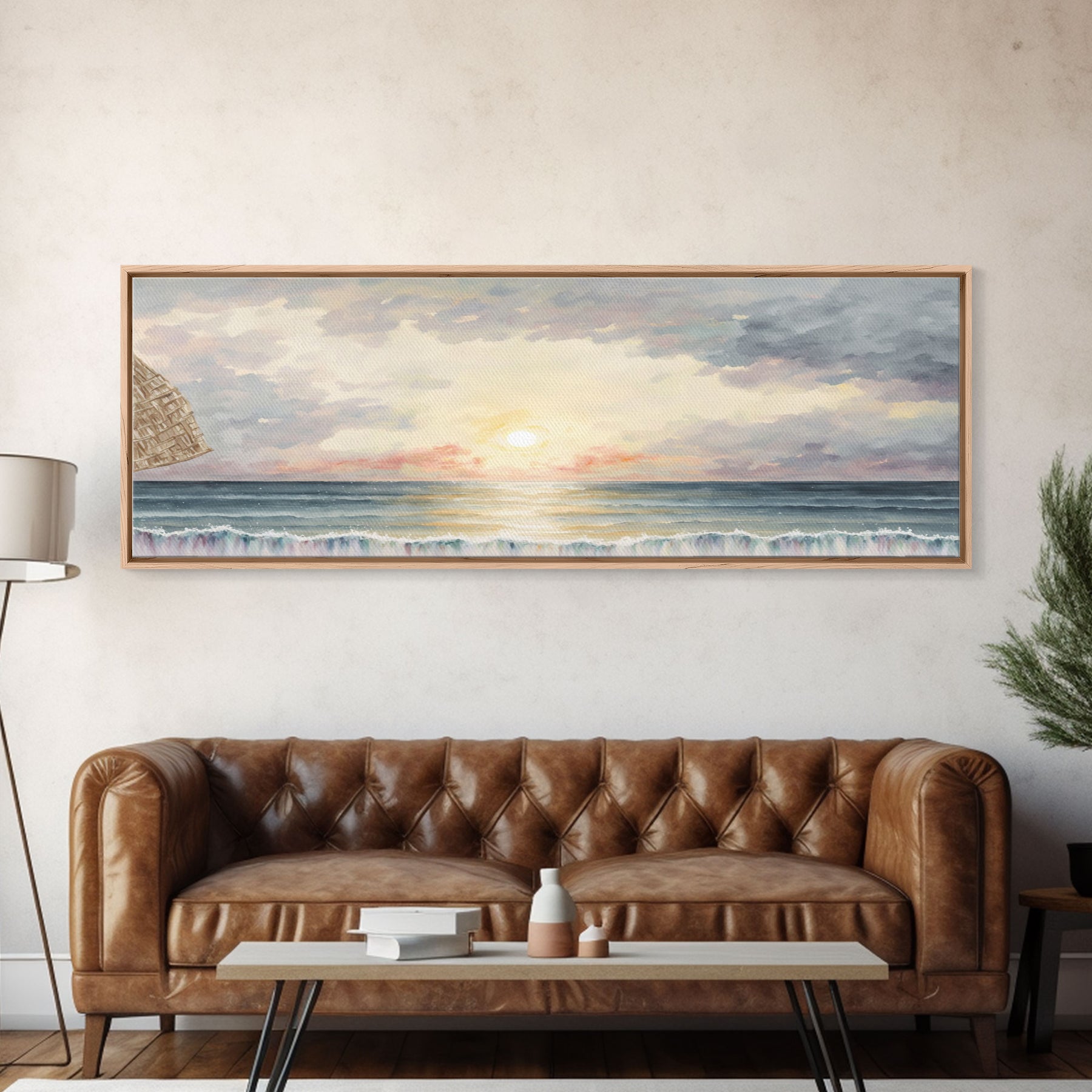 Whimsical Beach Art Watercolor, Framed Canvas Print, Panoramic Lakehouse Art, Light Pastels, Ultra Wide Format Above Bed Art