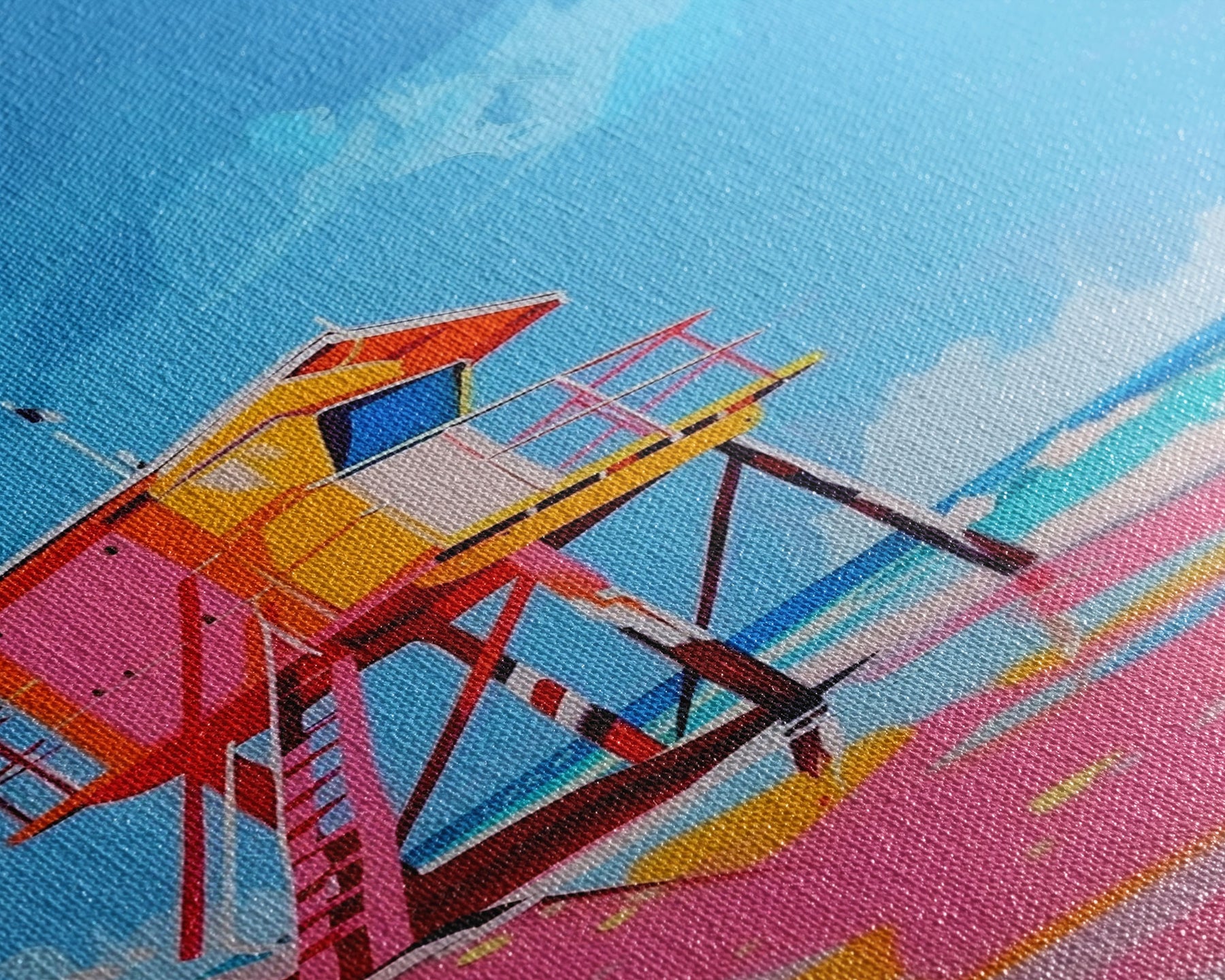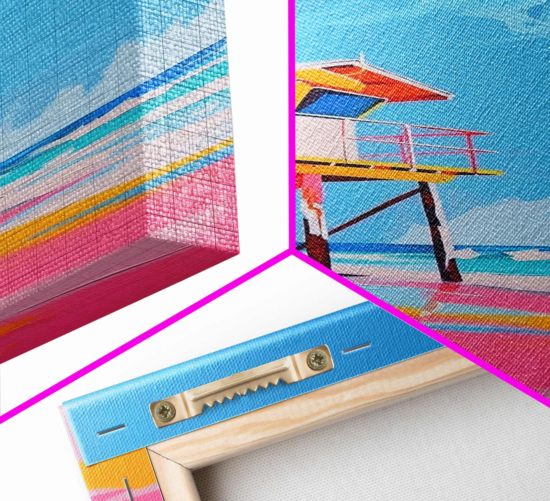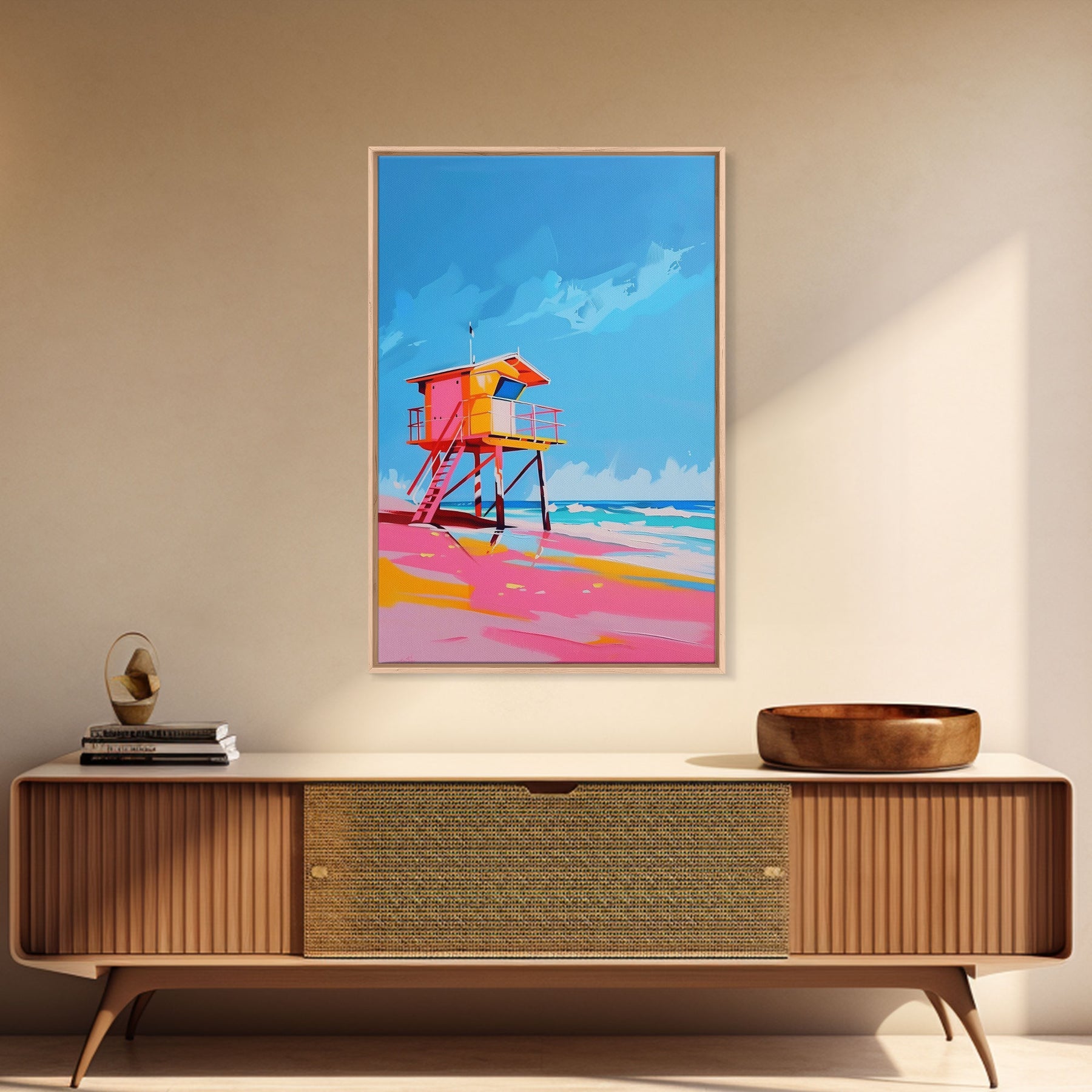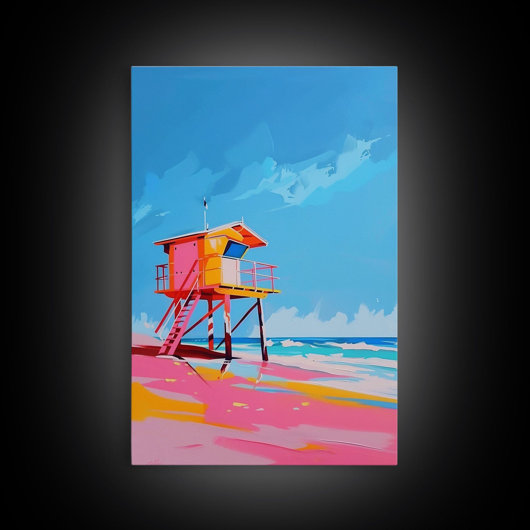 Colorful Lifeguard Tower on Sunny Beach - Framed Canvas Print, Beach House Decor, Coastal Art for Living Room or Office
