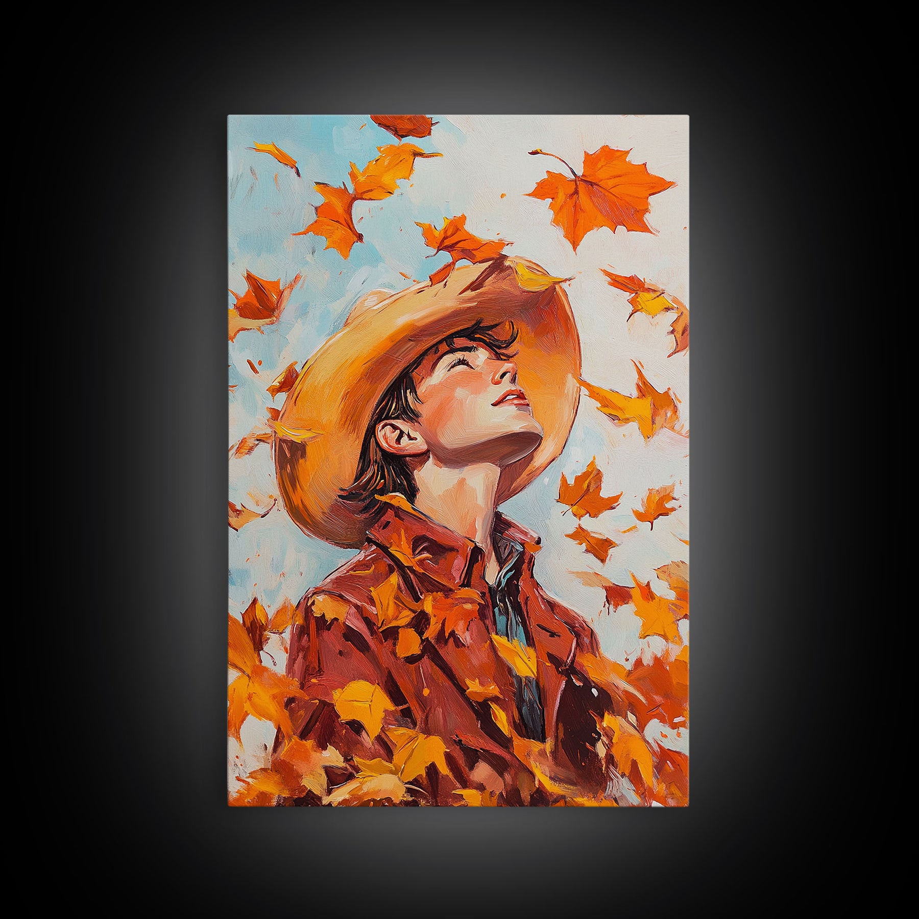 Cowboy Fall Decor Canvas Print with Windblown Leaves, Rustic Farmhouse Autumn Holiday Wall Art Seasonal Gift Idea 2024