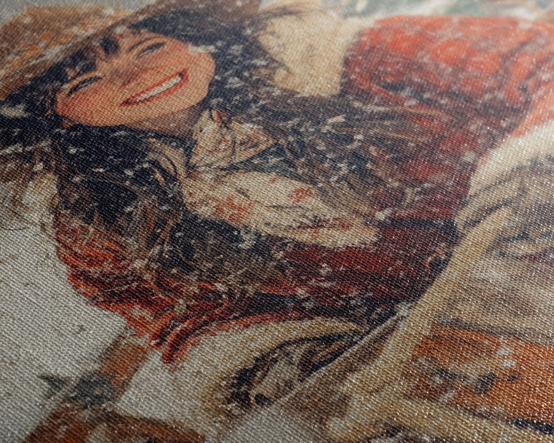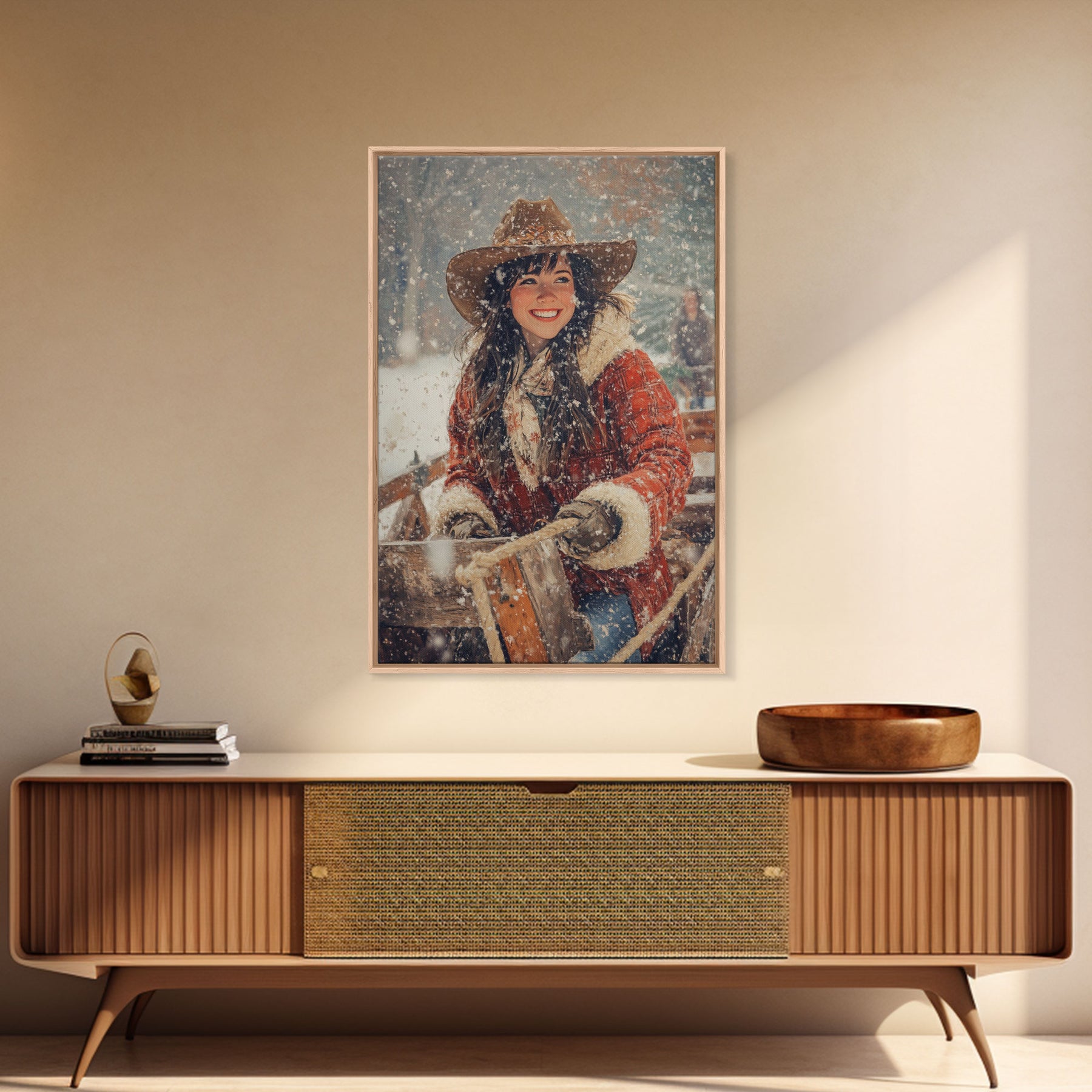 Country Christmas framed canvas print cheerful woman enjoying a snowy ride perfect seasonal wall art or vintage holiday home decor idea