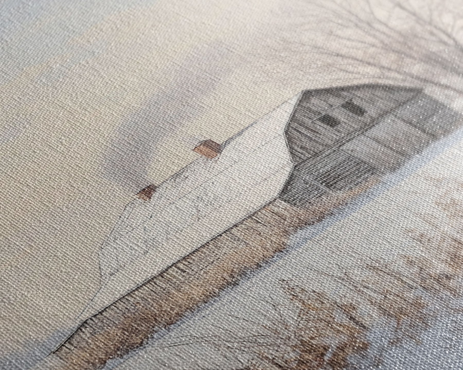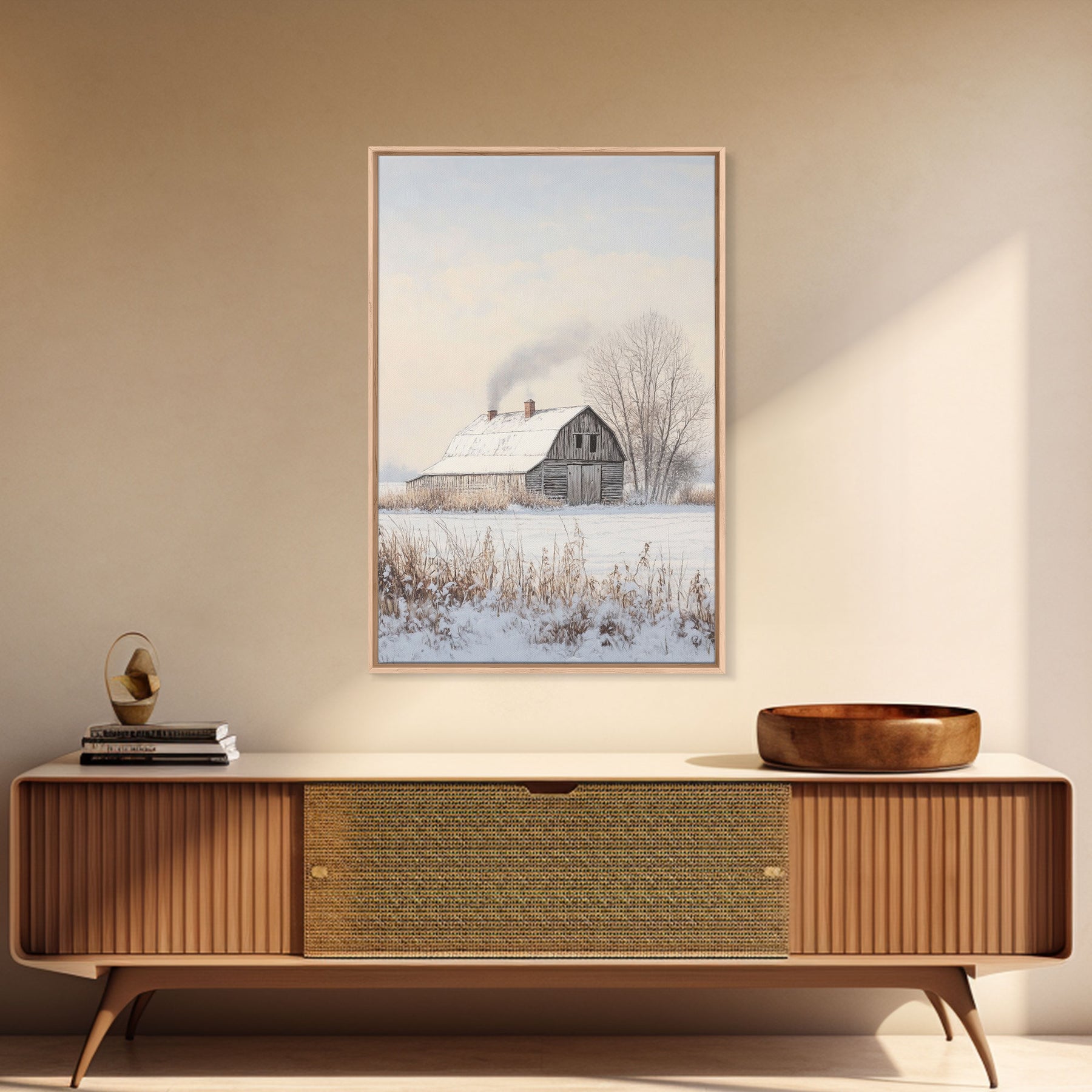 Winter Barn In Snow Framed Canvas Print Wall Art Rustic Winter Decor, Cozy Christmas Home Art, Winter Wonderland Wall Art