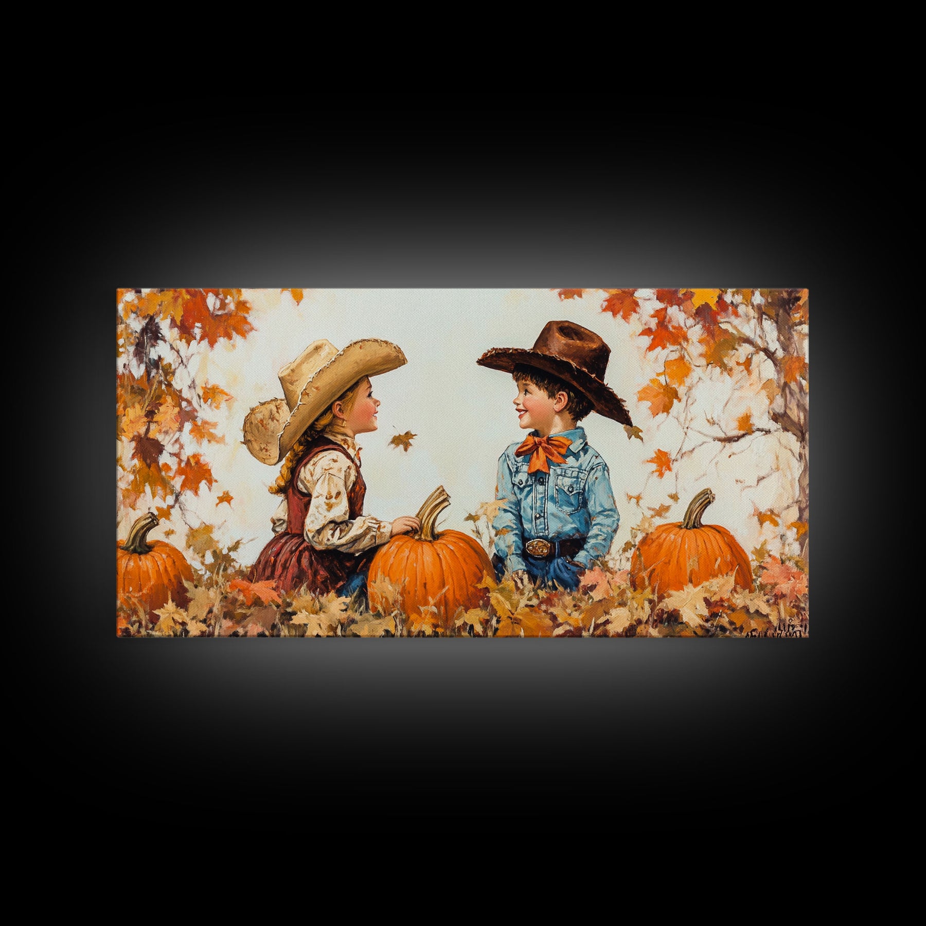 Cute Cowboy and Cowgirl In a Pumpkin Patch, Framed Canvas Print, 1950s Style Wall Art, Nursery Decor