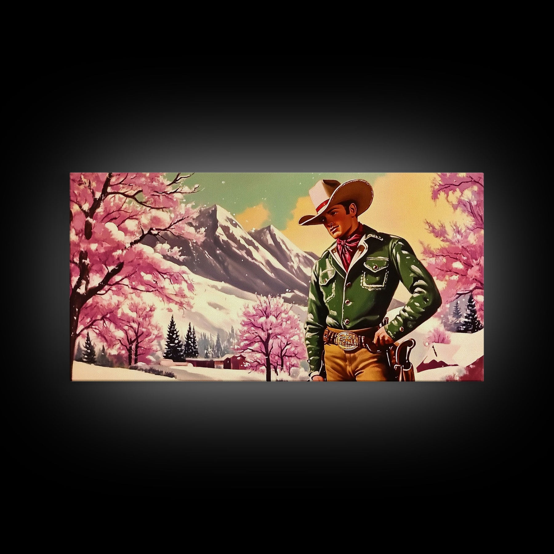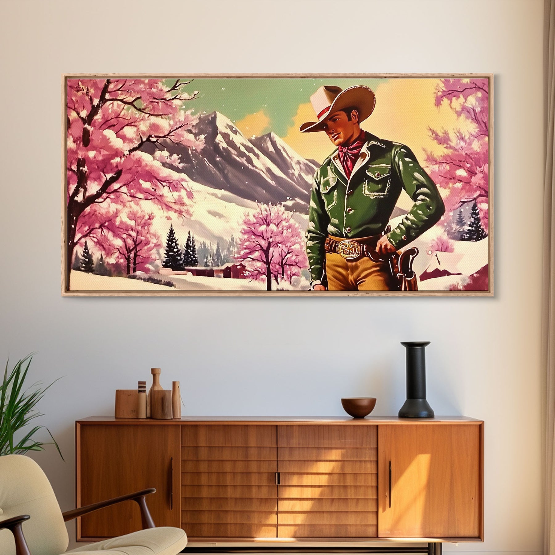 Retro Framed Canvas Print of a woman in a white dress standing next to a vintage pink truck, holiday wall art gift ideas any space