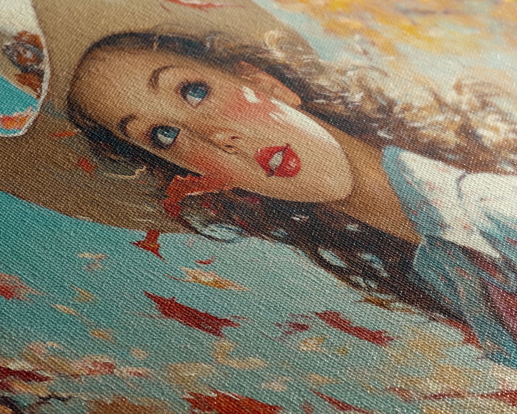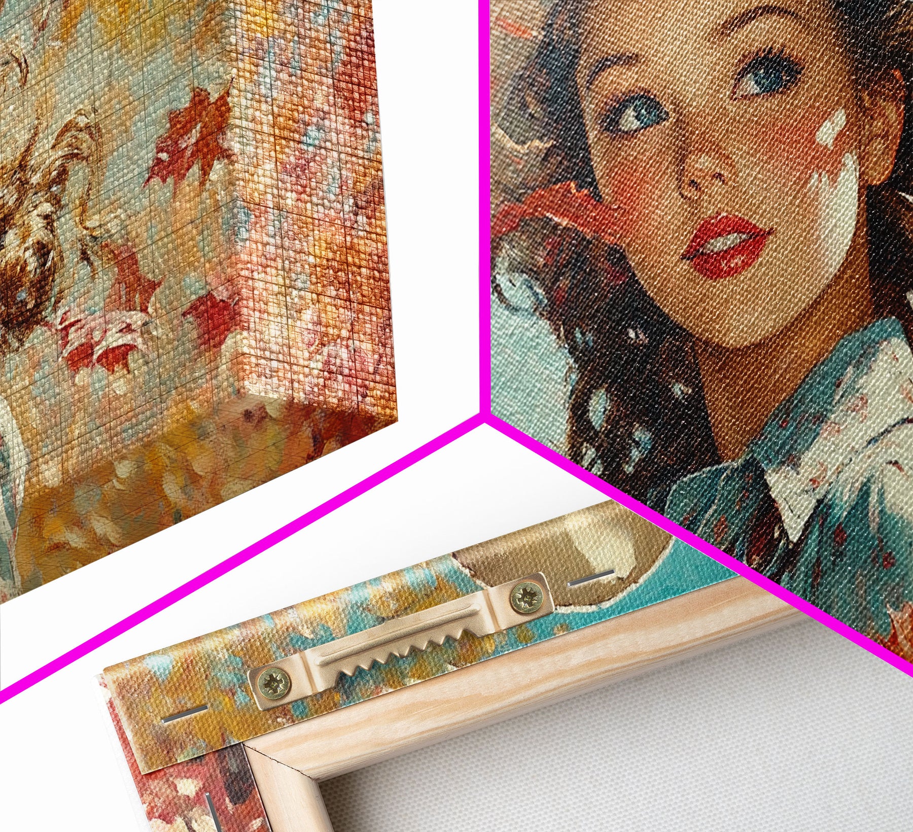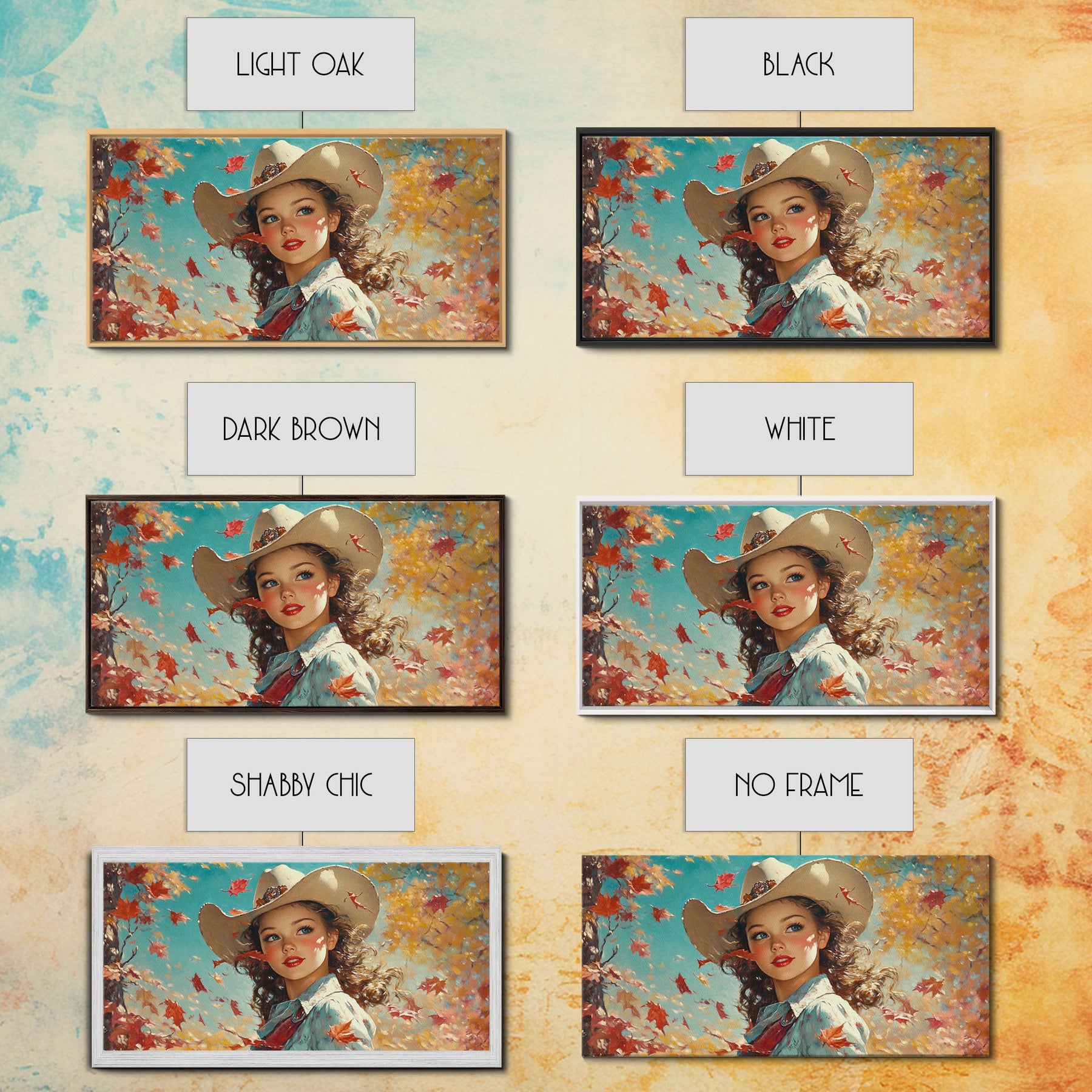 Vintage-inspired Framed Canvas Print of a woman in a cowboy hat with snowy mountains in the background, holiday wall decor rustic winter art