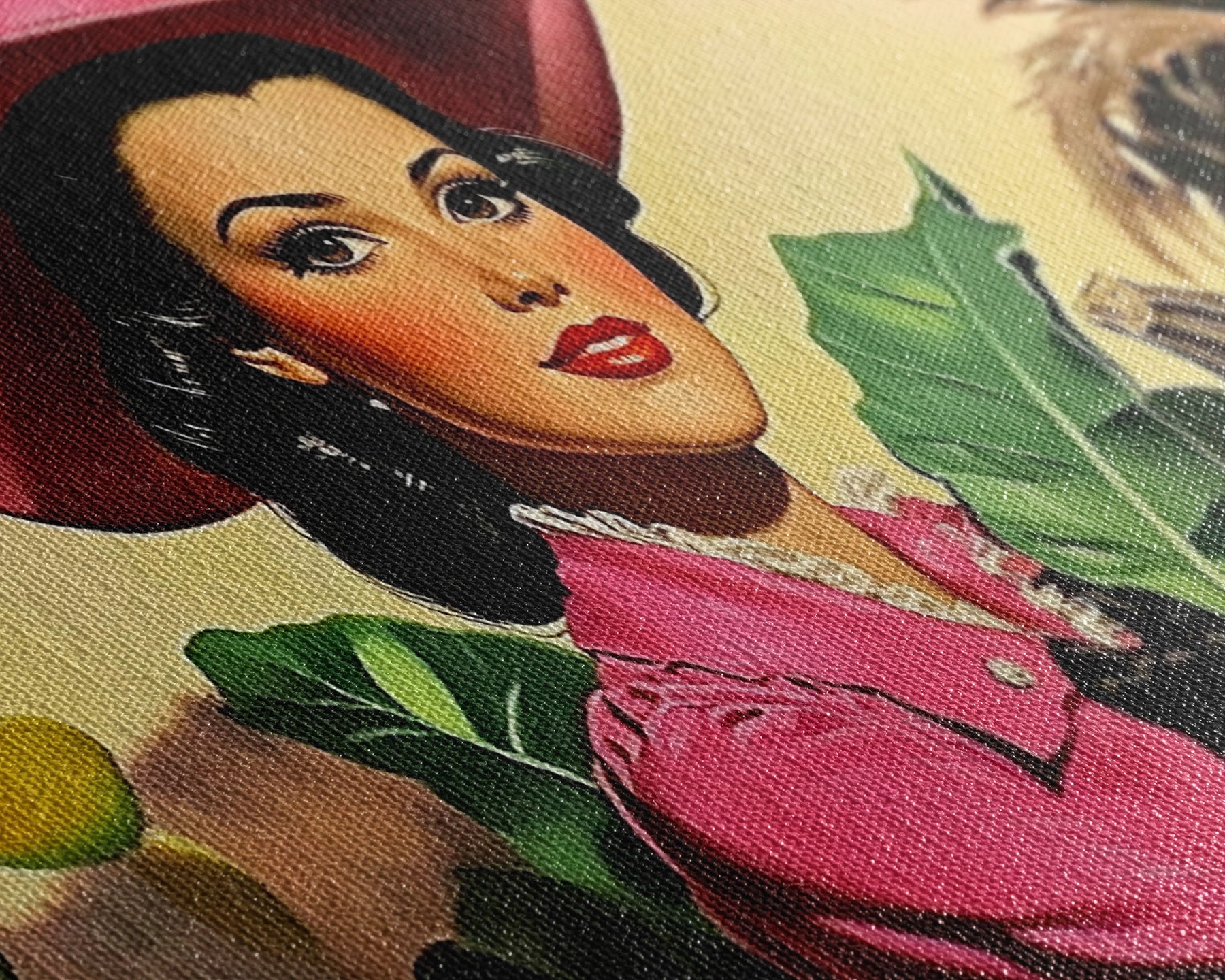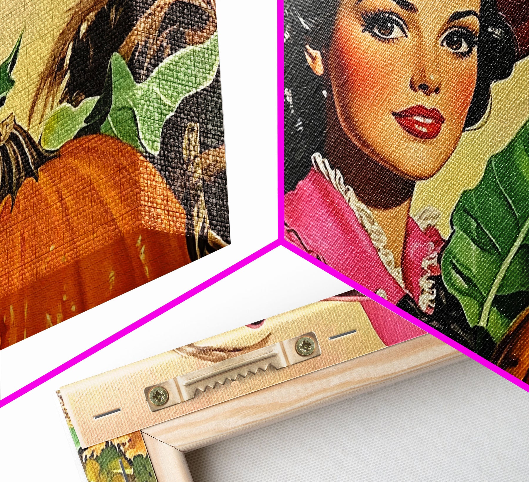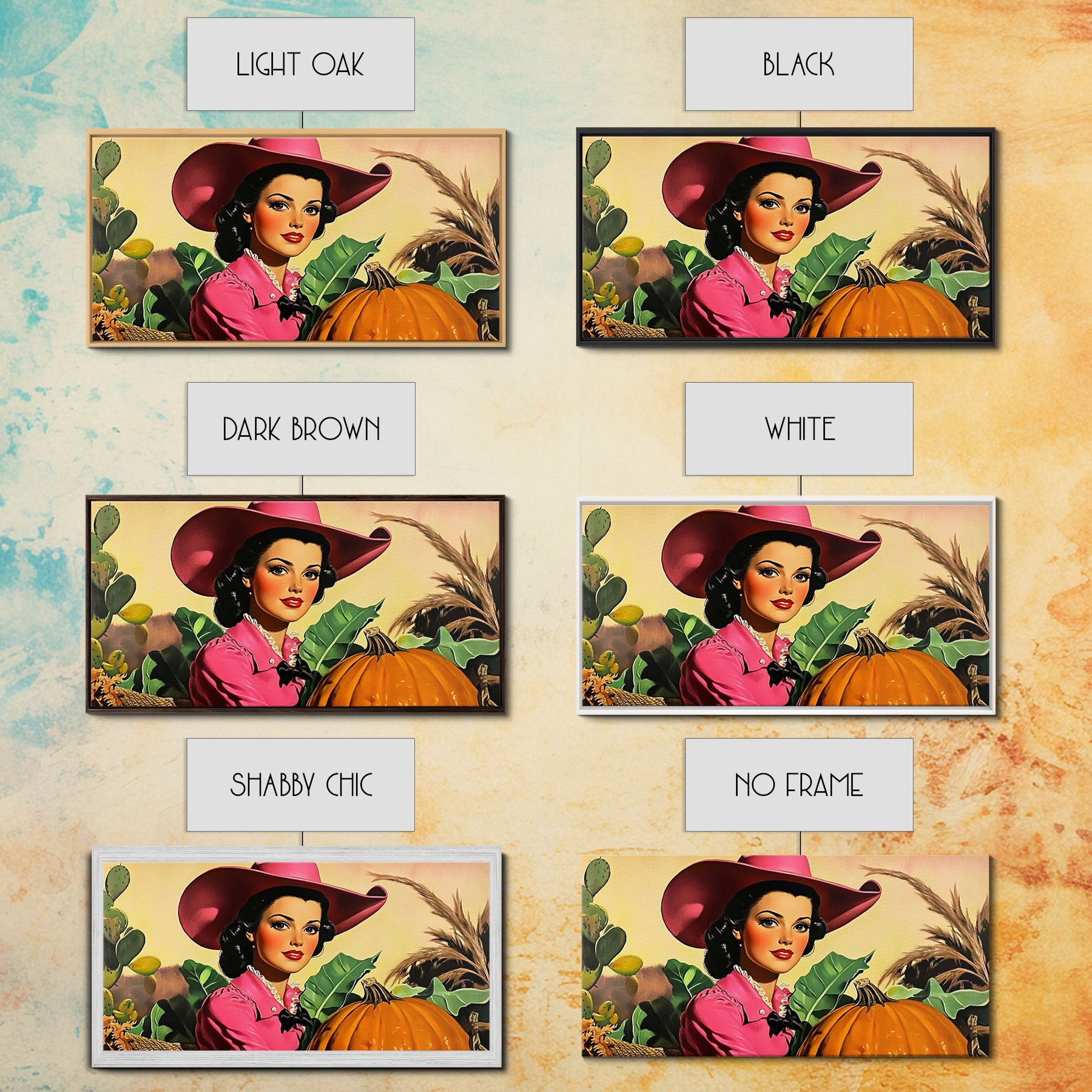 Retro Cowgirl In A Pumpkin Patch, Framed Canvas Print, Fall and Autumn Rustic Decor, perfect autumn or Christmas decor wall art