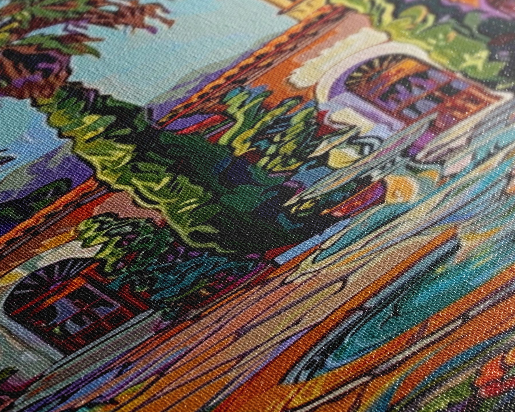 Most of our canvases are made in the USA, with the exception of canvases ordered with the light oak unstained frames, and any large canvases (24x48, 30x60, 16x48 and 20x60) ordered WITH a frame. These are temporarily made in and shipped from Europe, while we try to find a more consistent supplier in the USA.