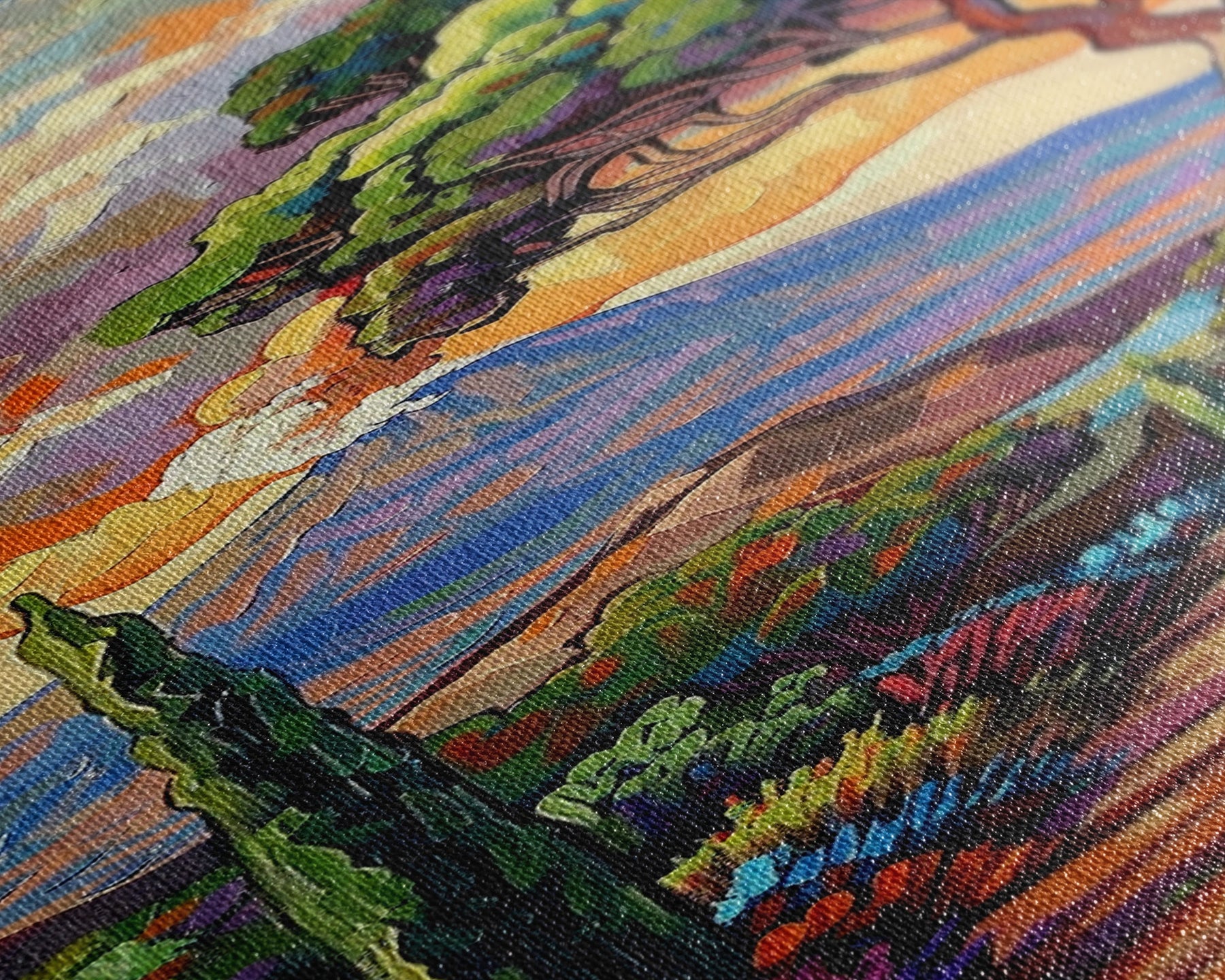 Most of our canvases are made in the USA, with the exception of canvases ordered with the light oak unstained frames, and any large canvases (24x48, 30x60, 16x48 and 20x60) ordered WITH a frame. These are temporarily made in and shipped from Europe, while we try to find a more consistent supplier in the USA.