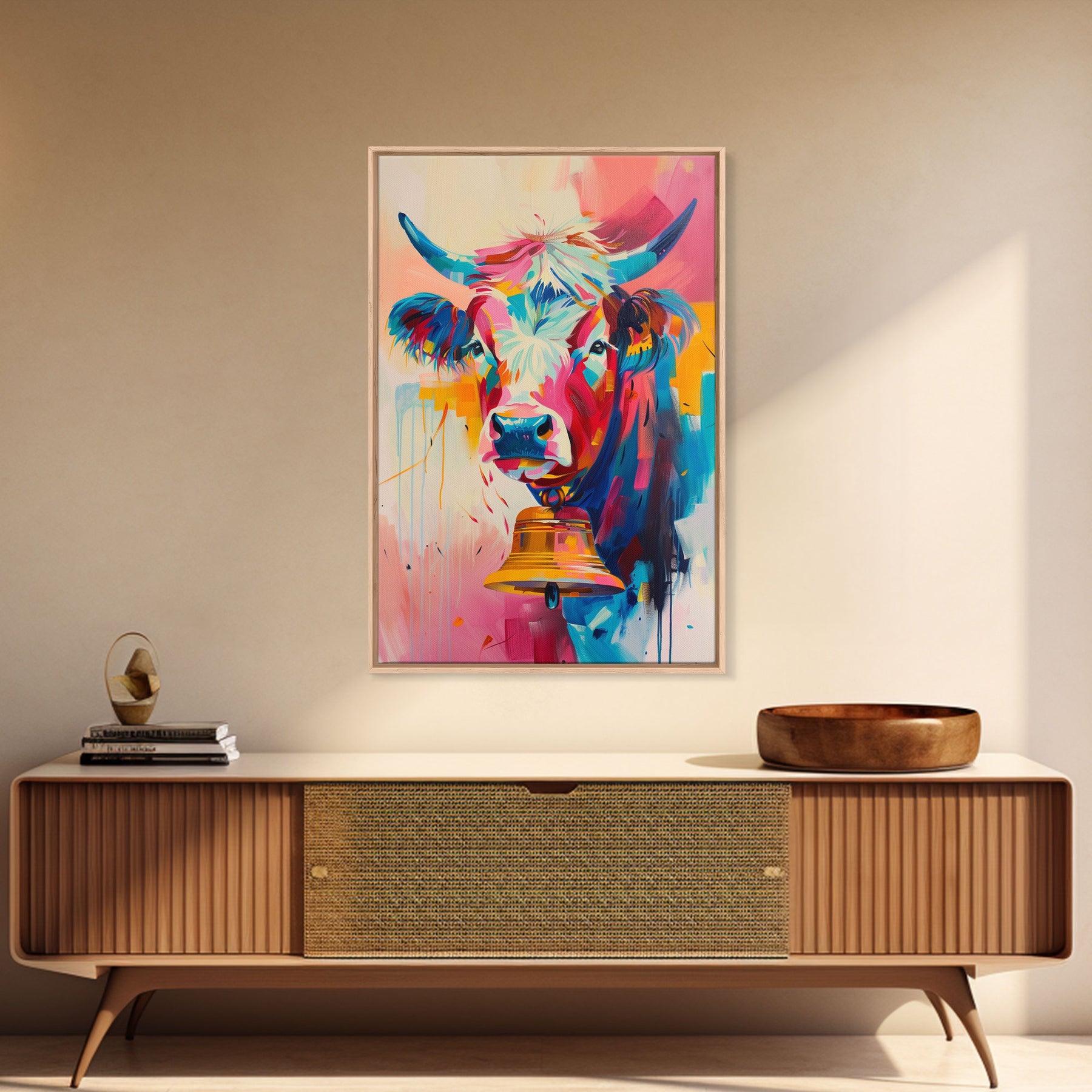 Expressive Cow Art in Bold Hues - Framed Canvas Print, Colorful Animal Decor, Modern Farmhouse Wall Art for Living Room or Bedroom