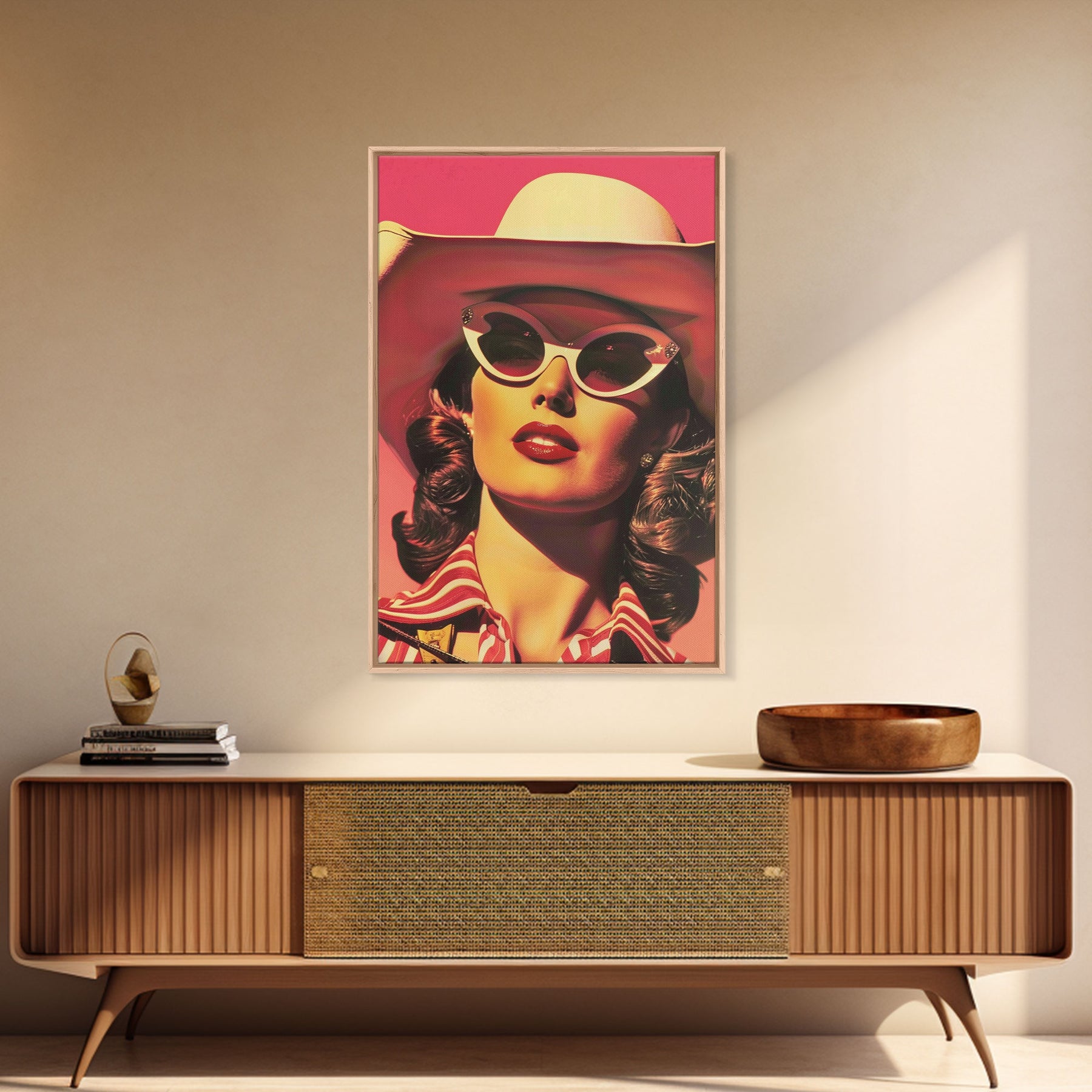 Retro Cowgirl in Sunglasses with Hat Art | Framed Canvas Print | Vintage Western Decor | Classic Cowgirl Wall Art for Home Decor