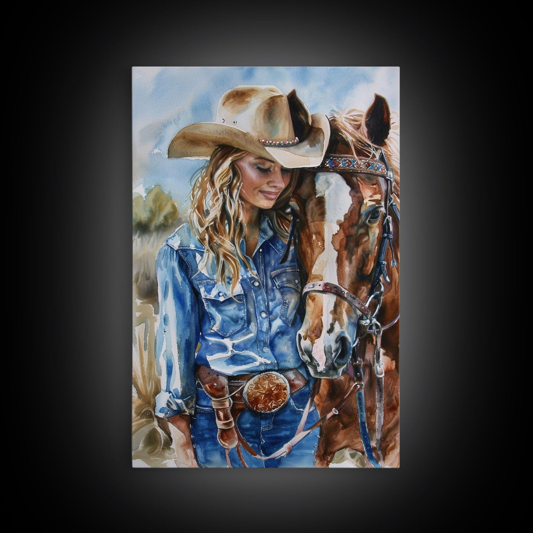 Cowgirl Preparing Horse for Ride - Framed Canvas Print, Western Wall Art, Rustic Decor, Living Room and Bedroom Art Print