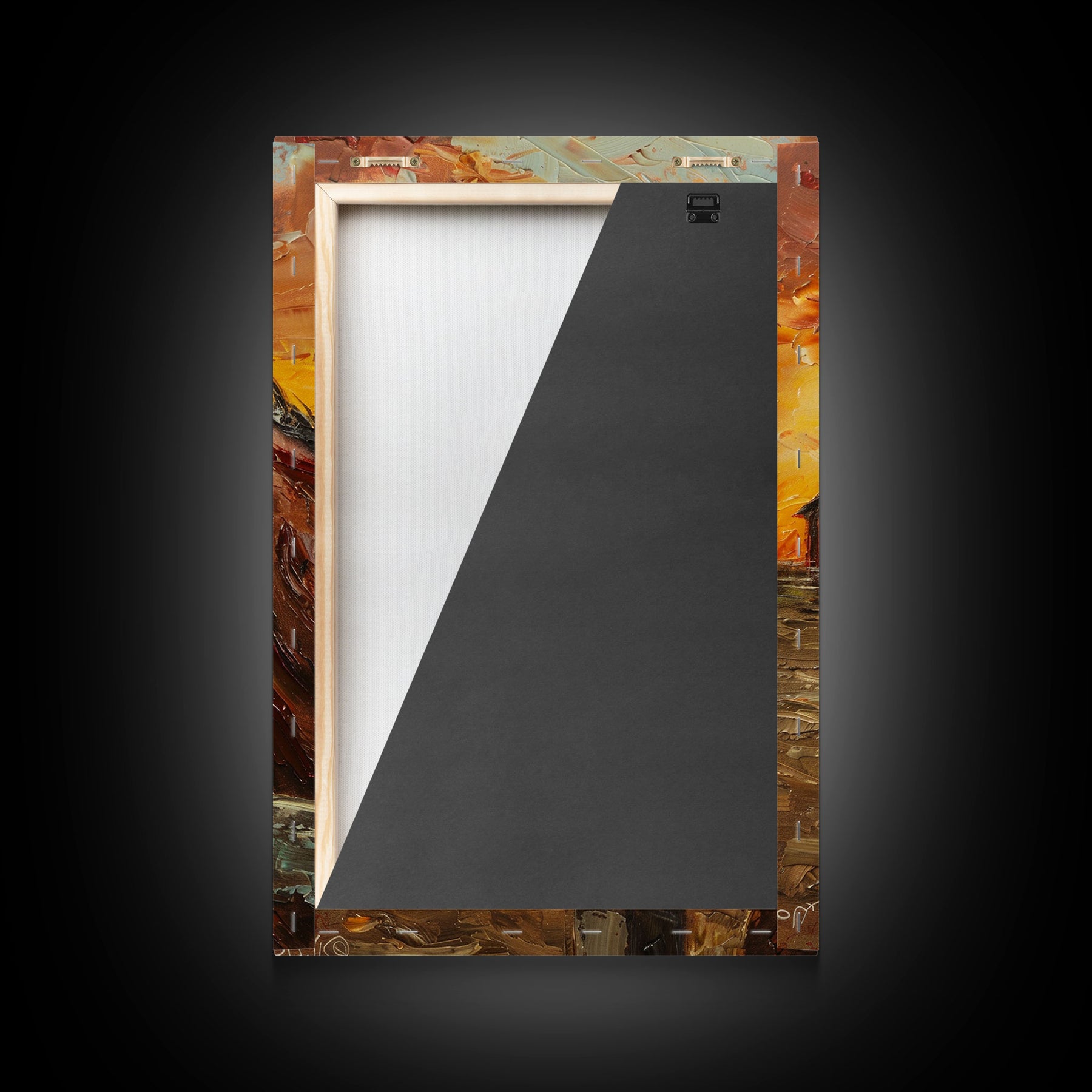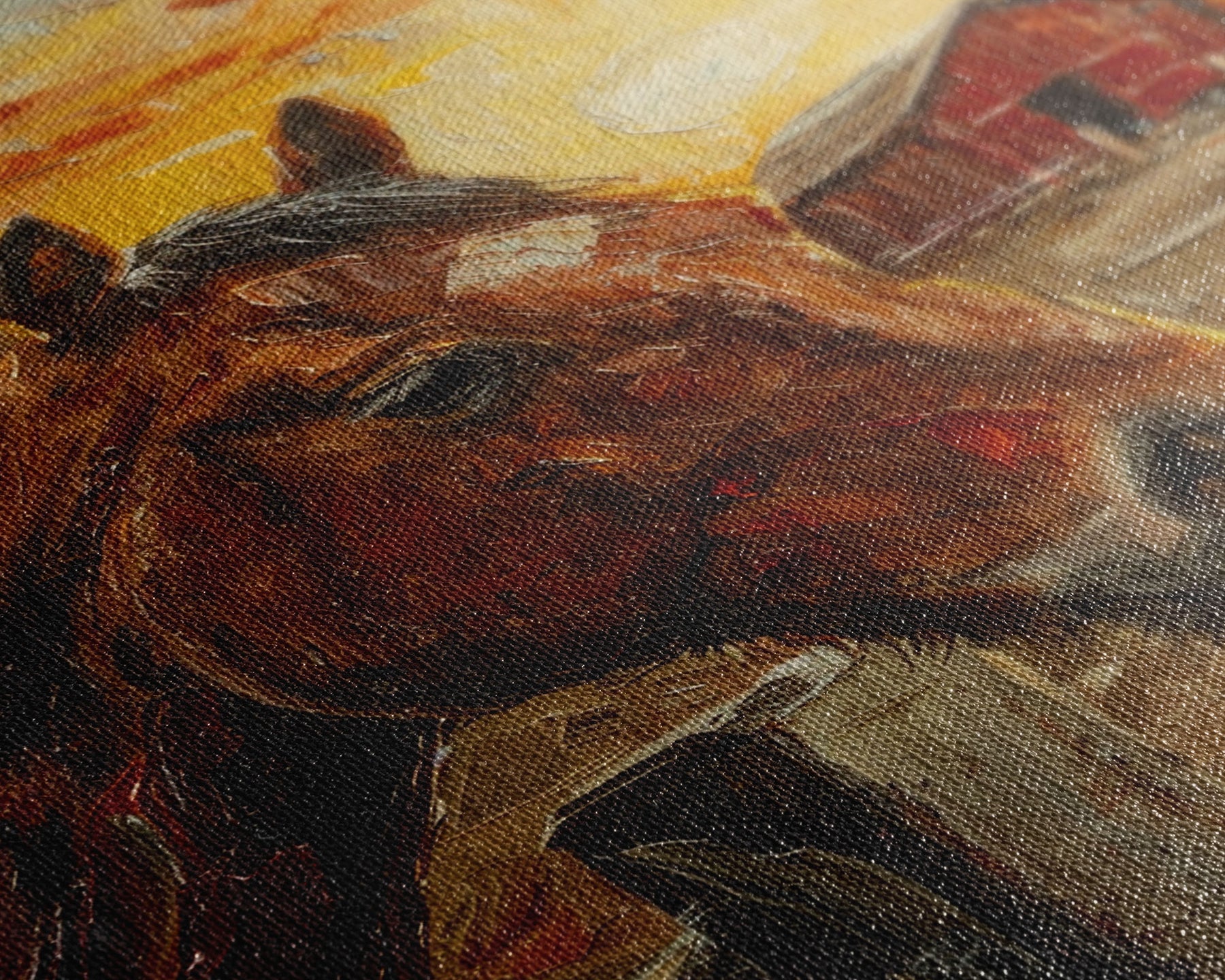 Horse with Red Barn Sunset Art - Framed Canvas Print, Rustic Bedroom Decor, Farmhouse Wall Art, Horse and Barn Home Decoration