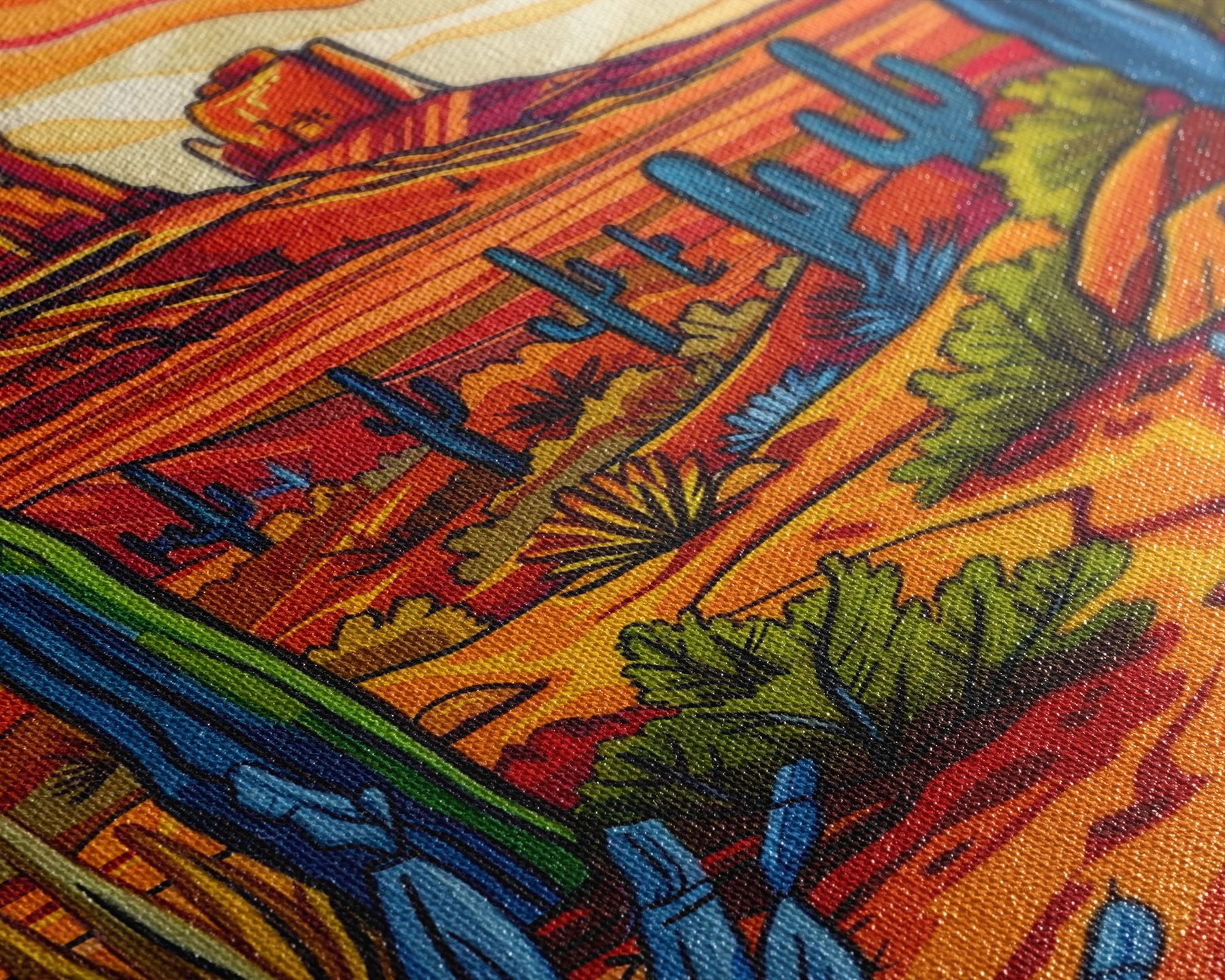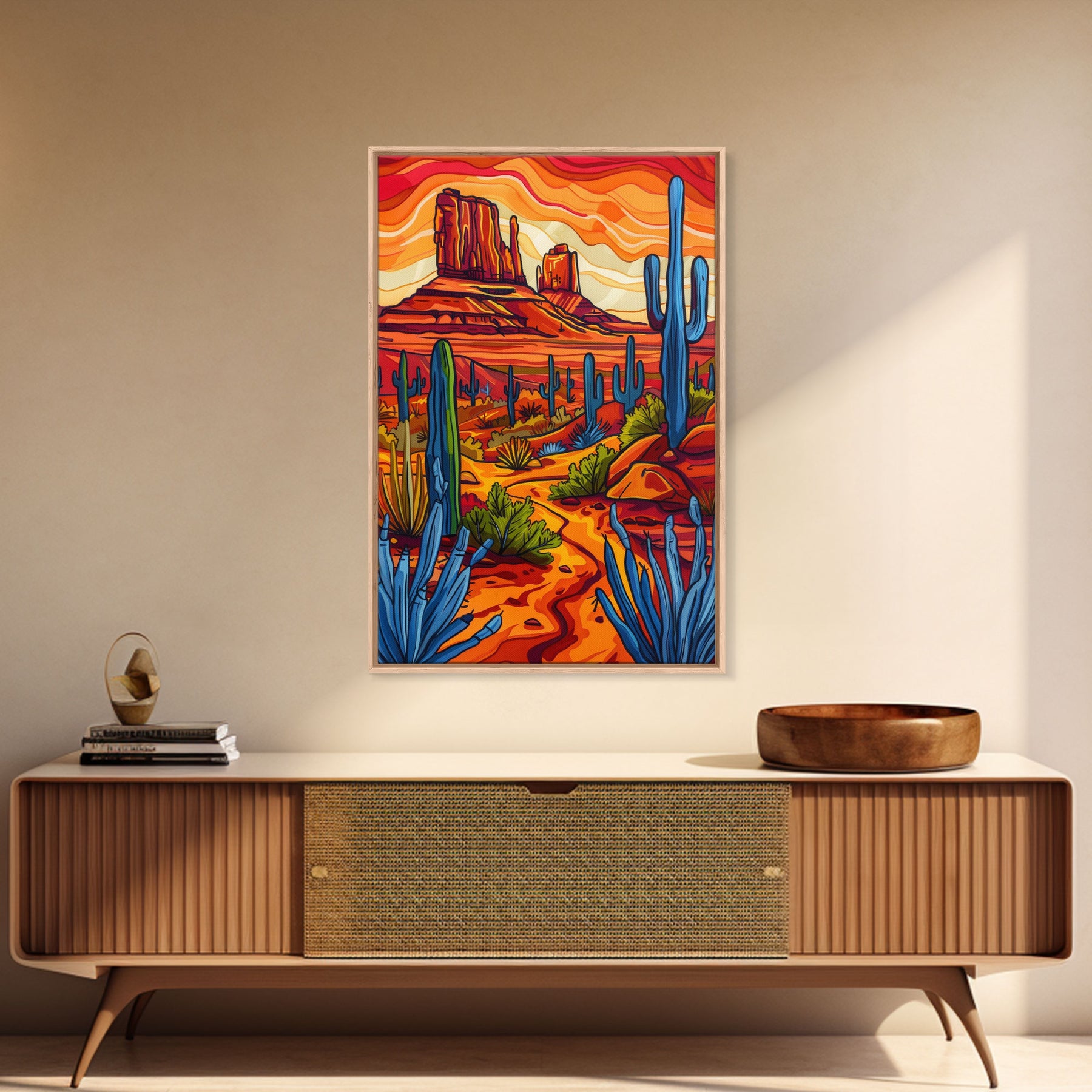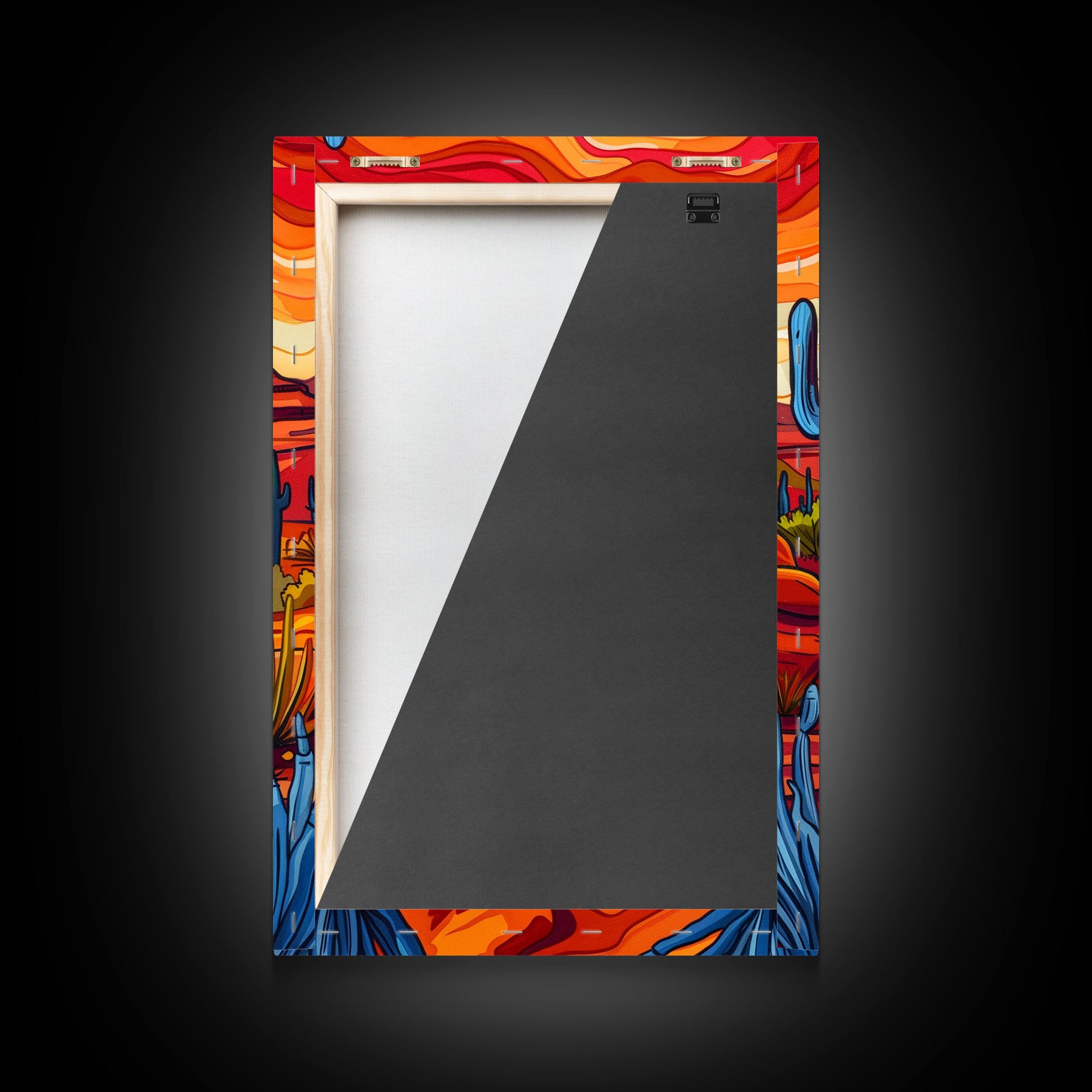 Framed Canvas Print, Vibrant Desert Scene with Cacti and Mesas, Perfect Southwest Wall Art for Living Room or Bedroom Decor