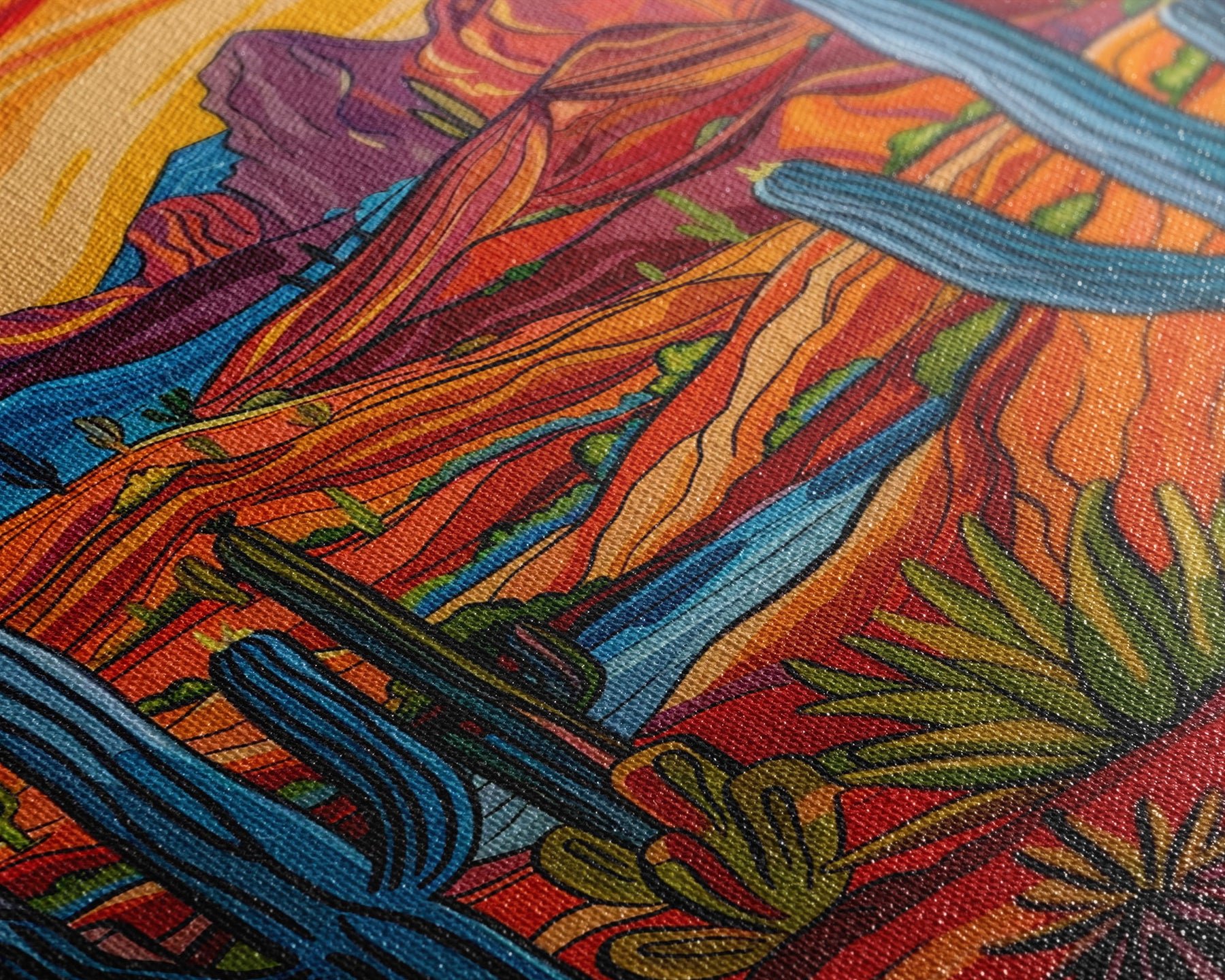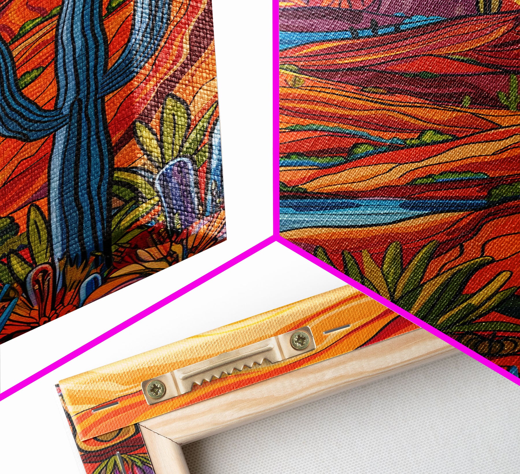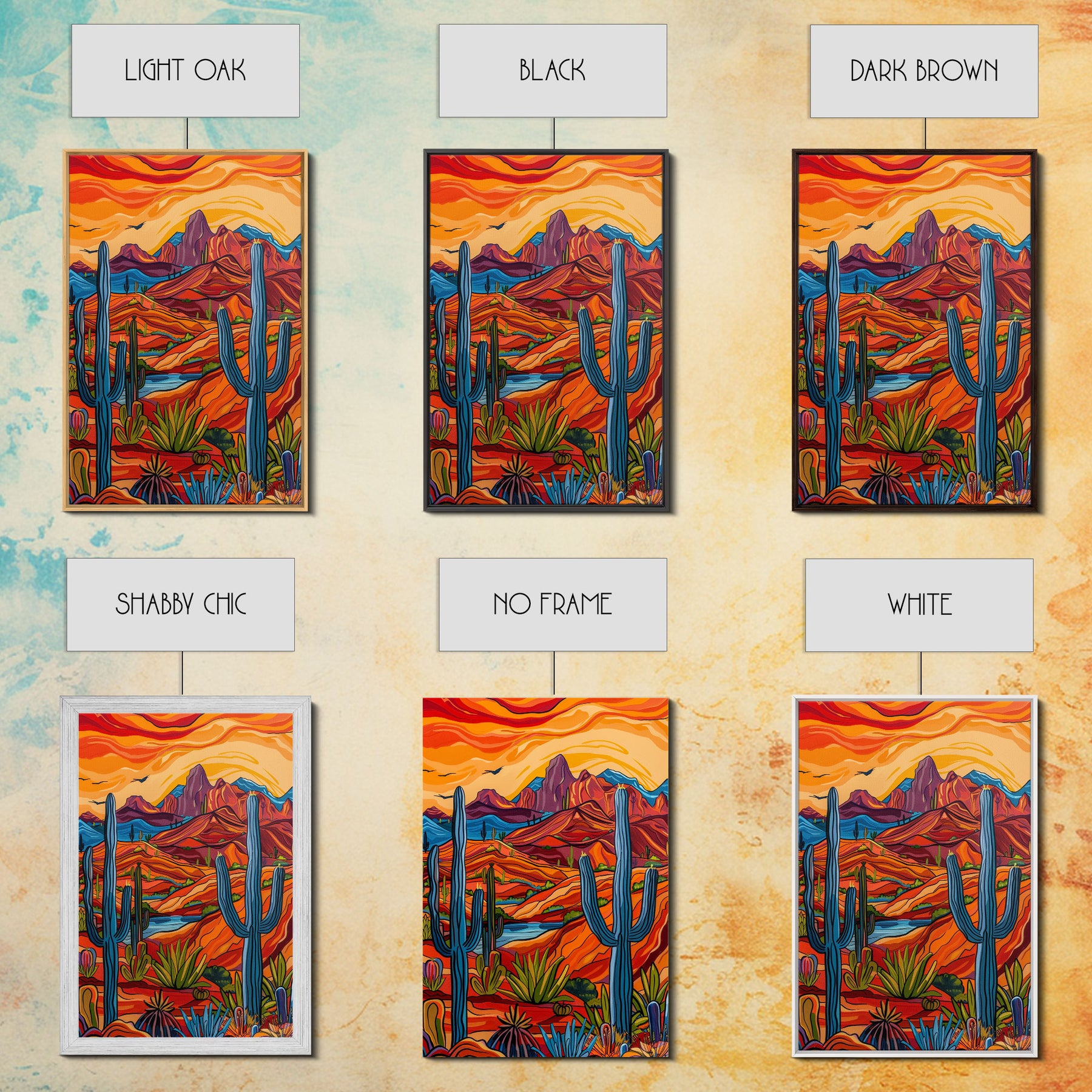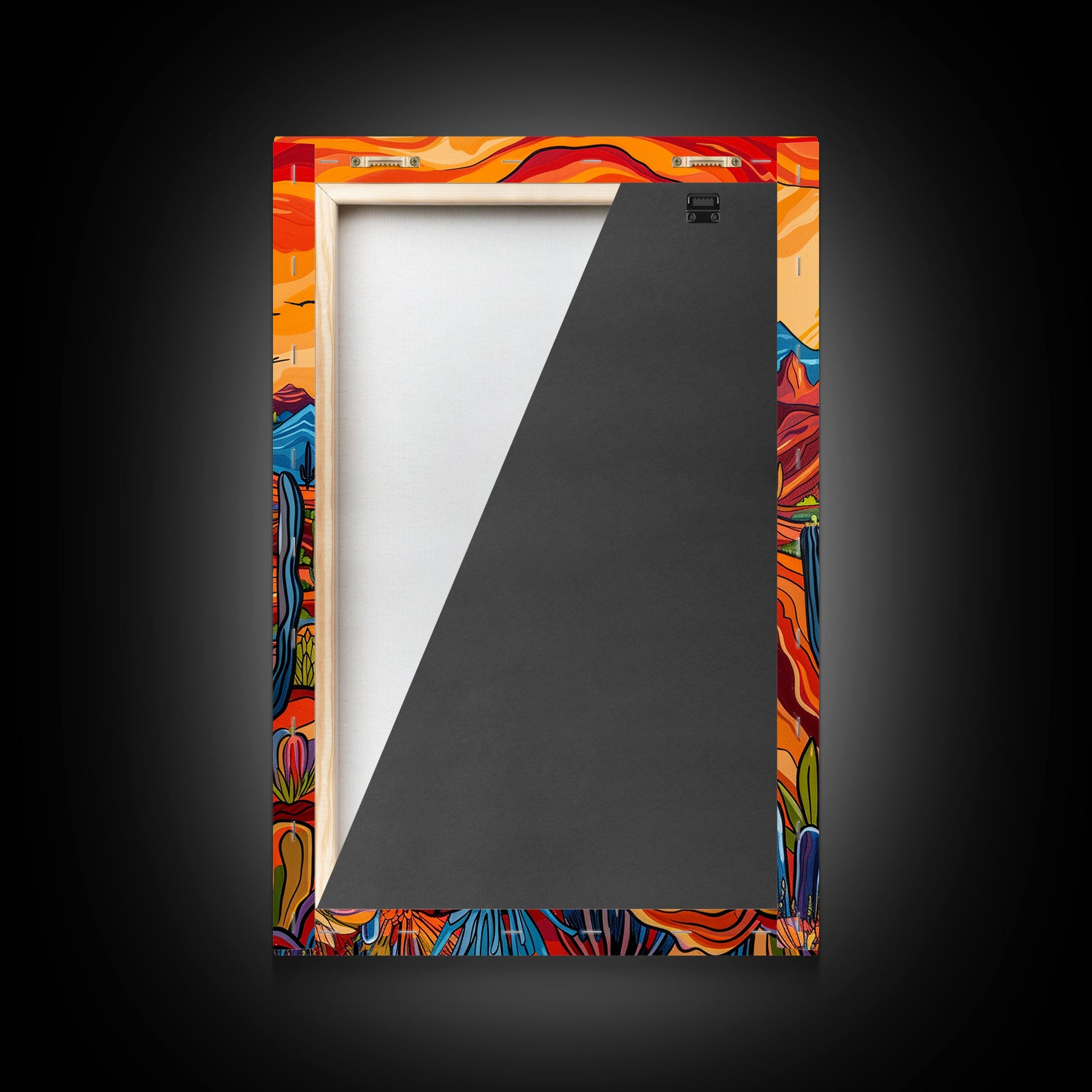 Framed Canvas Print, Bright Desert Landscape with Cacti and Mountains, Perfect Wall Art for Living Room or Bedroom