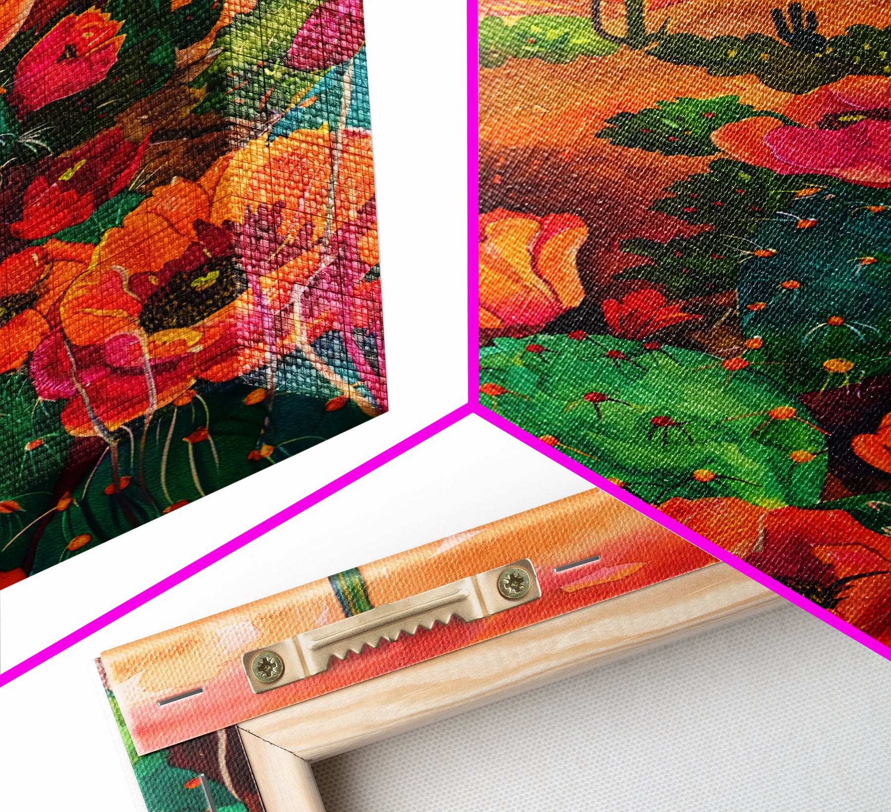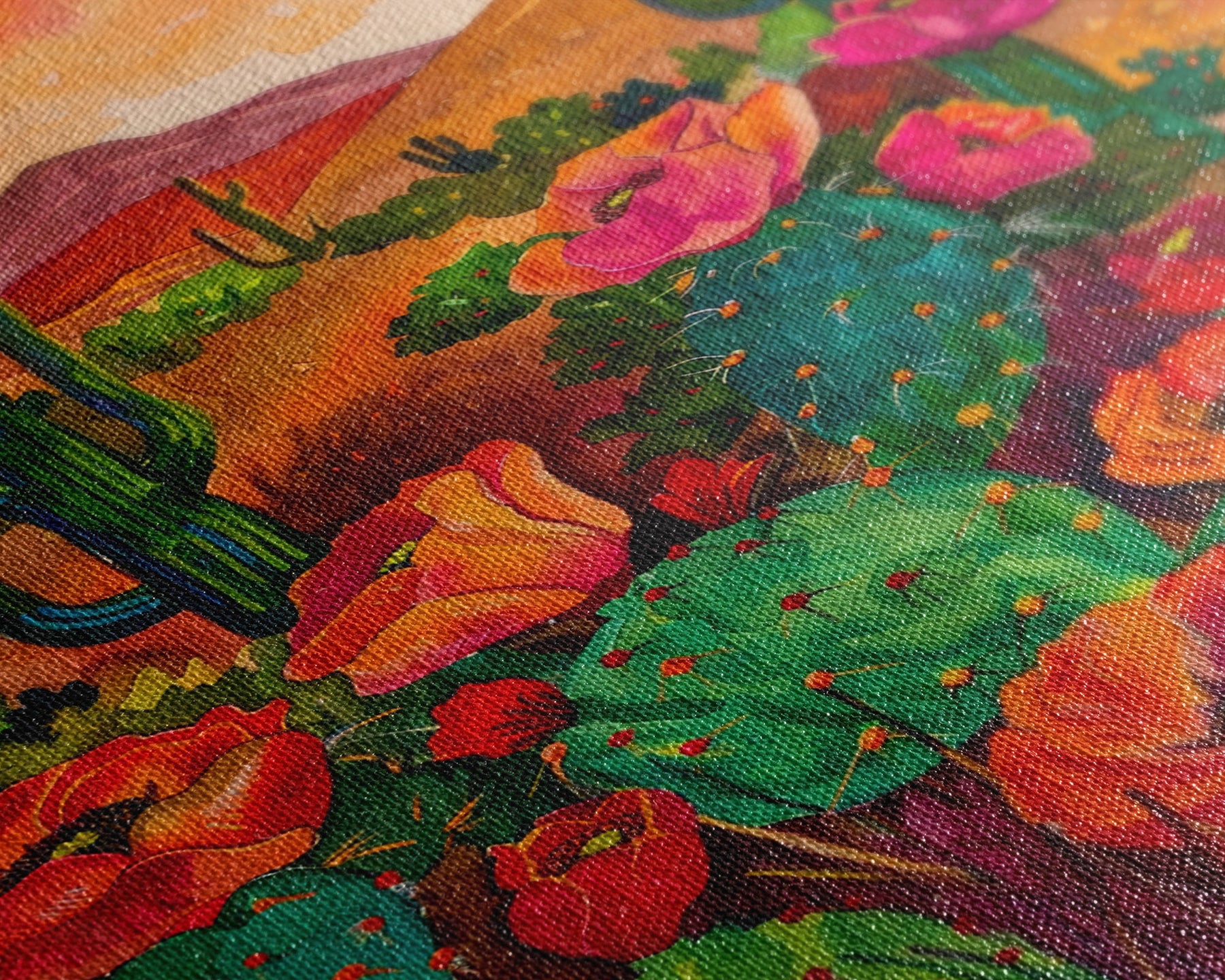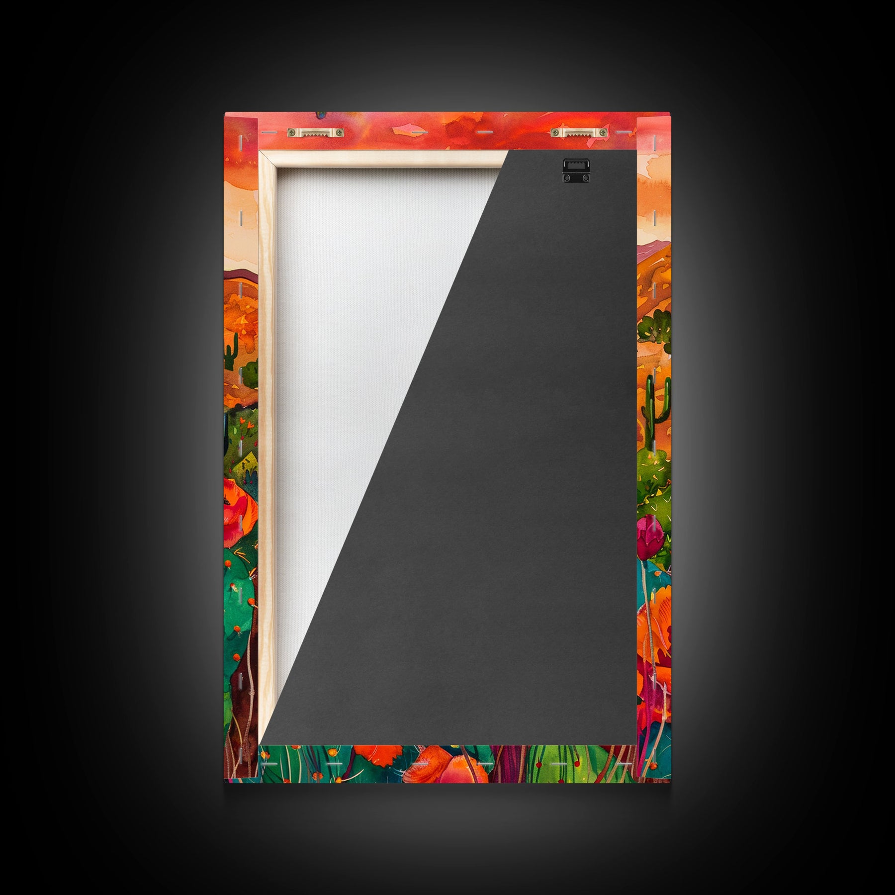 Southwest Desert Landscape with Cacti and Flowers, Colorful Wall Art for Living Room or Bedroom, Framed Canvas Print