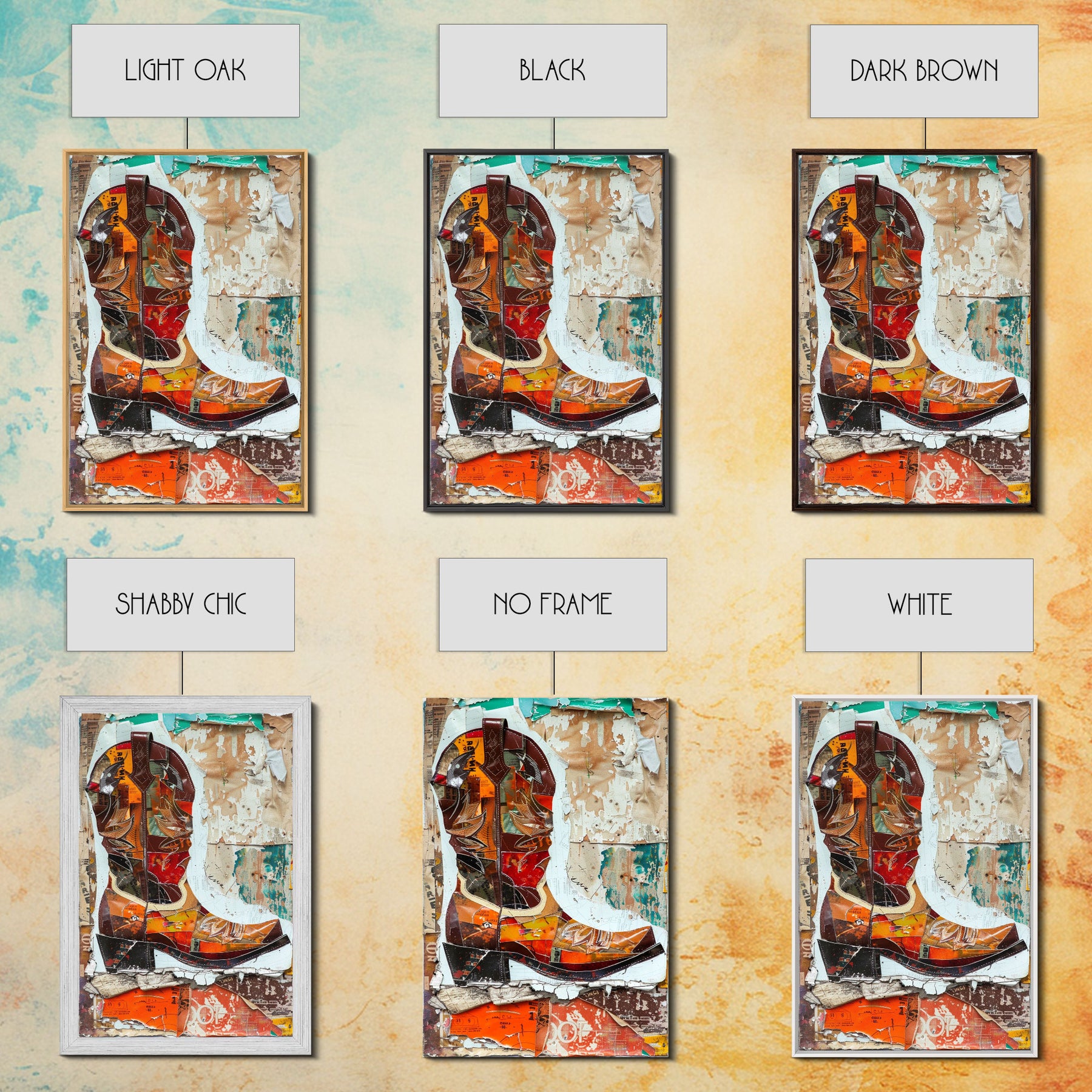 Vintage Western Boot Collage Art on Distressed Background - Framed Canvas Print, Rustic Western Decor, Cowboy Boot Wall Art for Home Decor