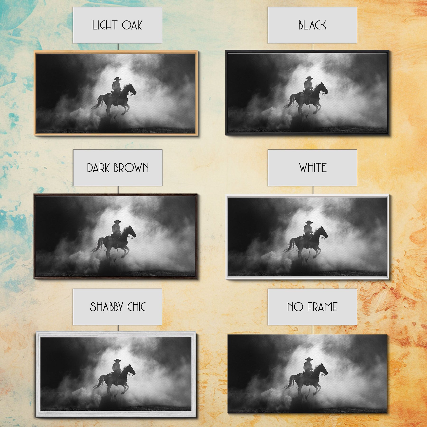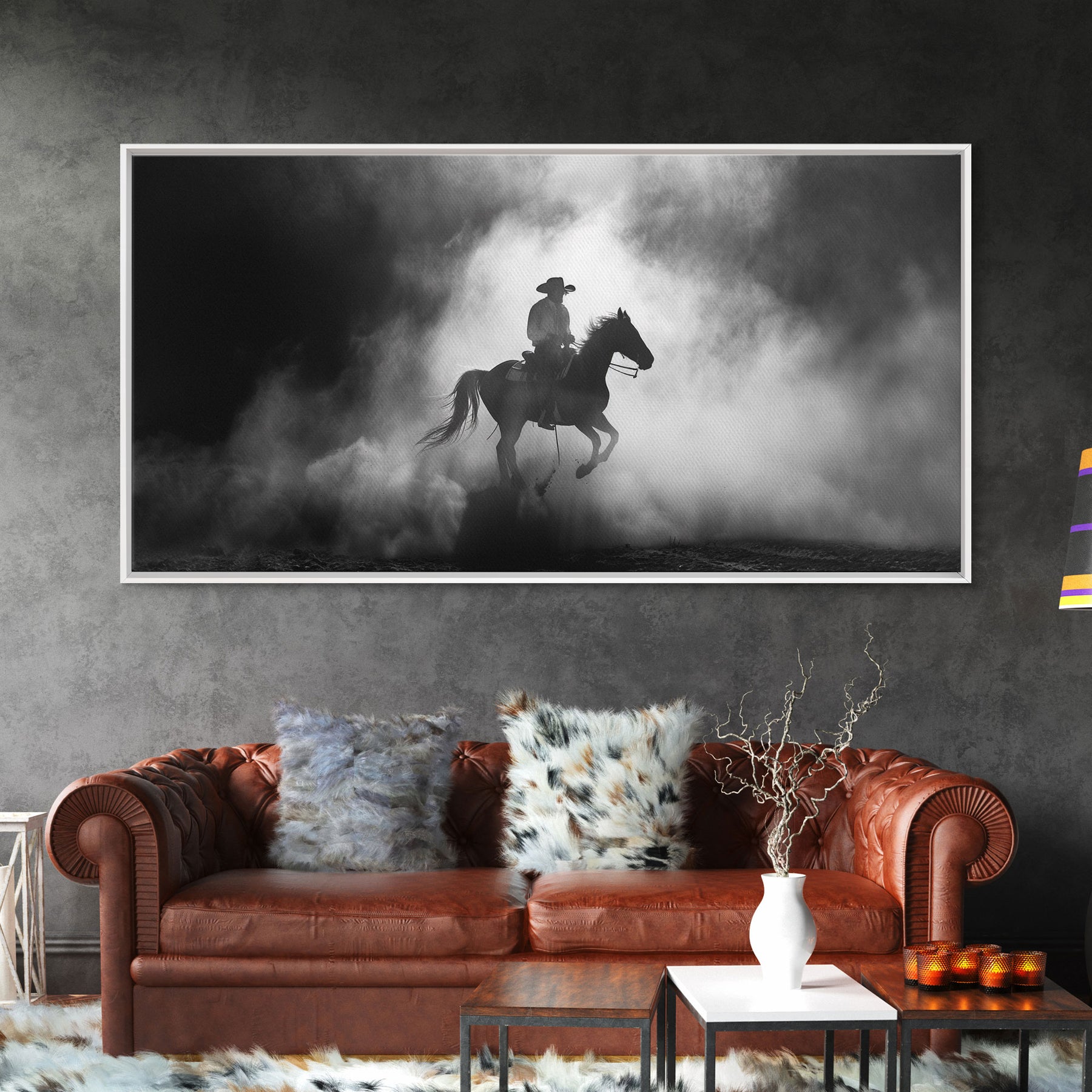 Silhouette of Cowboy on Horse in Dusty Arena, Framed Canvas Print for Western Style Home, Perfect Living Room Decor, Art for Bedroom