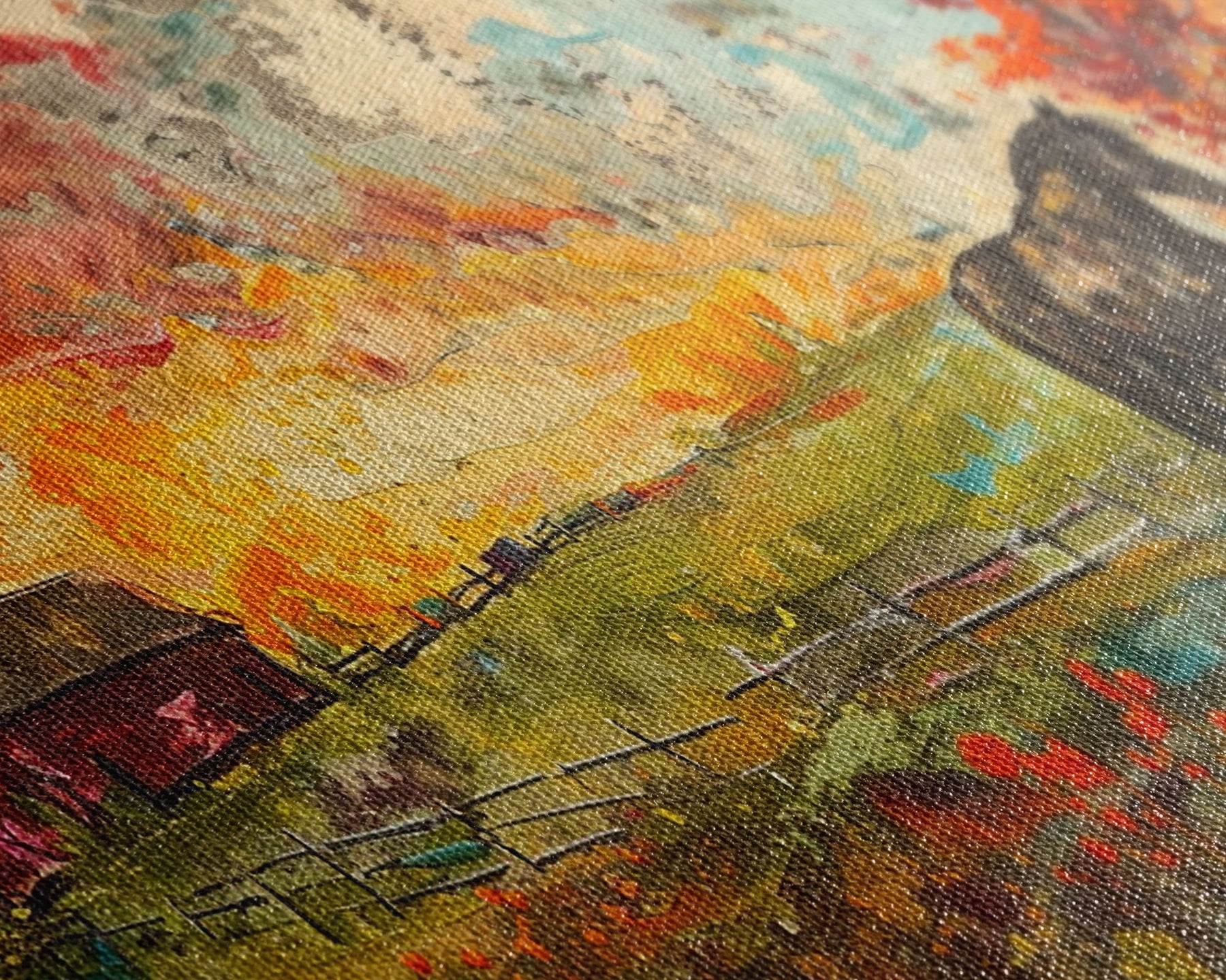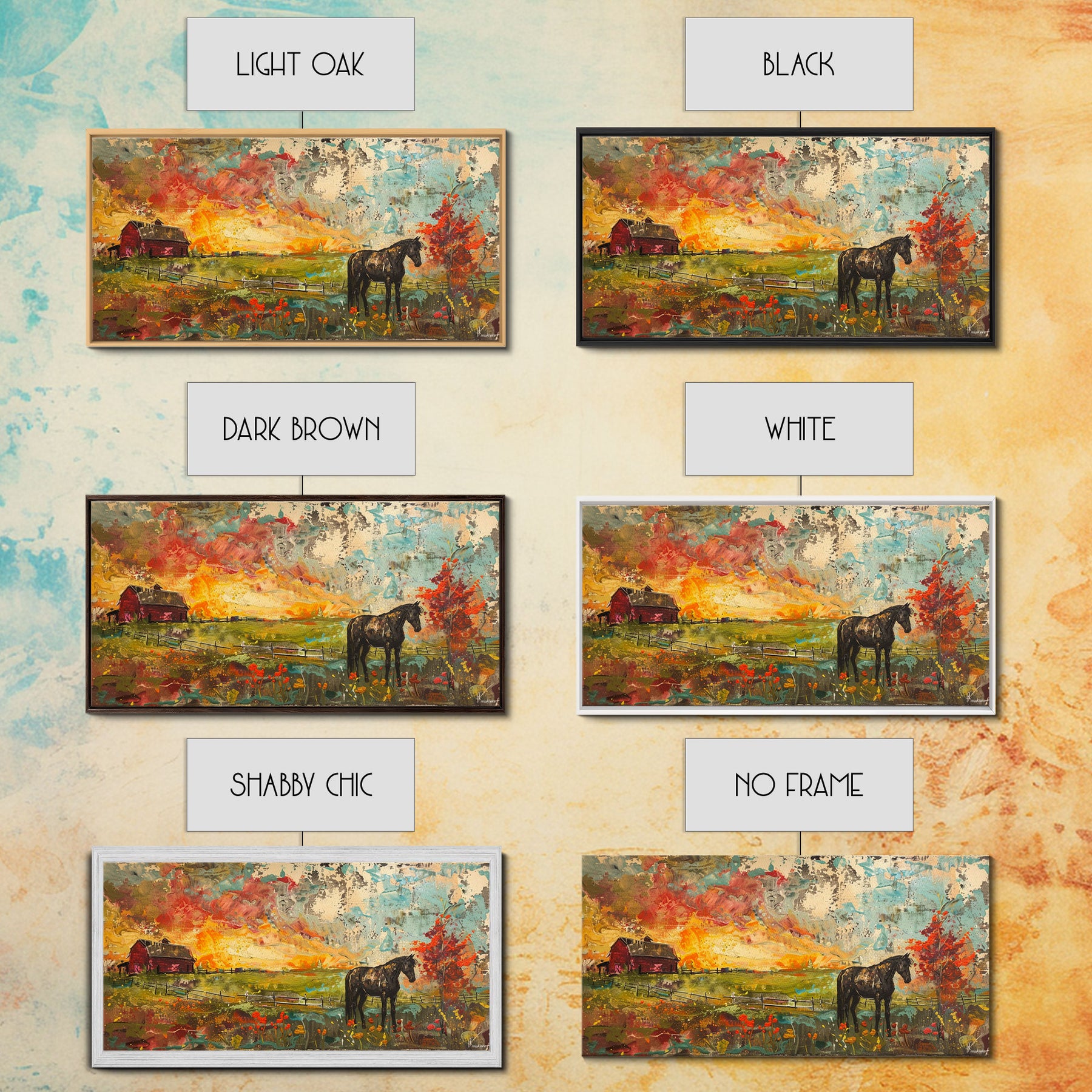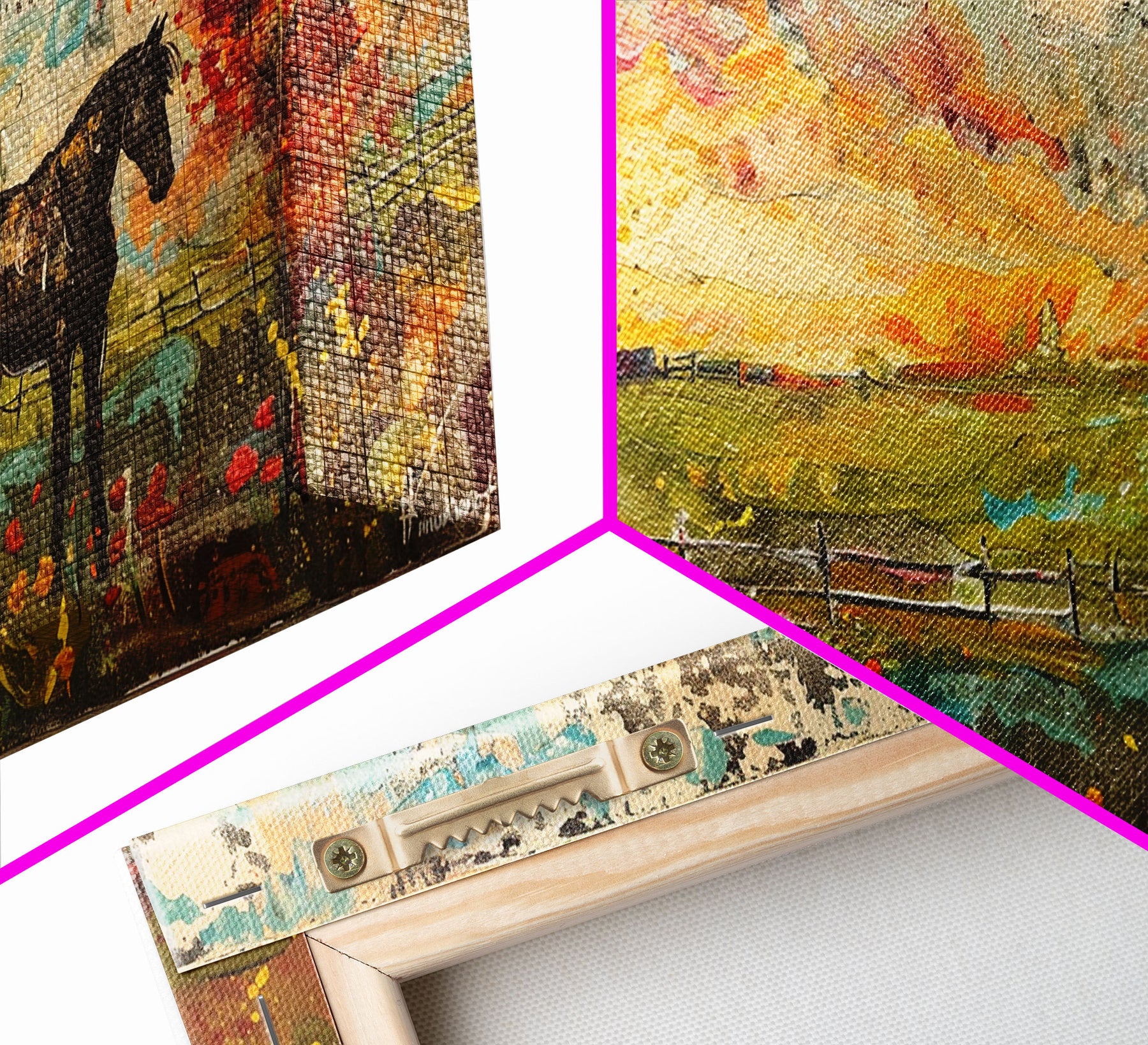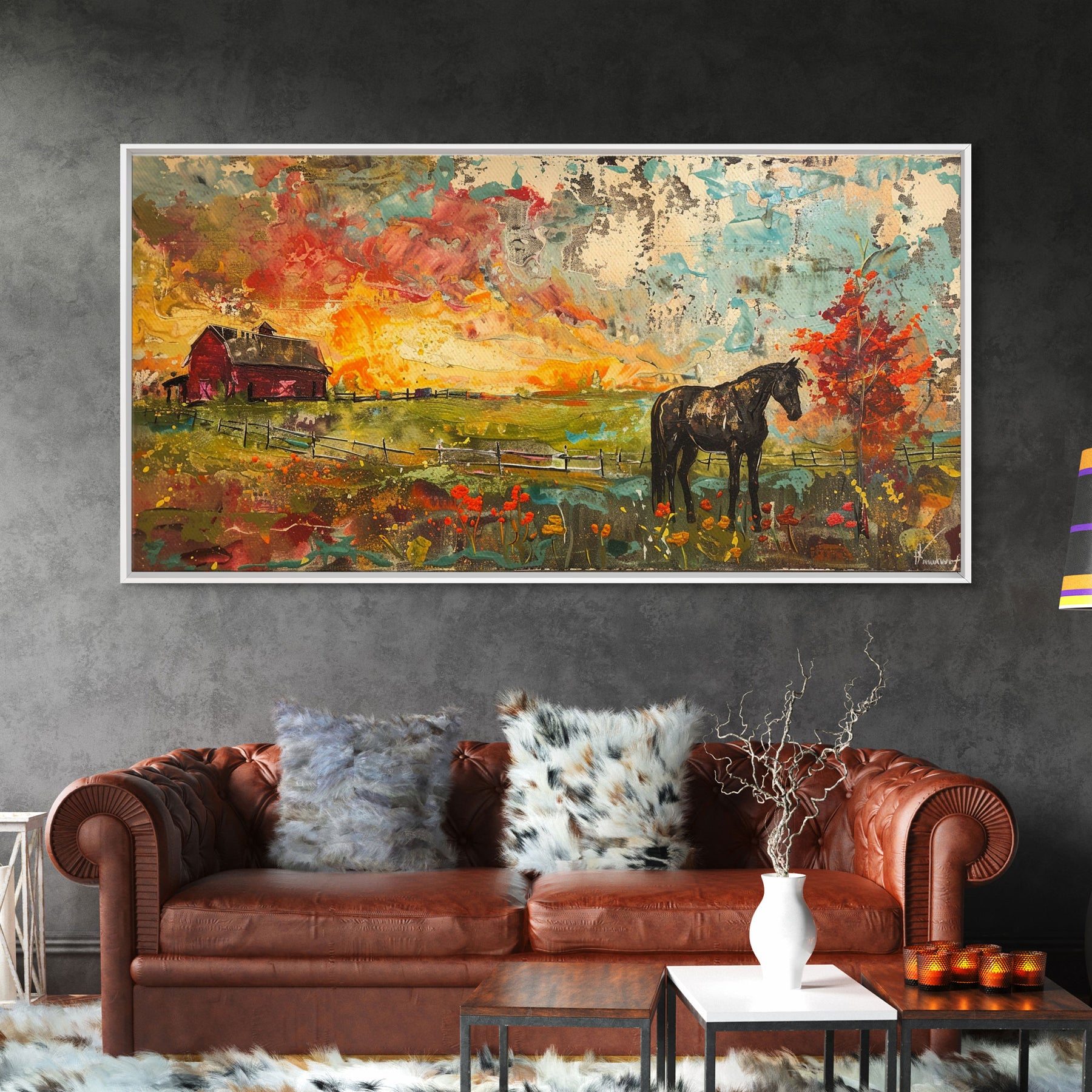 Horse and Red Barn in Colorful Field, Beautiful Farmhouse Art, Framed Canvas Print, Rustic Living Room Decor, Vibrant Wall Art