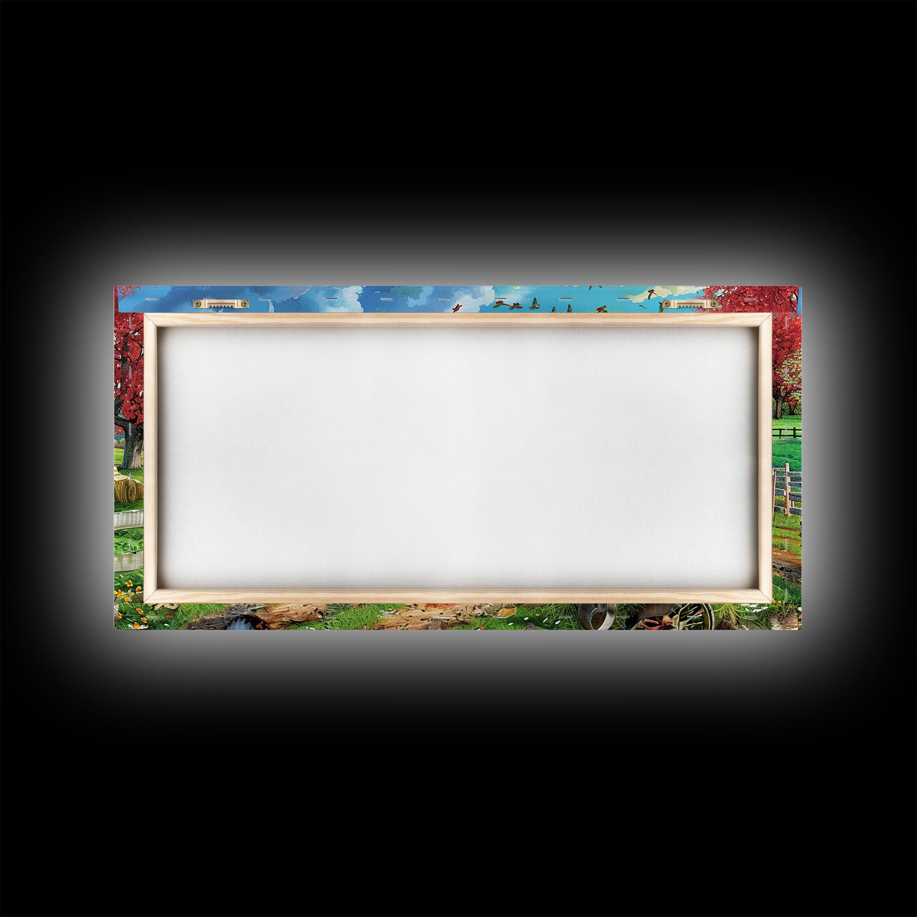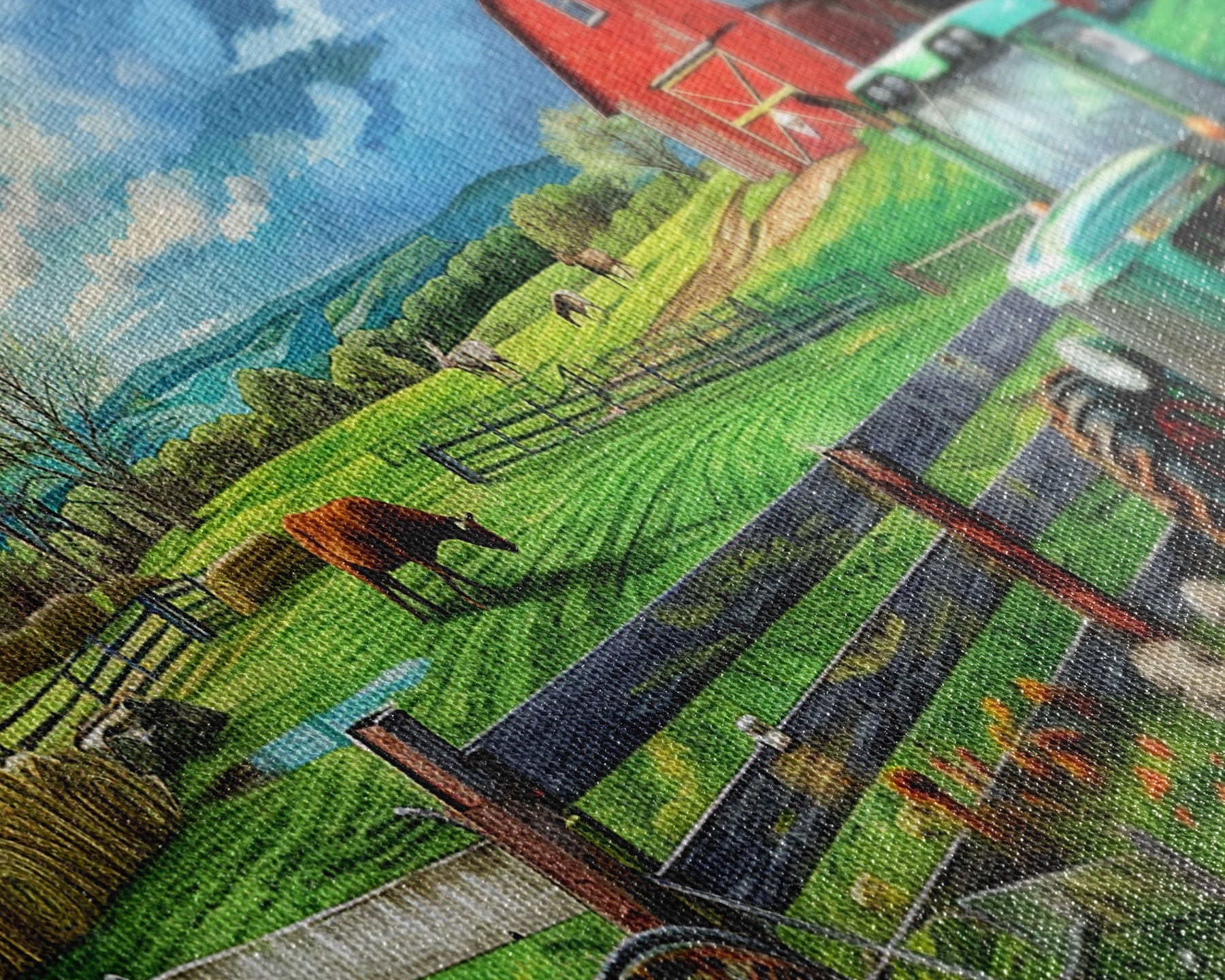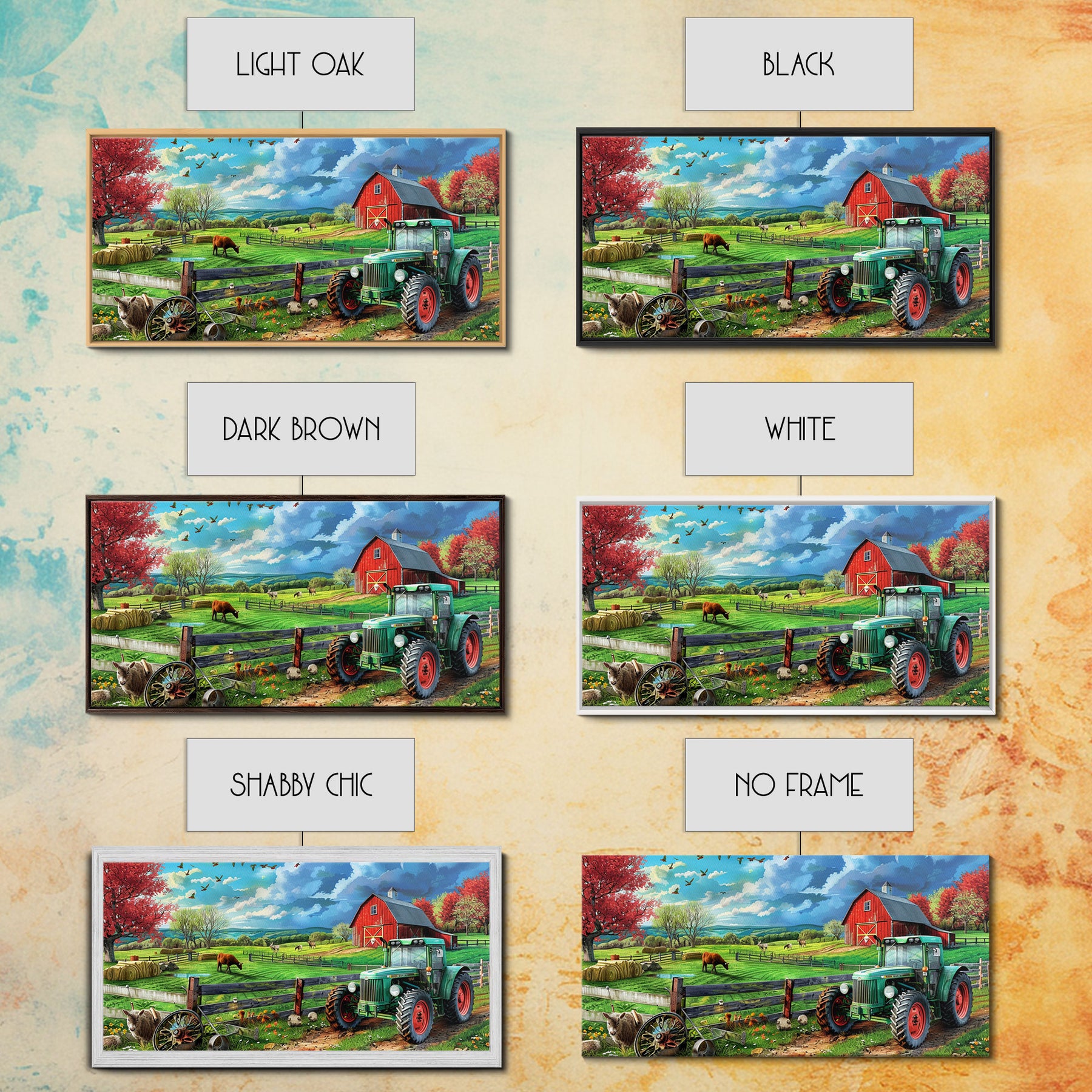 Green Tractor and Red Barn in Lush Fields, Perfect Farmhouse Art, Framed Canvas Print, Rural Wall Decor, Living Room Decoration