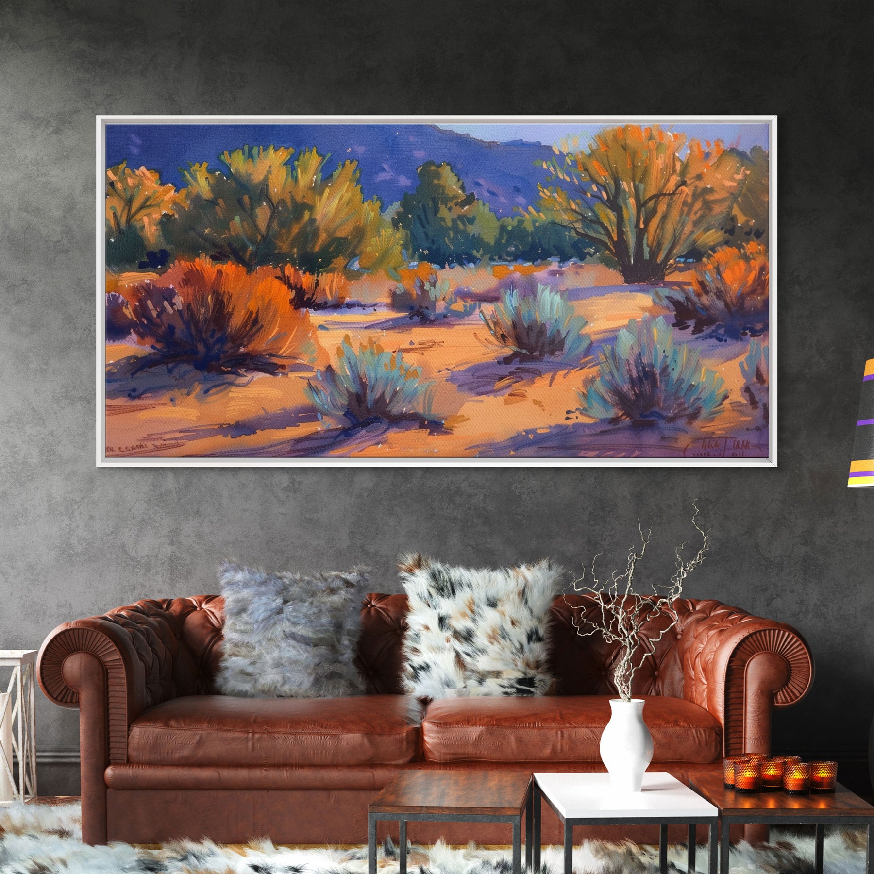 Colorful desert scene with distant mountains, Framed Canvas Print, ideal for minimalist living room, boho wall art decor