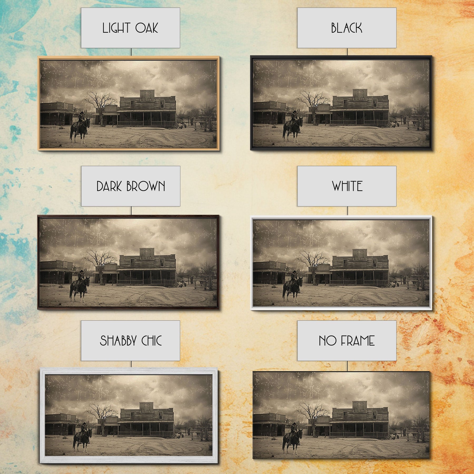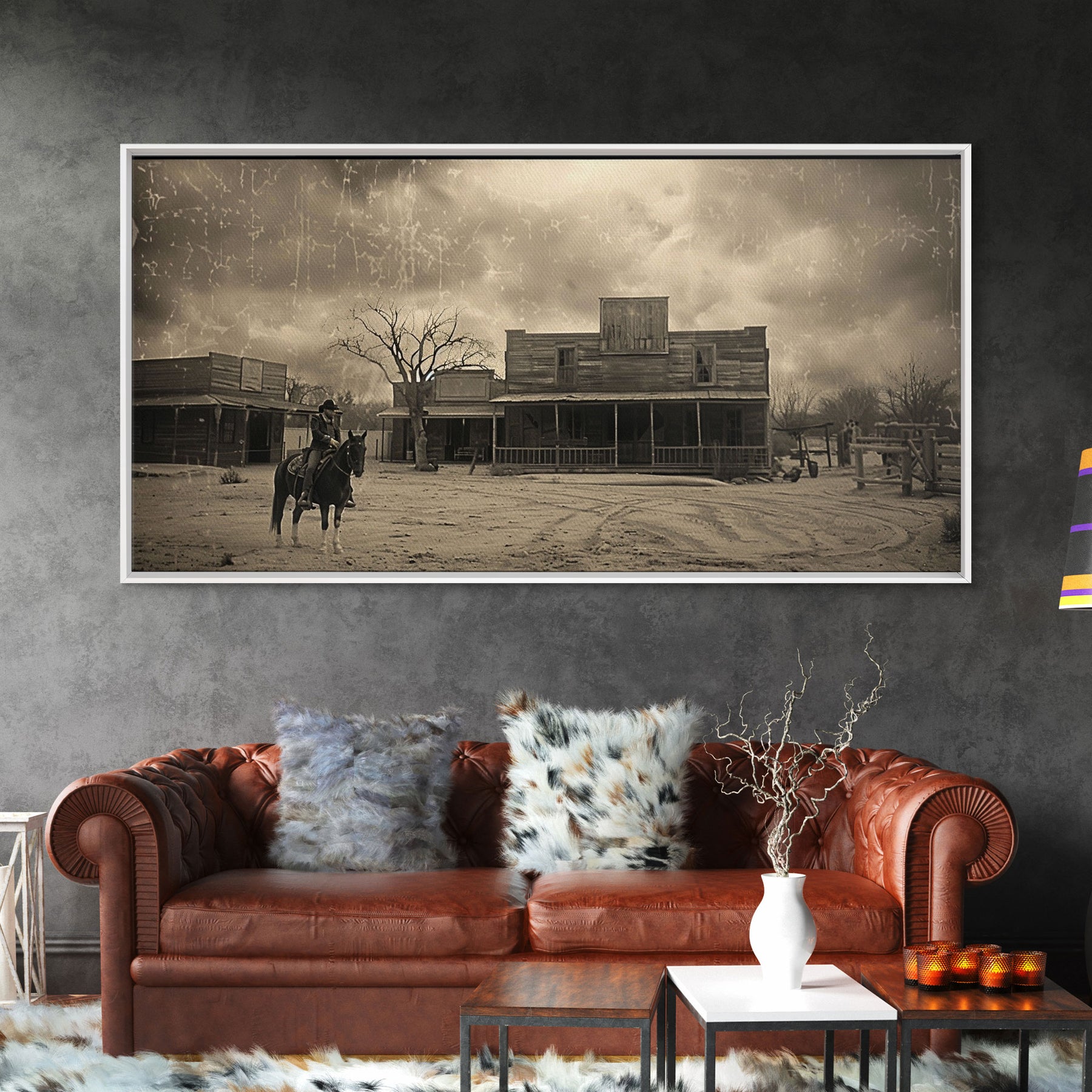 Cowboy Riding Through Old Western Town, Framed Canvas Print for Living Room Decor, Ideal Bedroom Wall Art, Vintage Western Scene