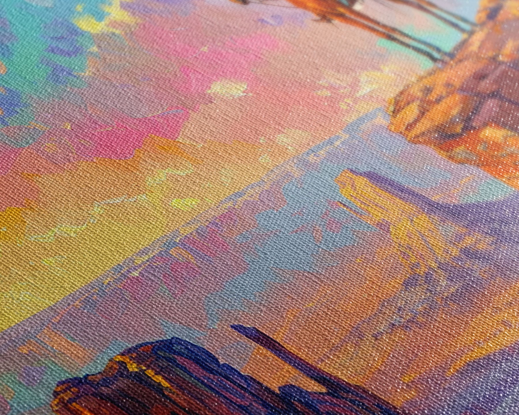 Most of our canvases are made in the USA, with the exception of canvases ordered with the light oak unstained frames, and any large canvases (24x48, 30x60, 16x48 and 20x60) ordered WITH a frame. These are temporarily made in and shipped from Europe, while we try to find a more consistent supplier in the USA.