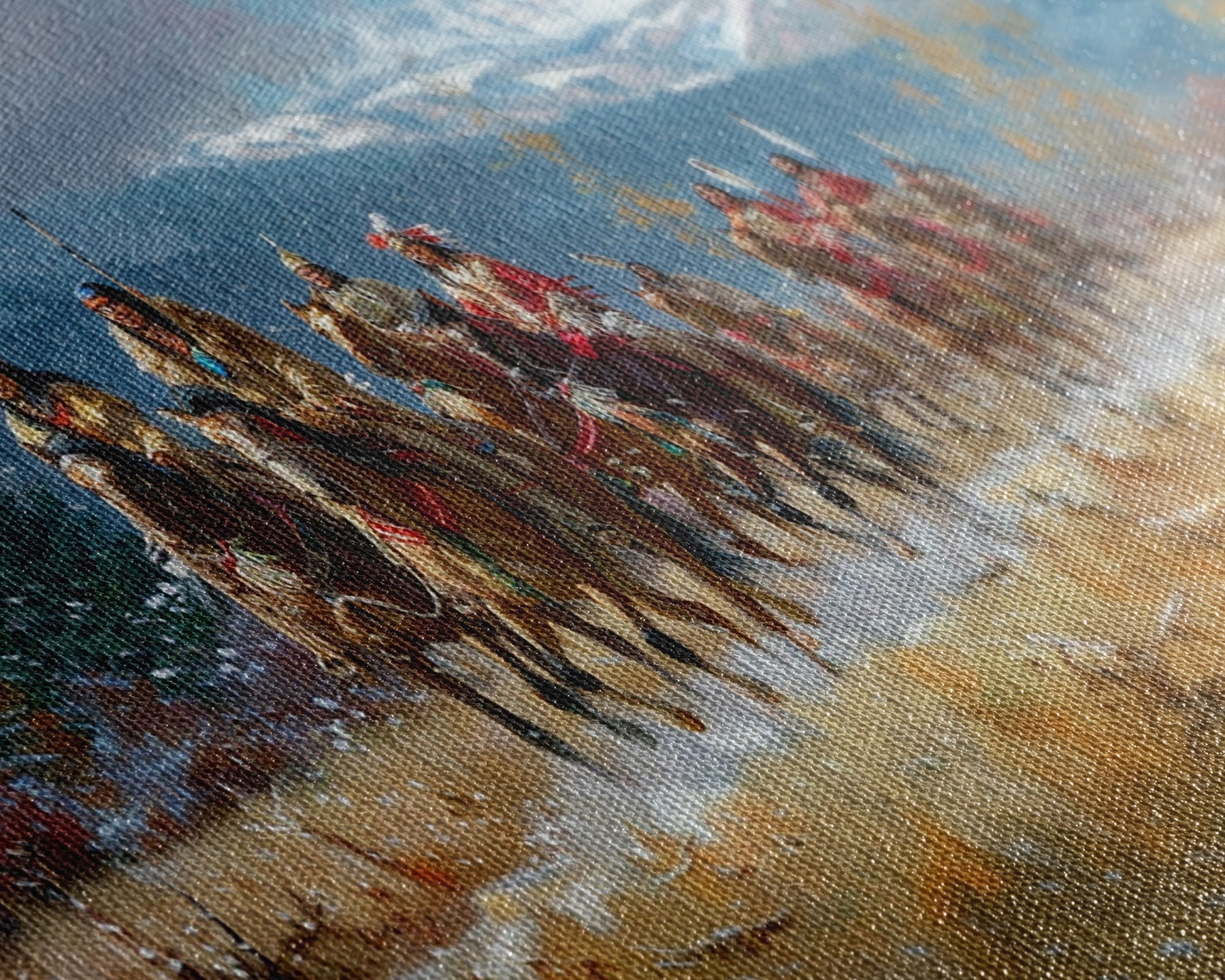 Most of our canvases are made in the USA, with the exception of canvases ordered with the light oak unstained frames, and any large canvases (24x48, 30x60, 16x48 and 20x60) ordered WITH a frame. These are temporarily made in and shipped from Europe, while we try to find a more consistent supplier in the USA.