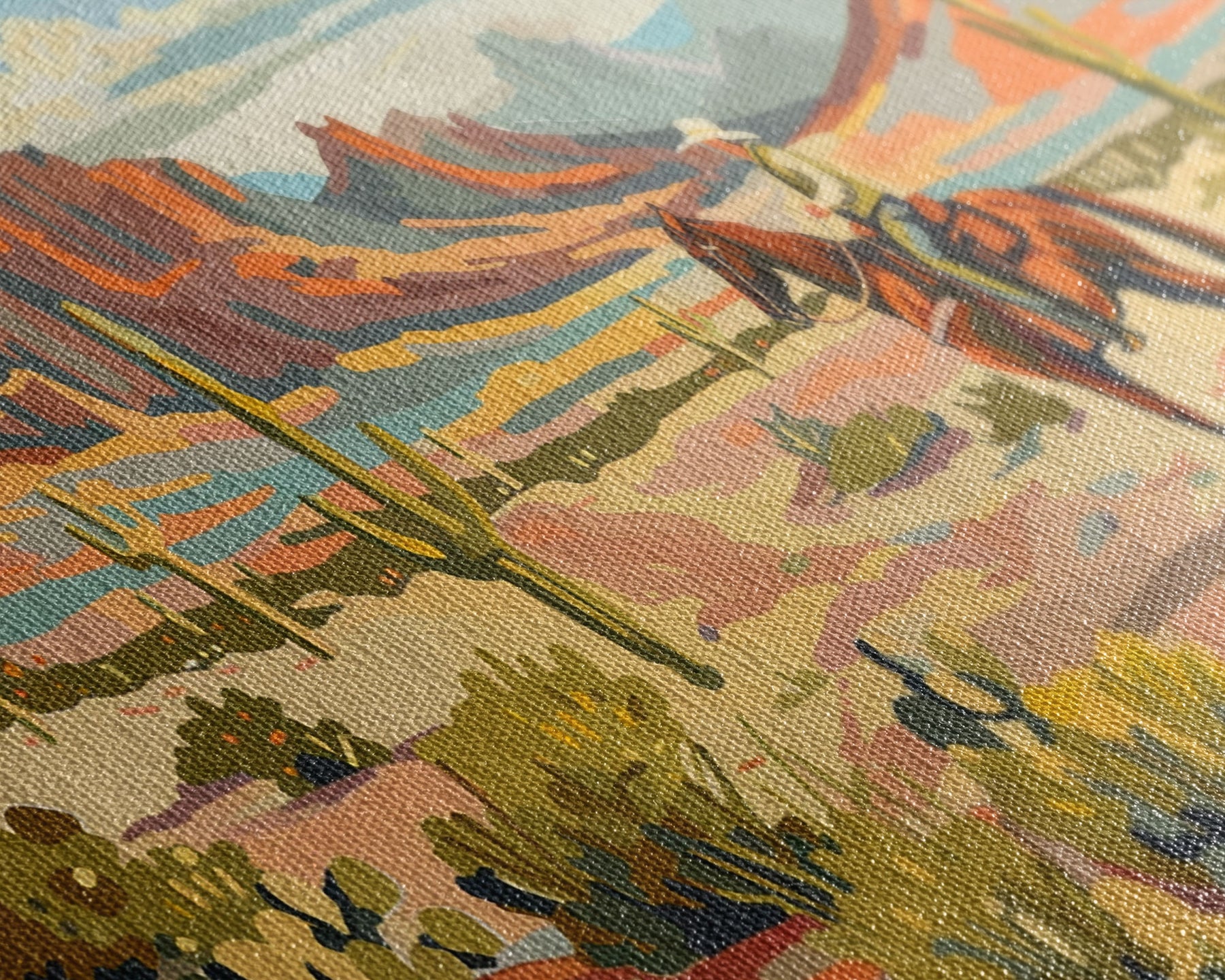 Most of our canvases are made in the USA, with the exception of canvases ordered with the light oak unstained frames, and any large canvases (24x48, 30x60, 16x48 and 20x60) ordered WITH a frame. These are temporarily made in and shipped from Europe, while we try to find a more consistent supplier in the USA.