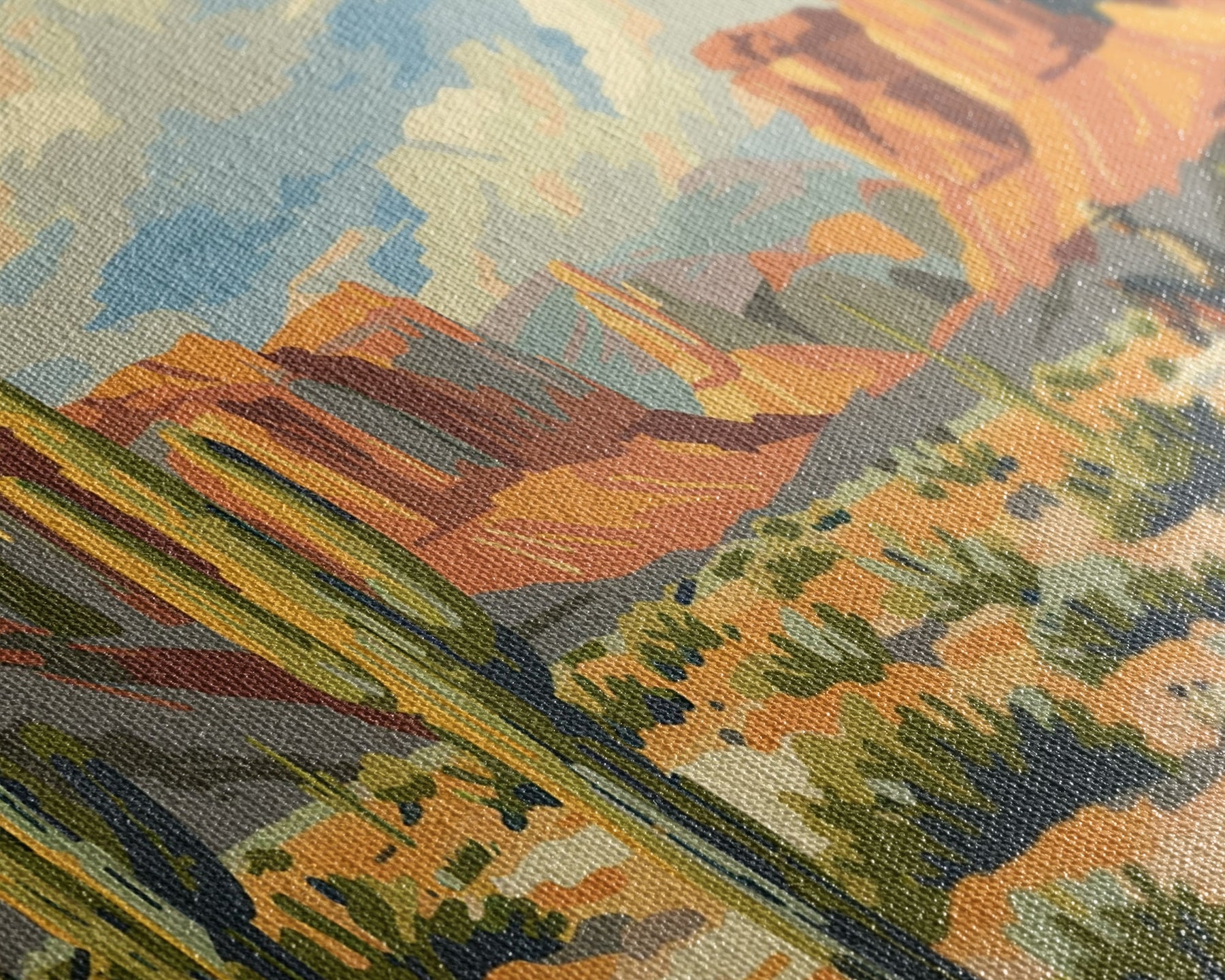 Most of our canvases are made in the USA, with the exception of canvases ordered with the light oak unstained frames, and any large canvases (24x48, 30x60, 16x48 and 20x60) ordered WITH a frame. These are temporarily made in and shipped from Europe, while we try to find a more consistent supplier in the USA.