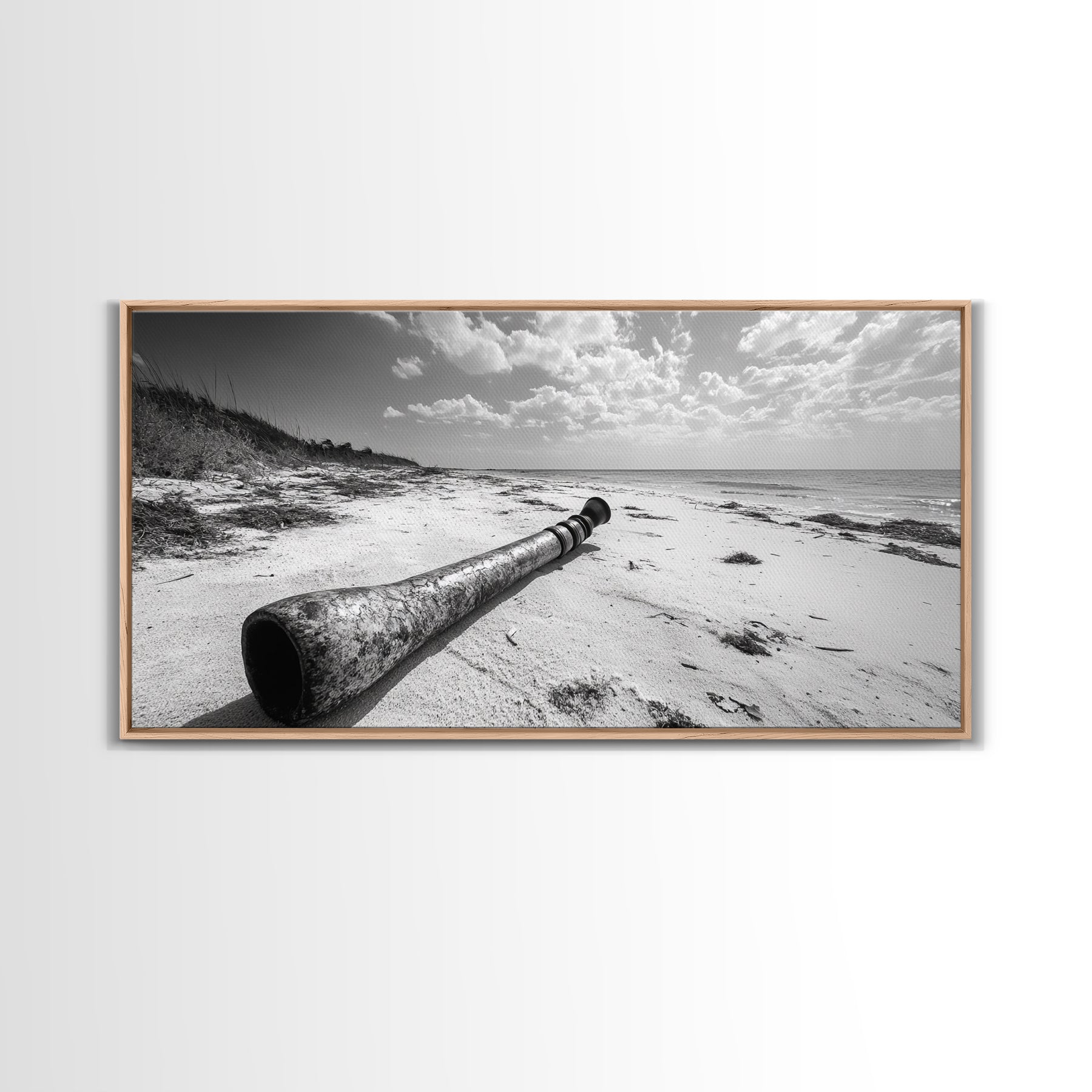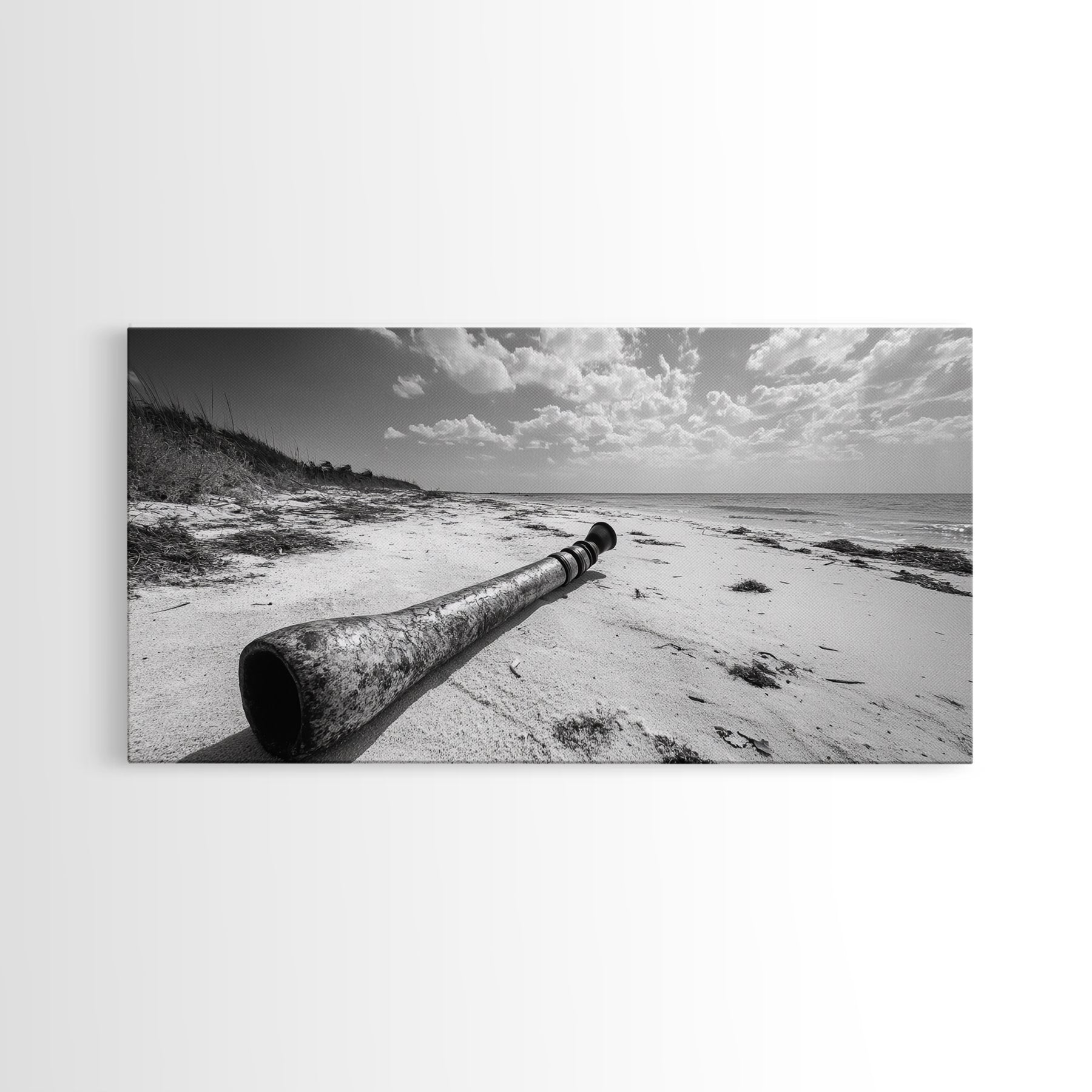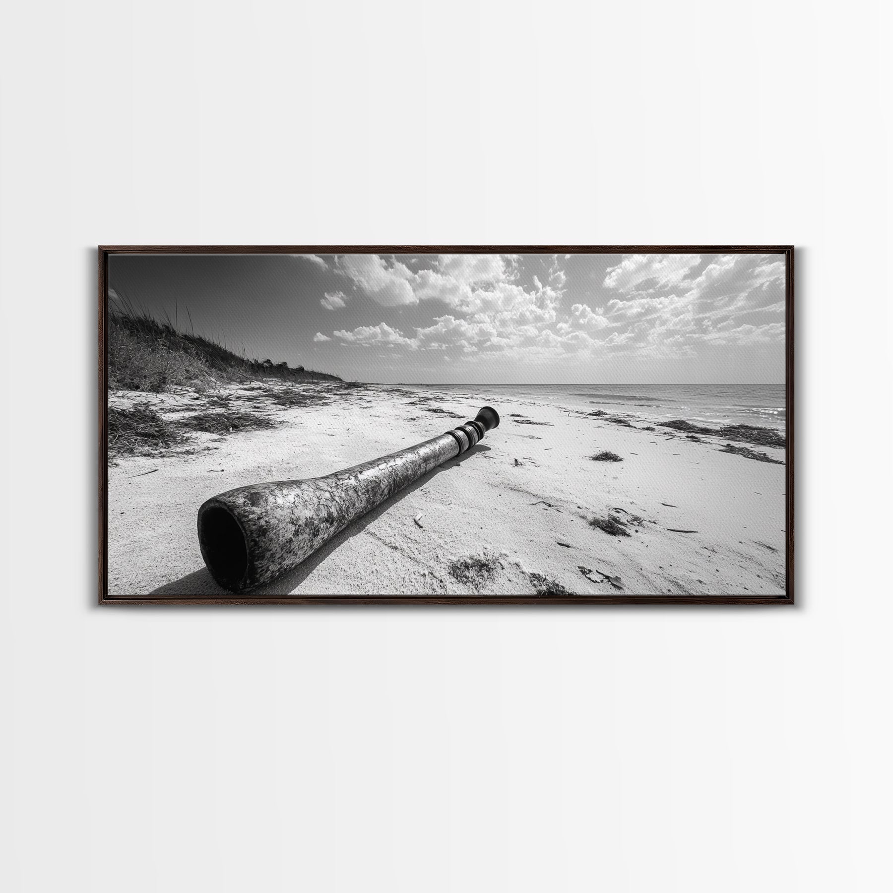 Abandoned Beach Pipe, Surreal Coastal Scene, Washed Ashore Photography, Framed Canvas Print, Moody Living Room or Fall Wall Art