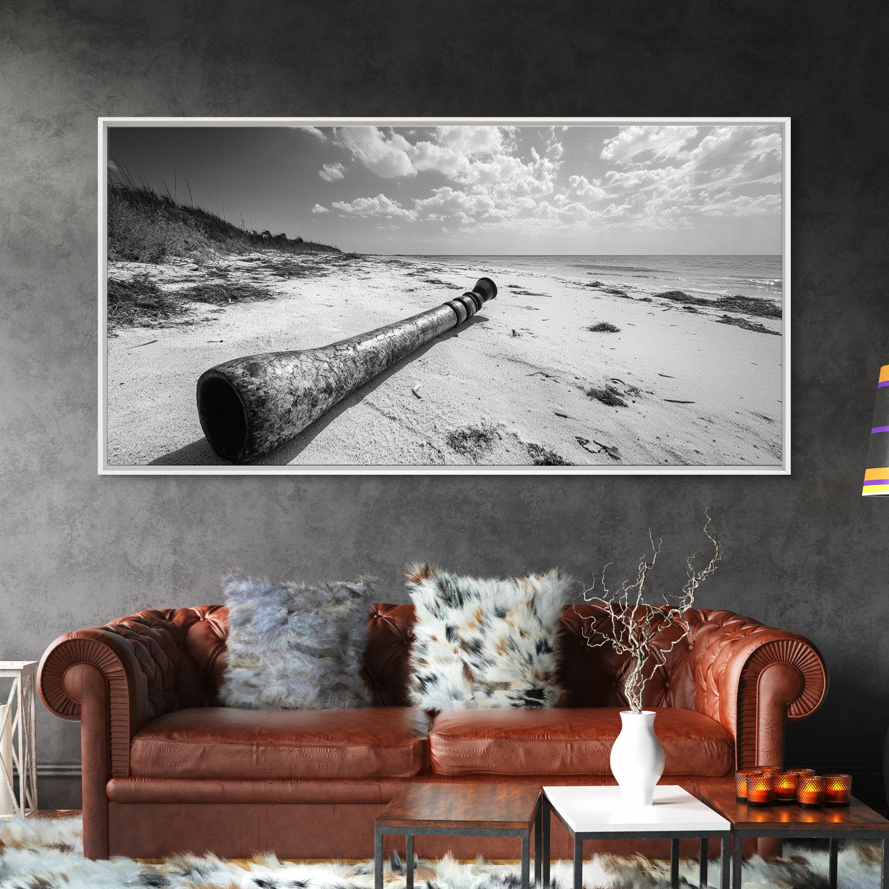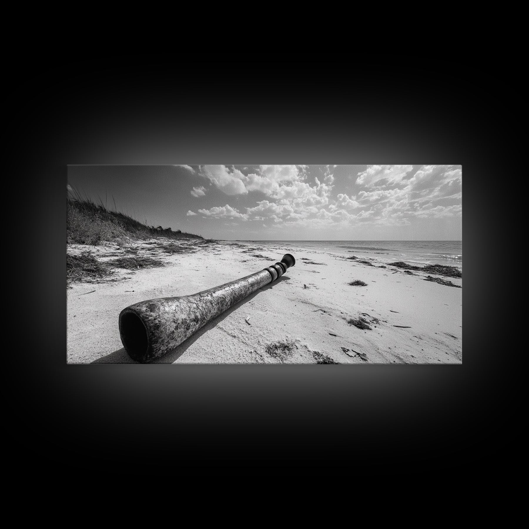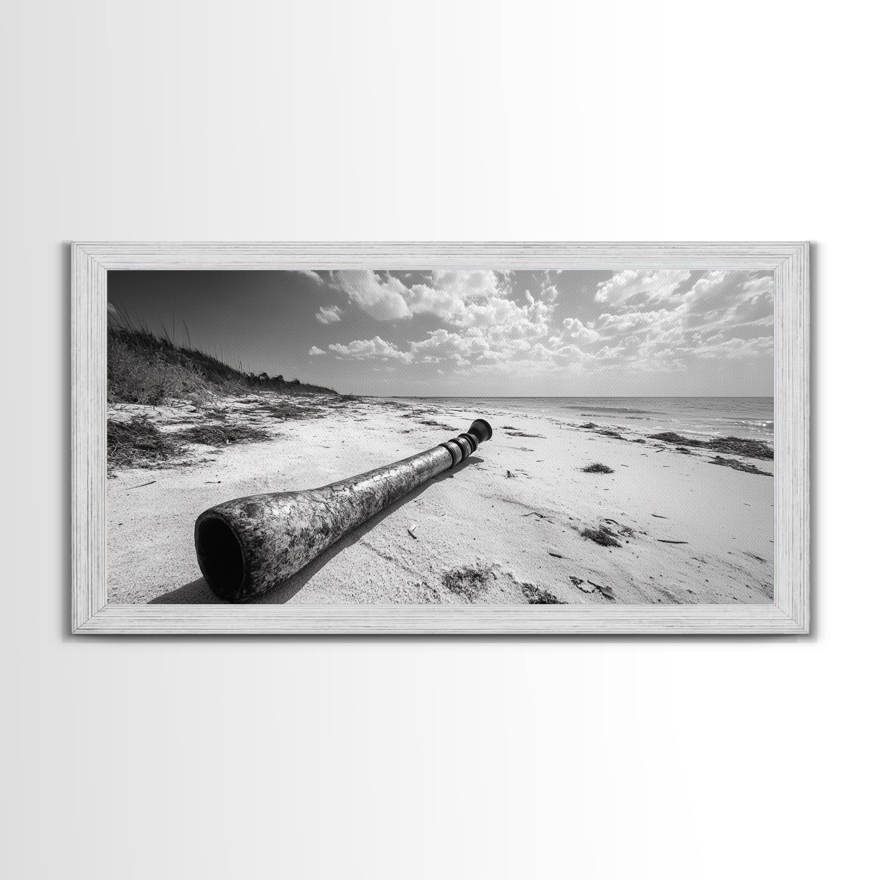 Abandoned Beach Pipe, Surreal Coastal Scene, Washed Ashore Photography, Framed Canvas Print, Moody Living Room or Fall Wall Art