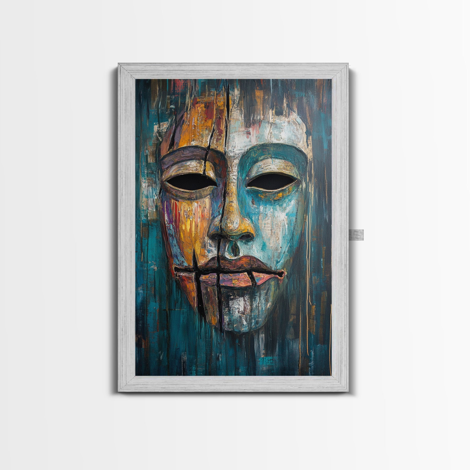 Abstract Mask Art Framed Canvas Print Ethnic Wall Decor Tribal Face Artwork Modern Expressionist Painting Boho Home Aesthetic Living Room