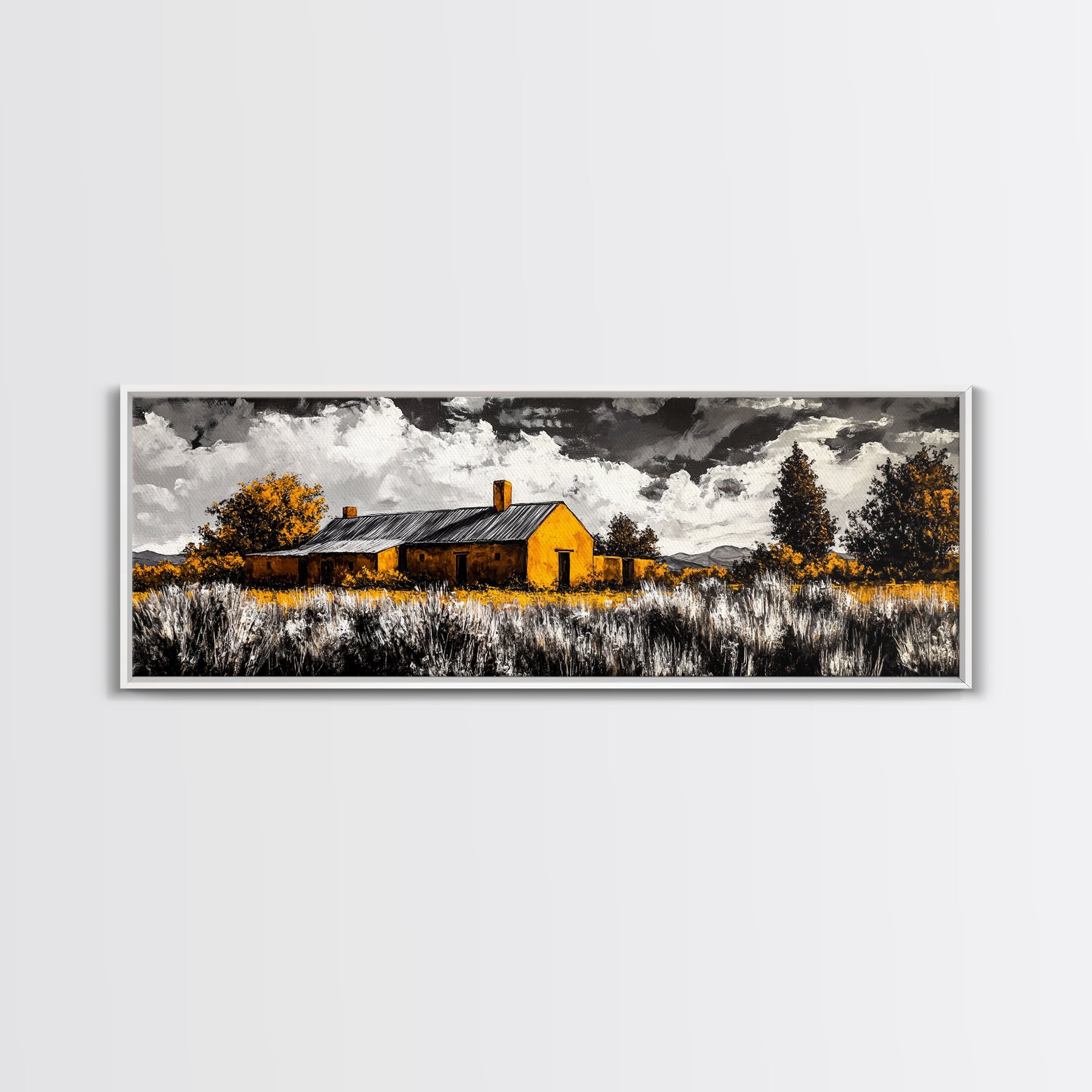 Adobe House, southwest wall art, rustic decor, farmhouse art, warm tones, panoramic art, moody art, extra wide art, framed canvas print