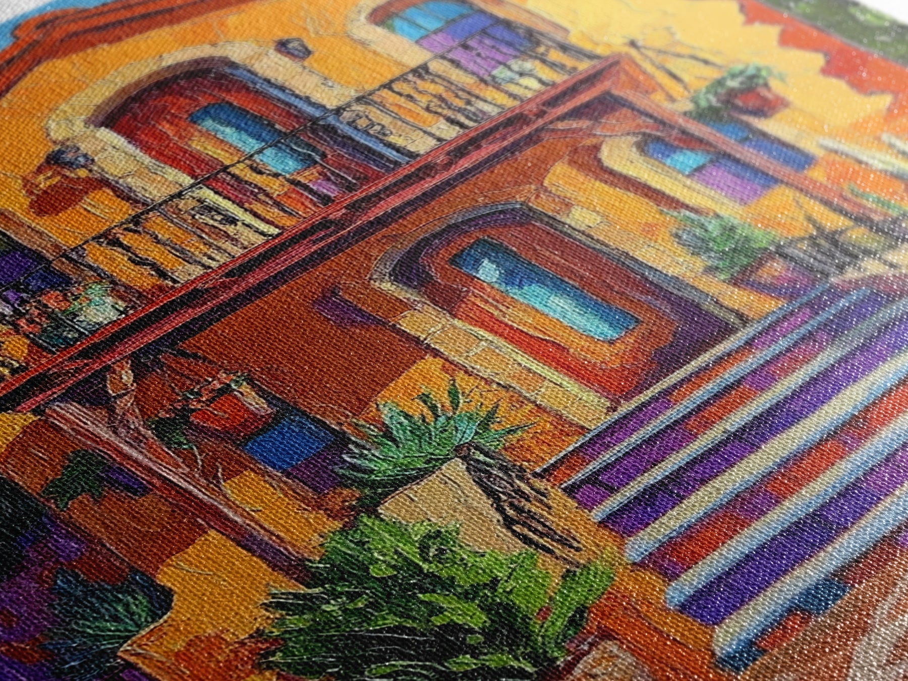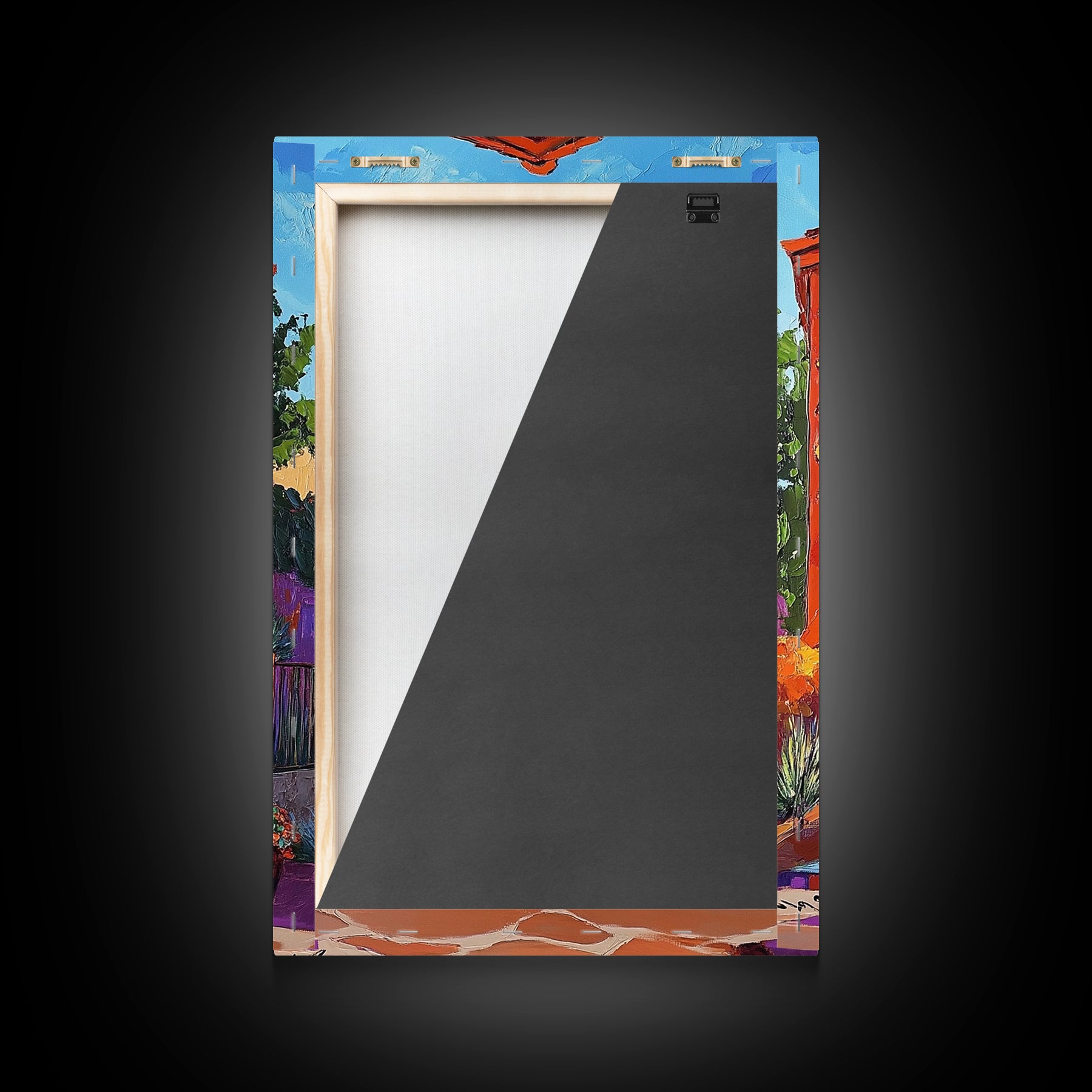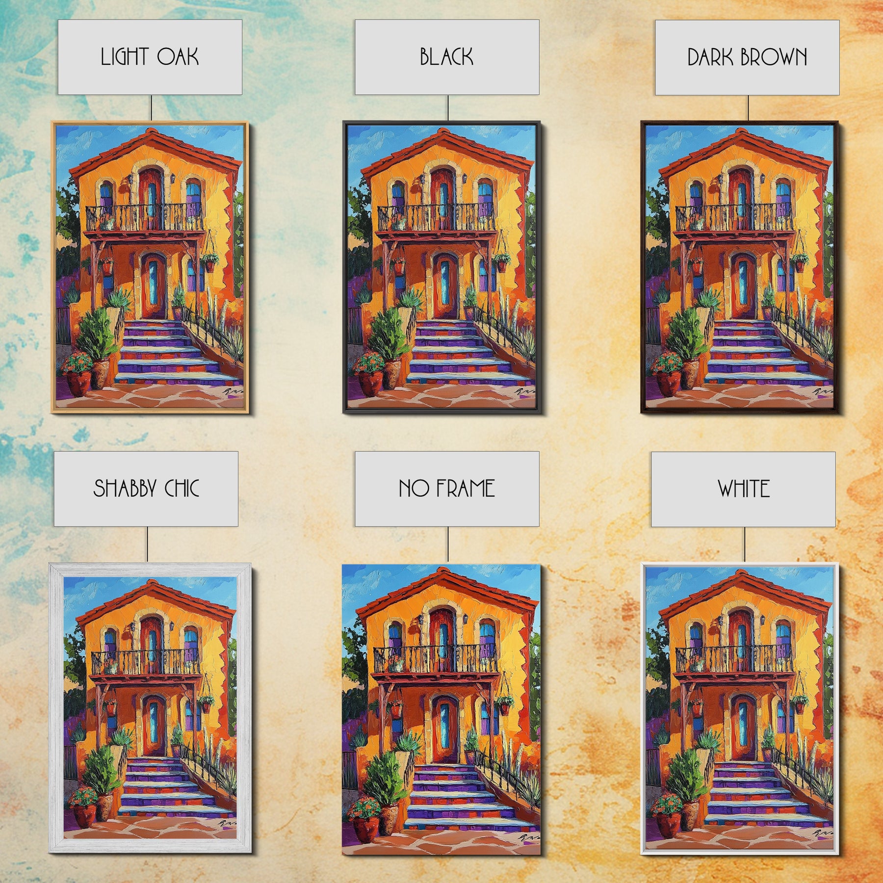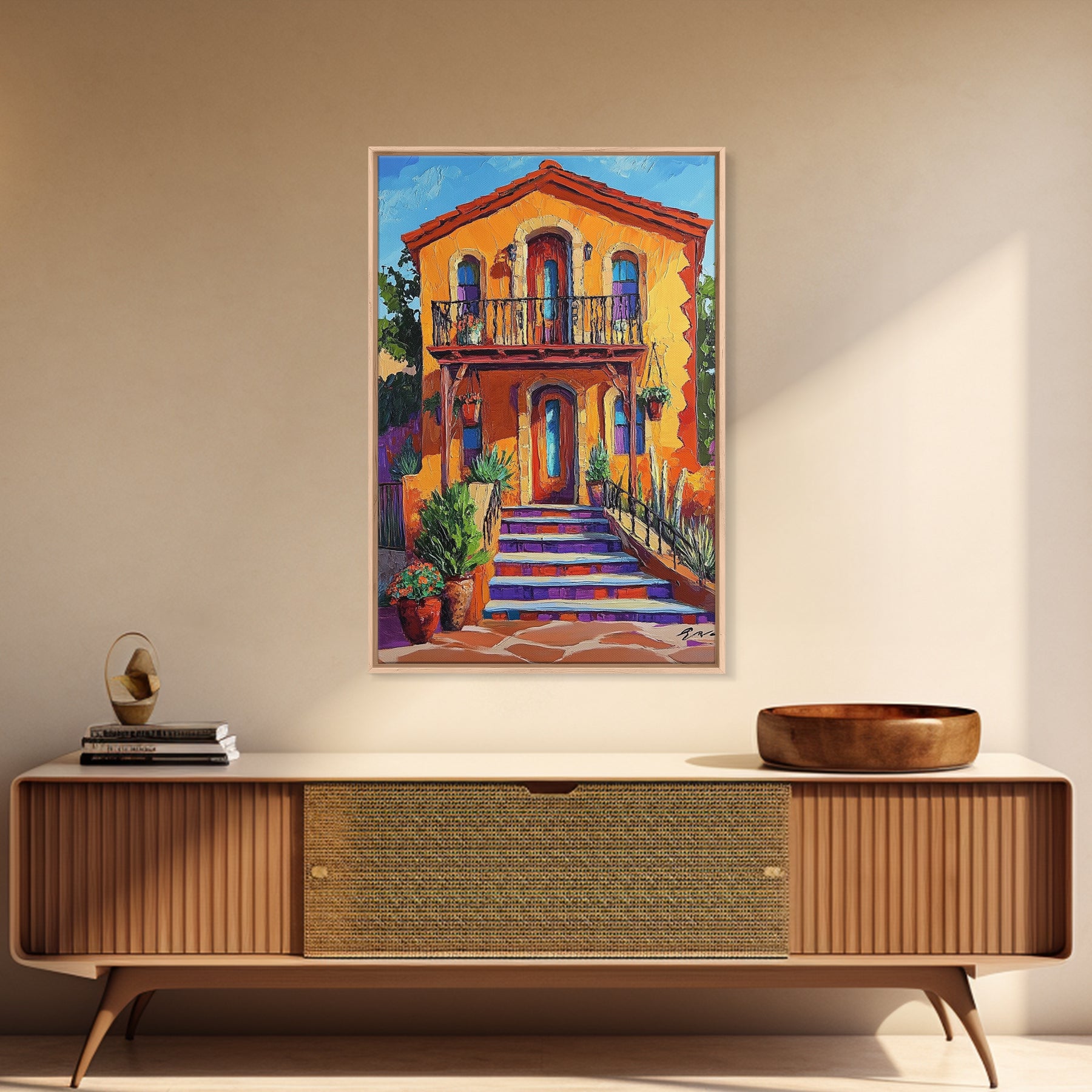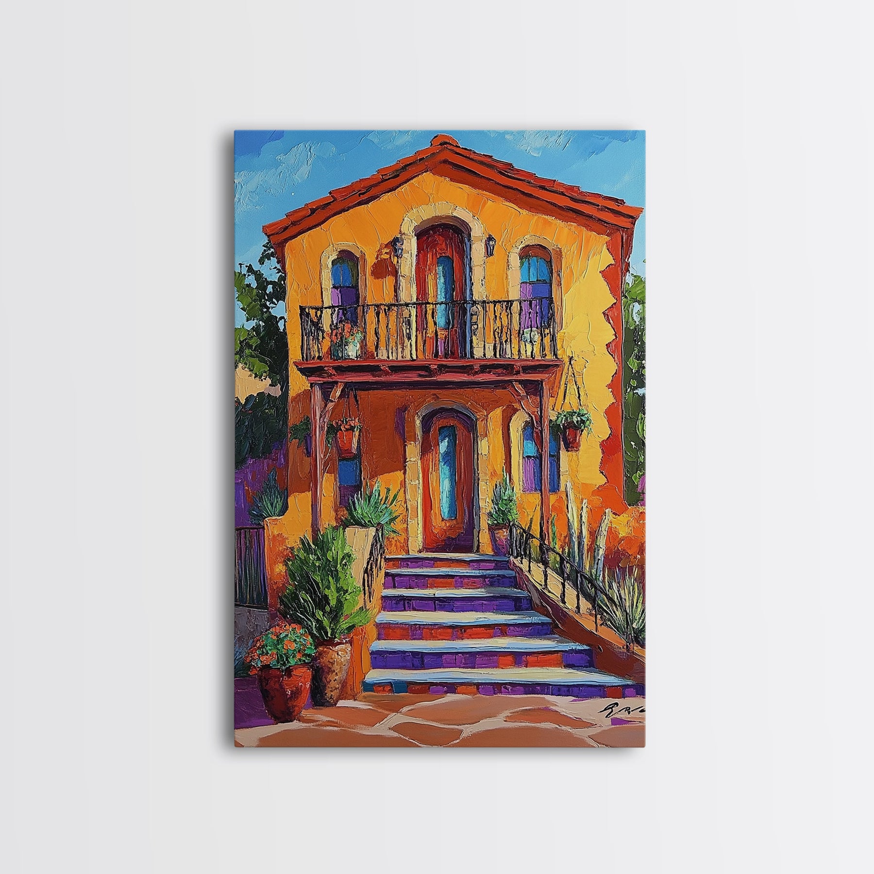 Adobe House, Vibrant Southwest, Fall Architecture Wall Art, Canvas Print, Rustic Staircase Scene, Boho Living Room Decor, Warm Entryway Art