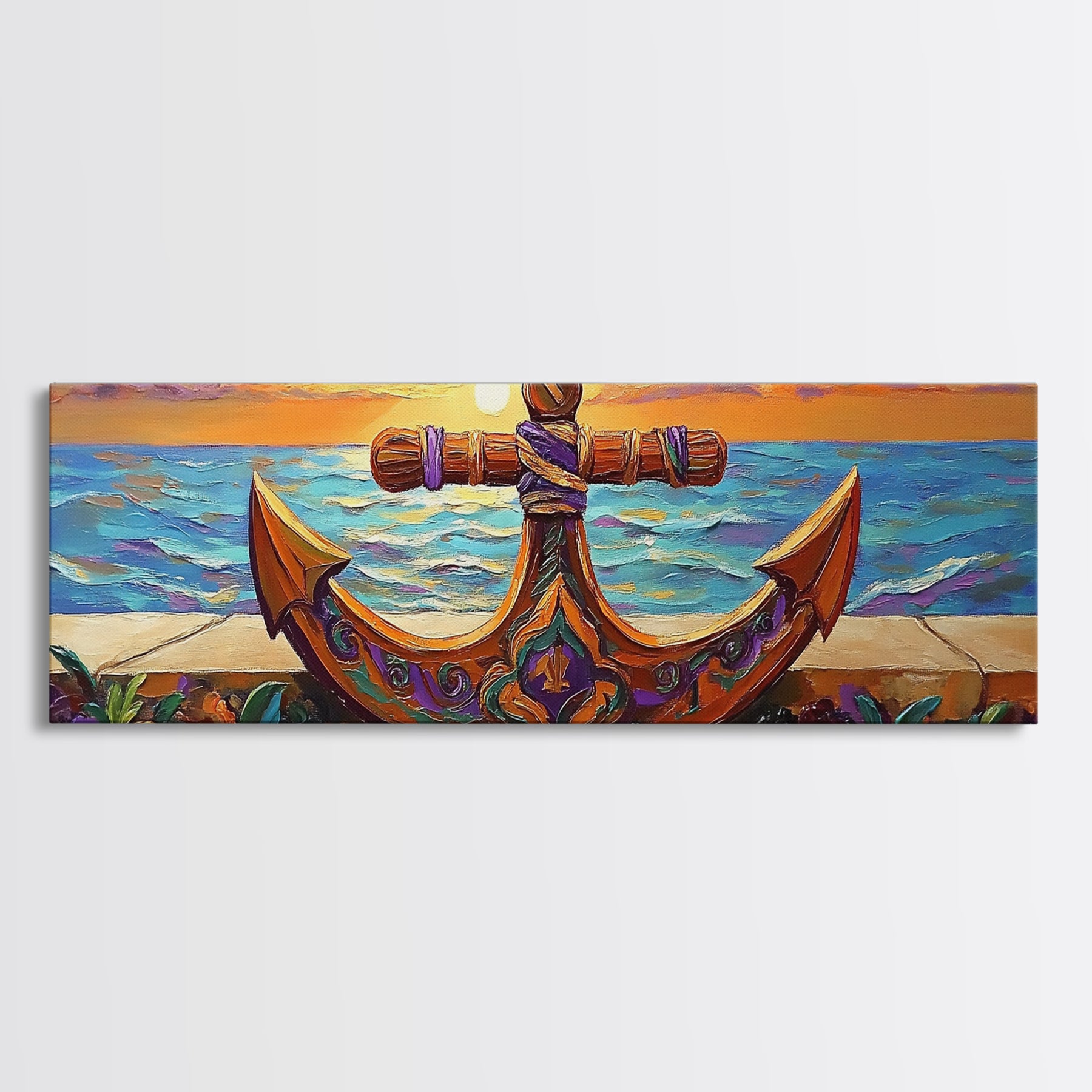 Anchor Seaside Art, Nautical Sunset, Framed Canvas Print, Coastal Home Decor, Ocean Lover Gift, Beach Living Room Wall Art