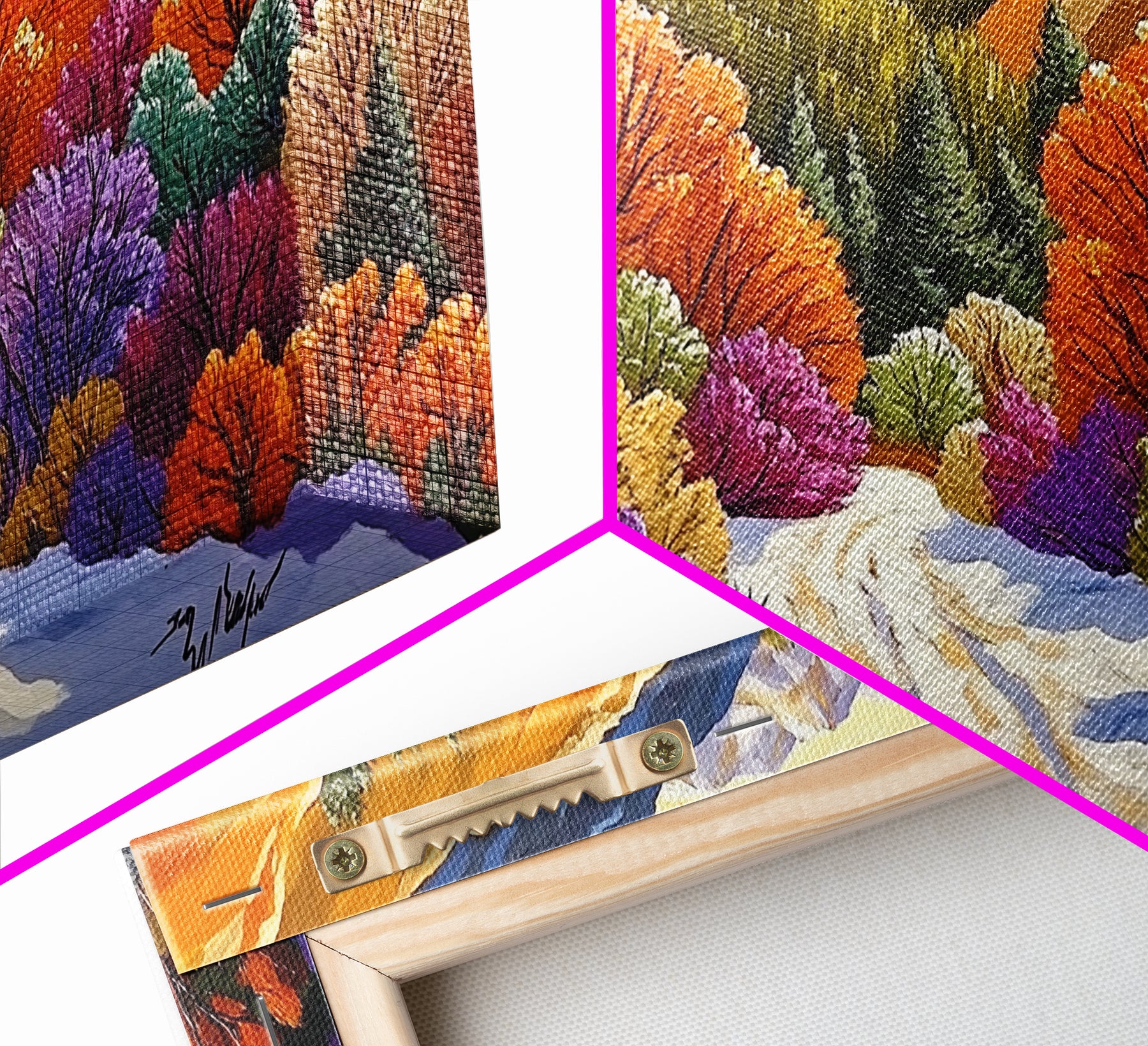 Autumn Forest, Snow, Trail, Canvas Print, Fall landscape painting, cabin wall decor, cozy mountain art, vibrant rustic hallway print