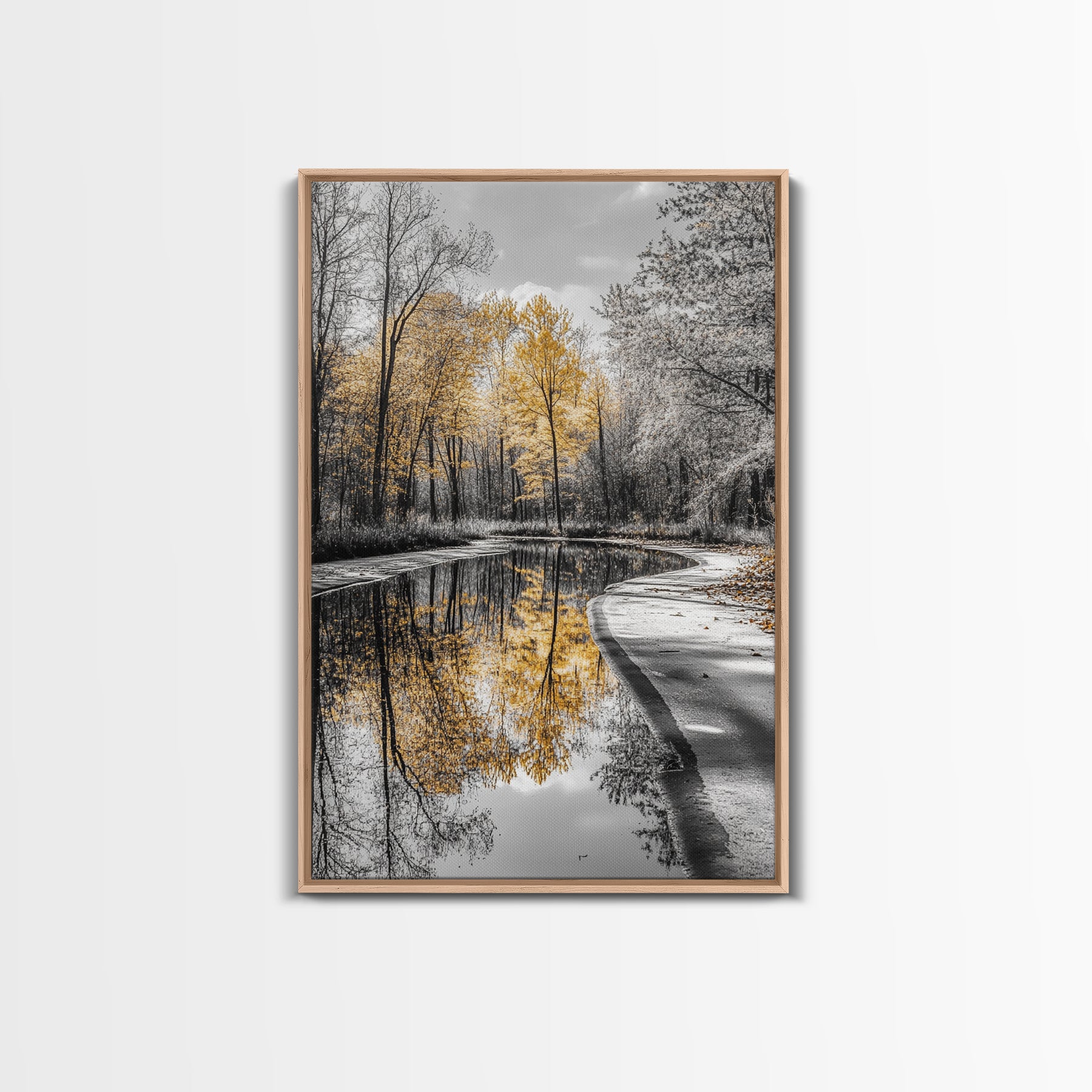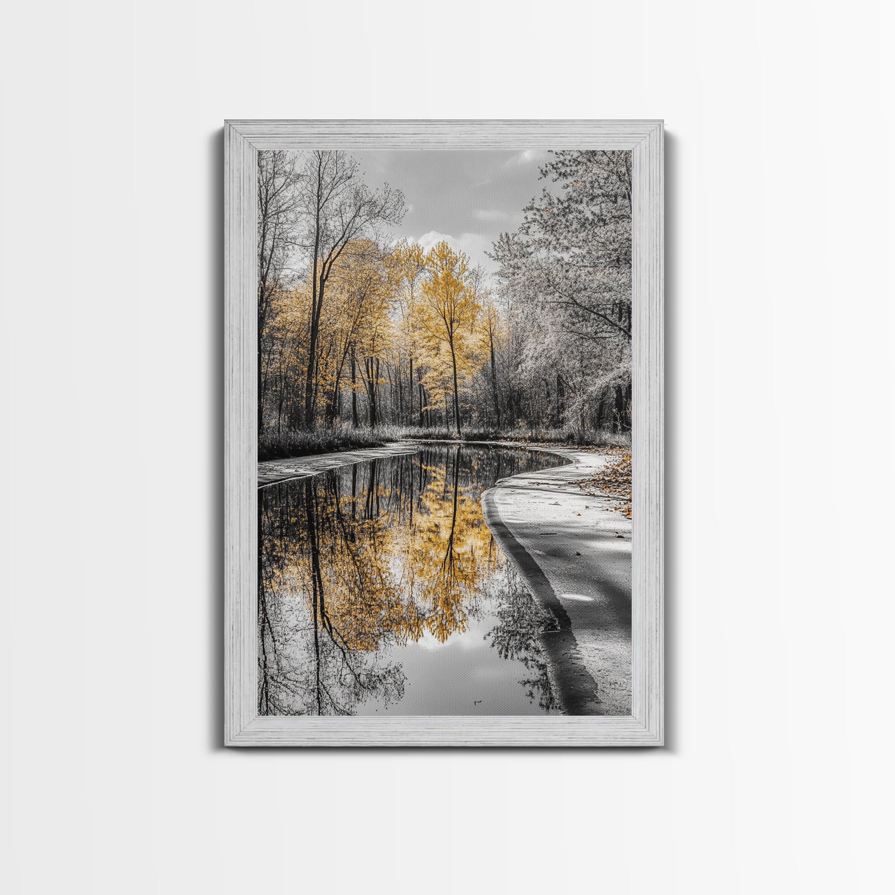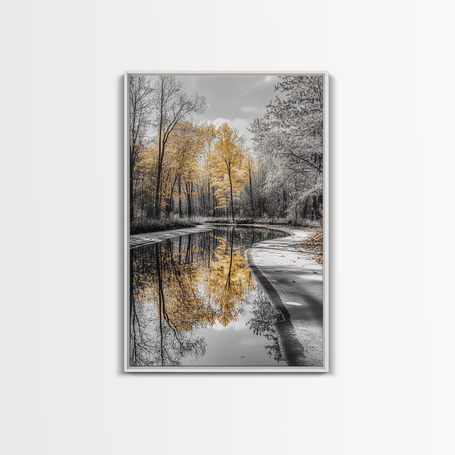 Autumn Trees, Yellow Reflection, Calm River, Nature Path, Framed Canvas Print fall landscape wall art, minimalist forest photography