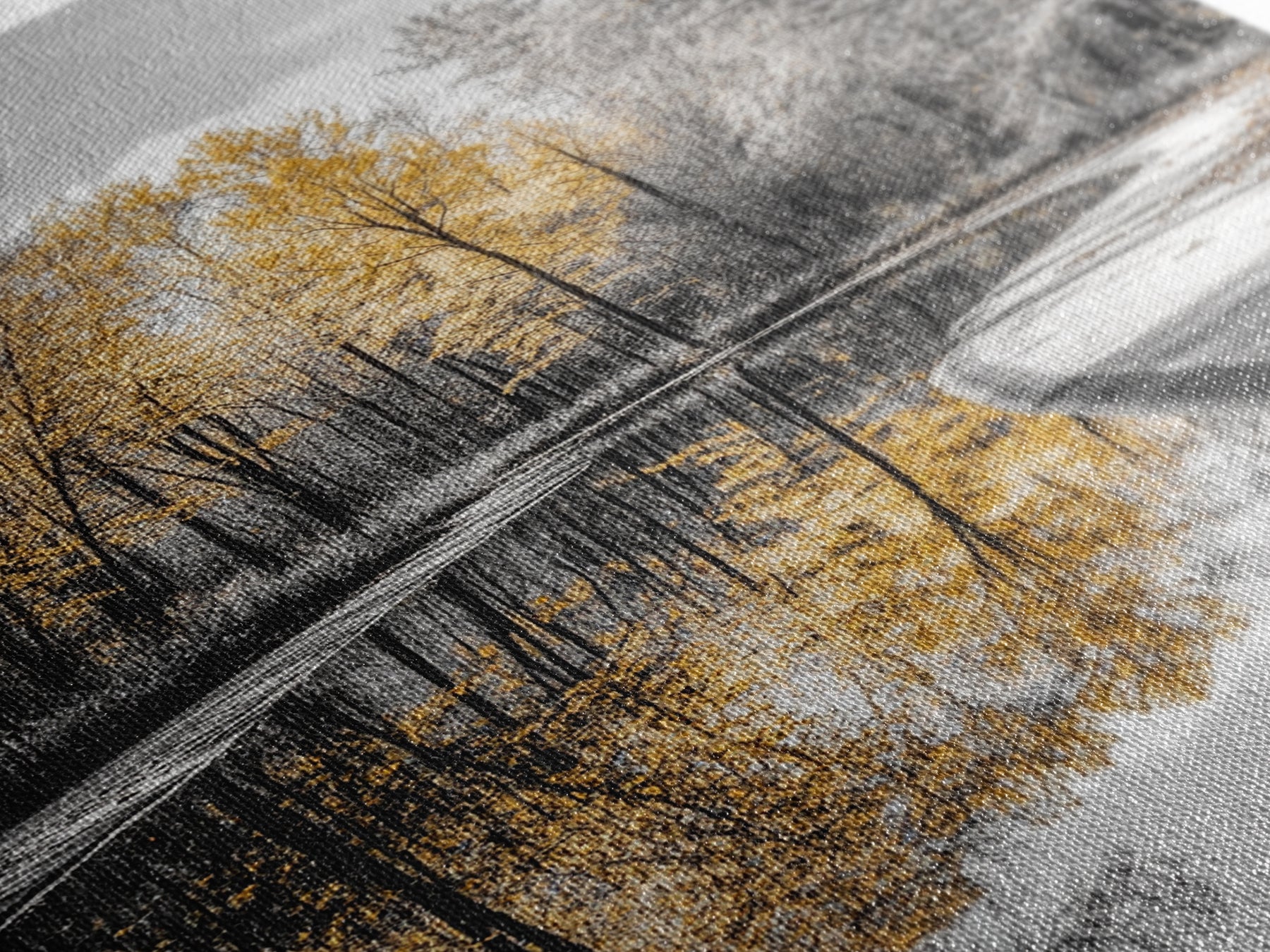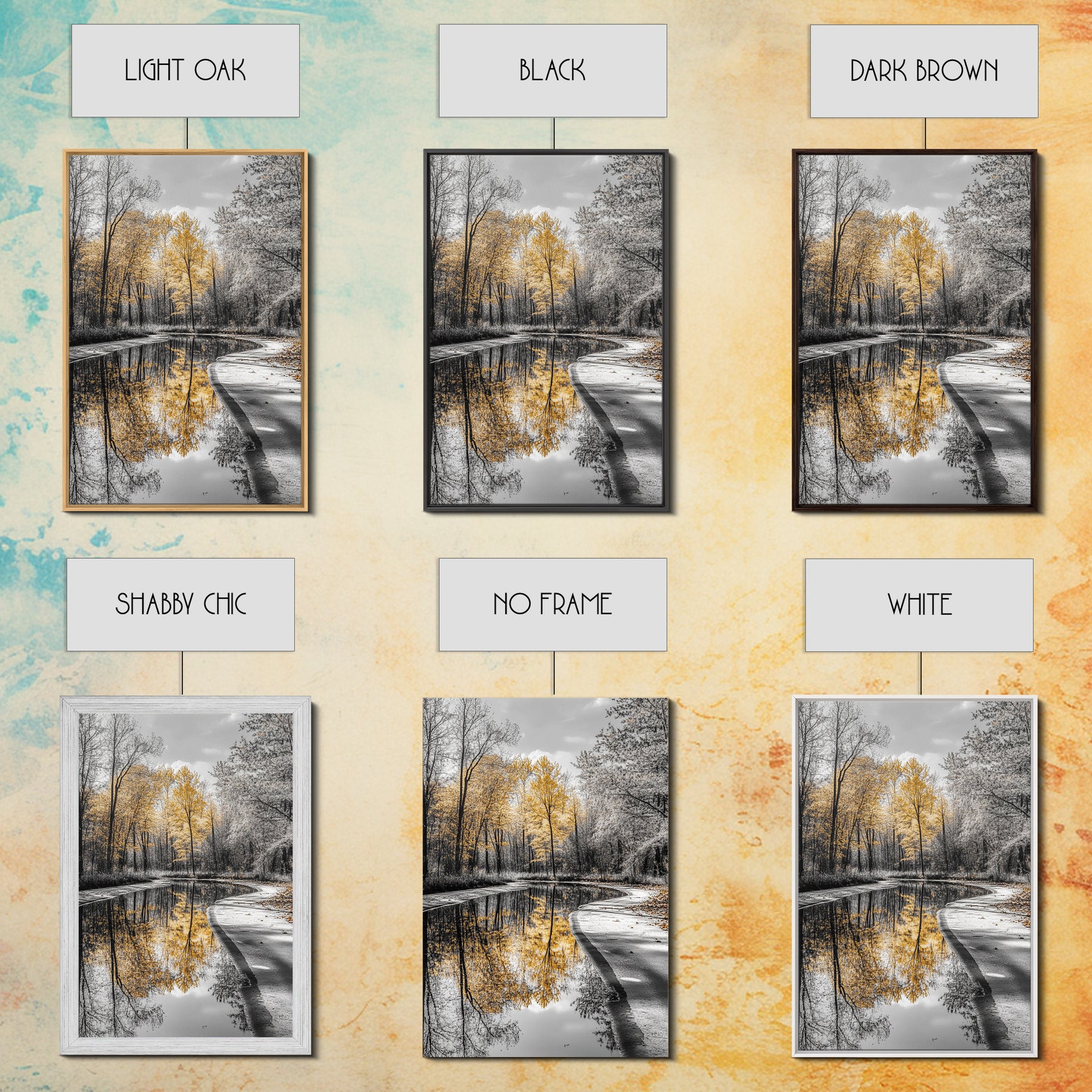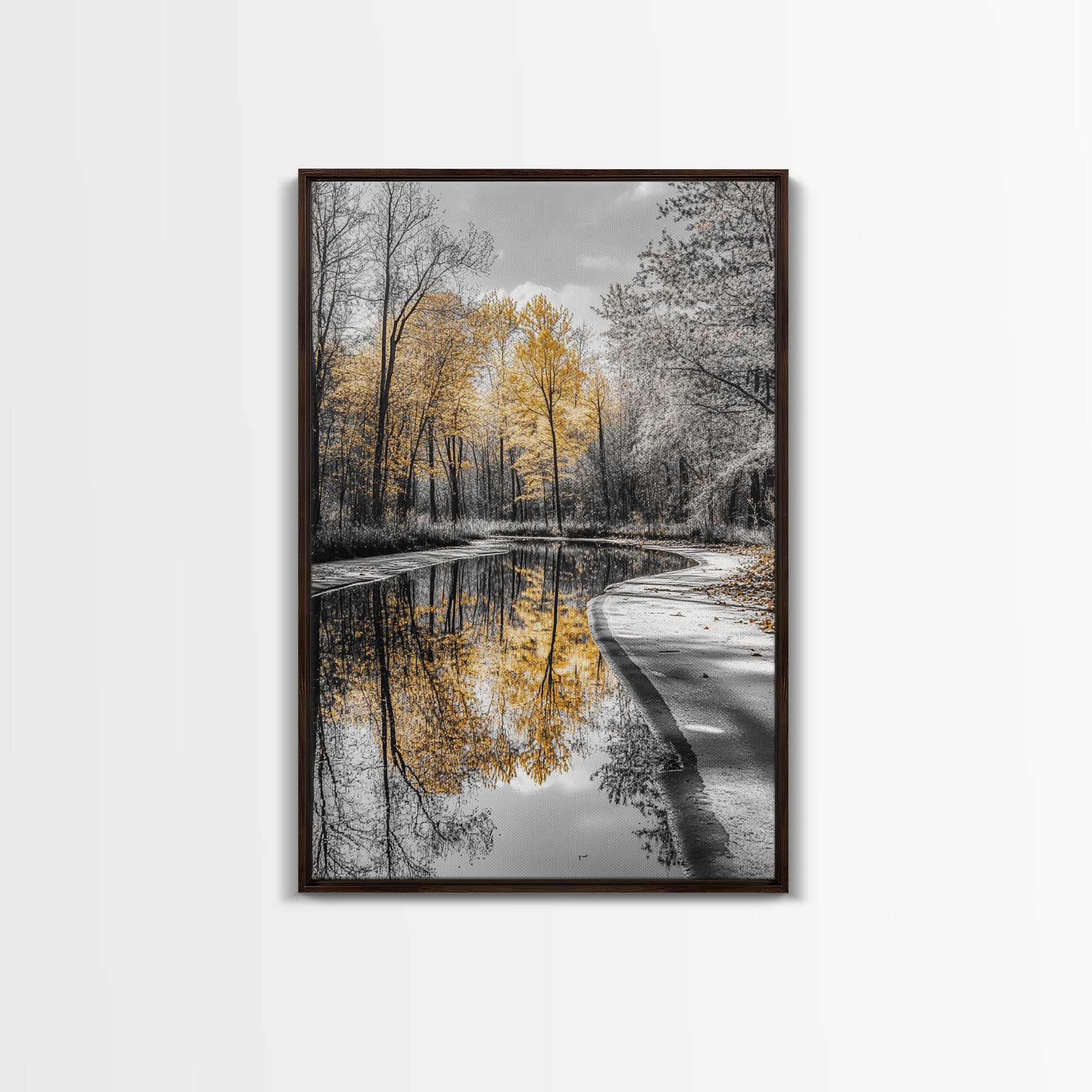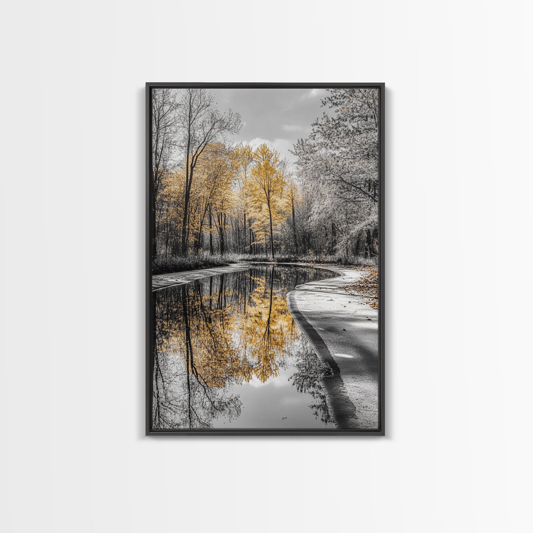 Autumn Trees, Yellow Reflection, Calm River, Nature Path, Framed Canvas Print fall landscape wall art, minimalist forest photography