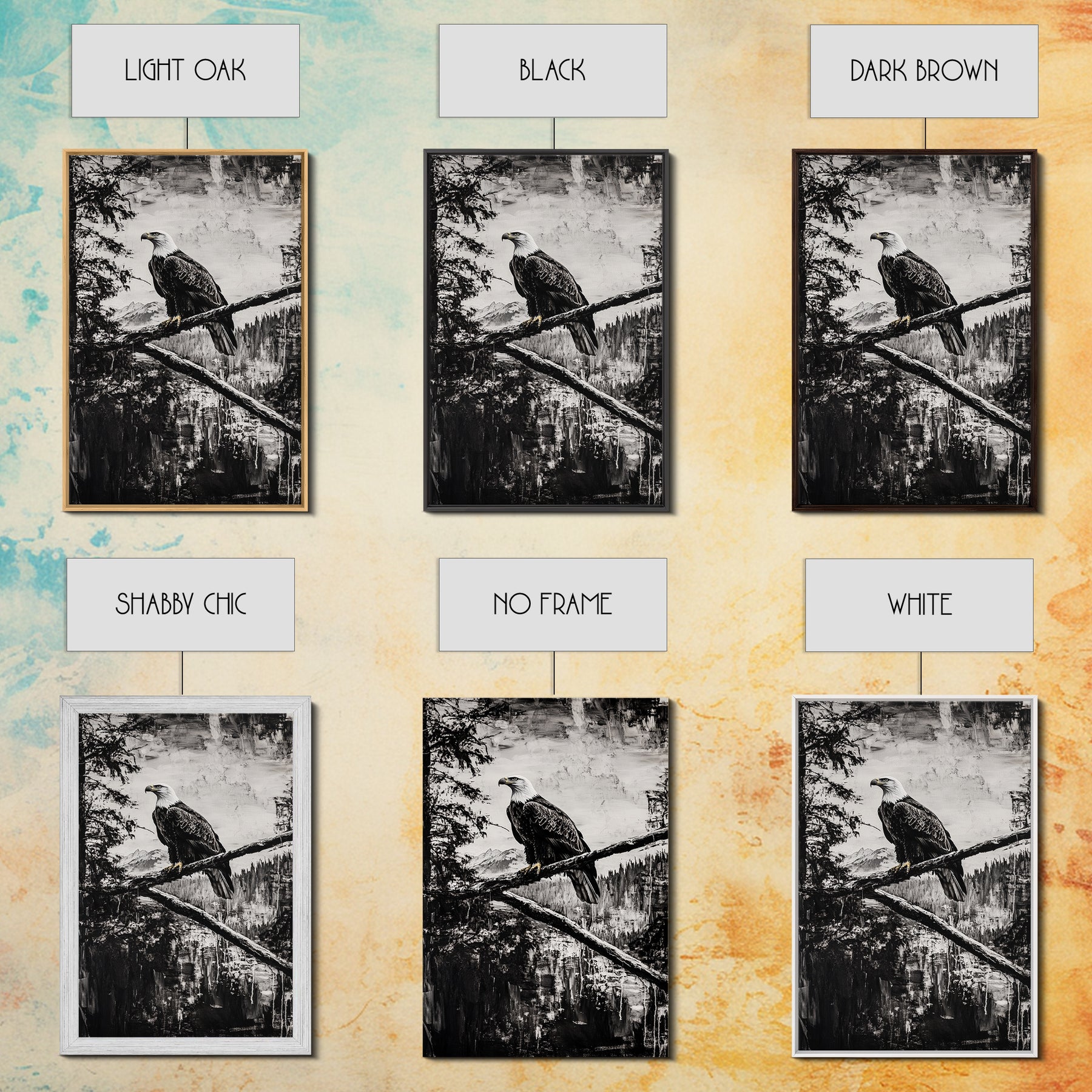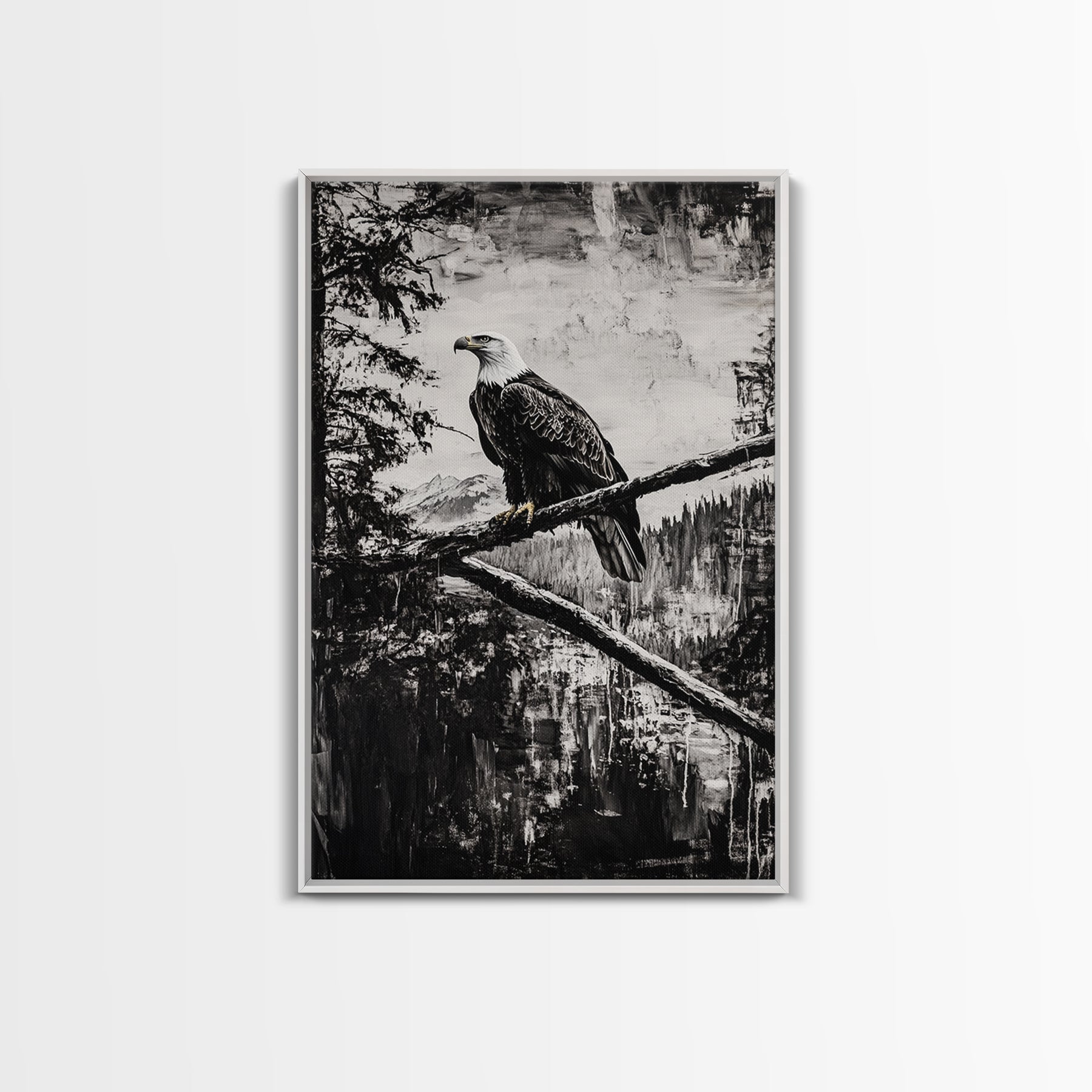 Bald Eagle, majestic bird, black and white, rustic decor, wildlife painting, nature art, framed canvas print, farmhouse wall art